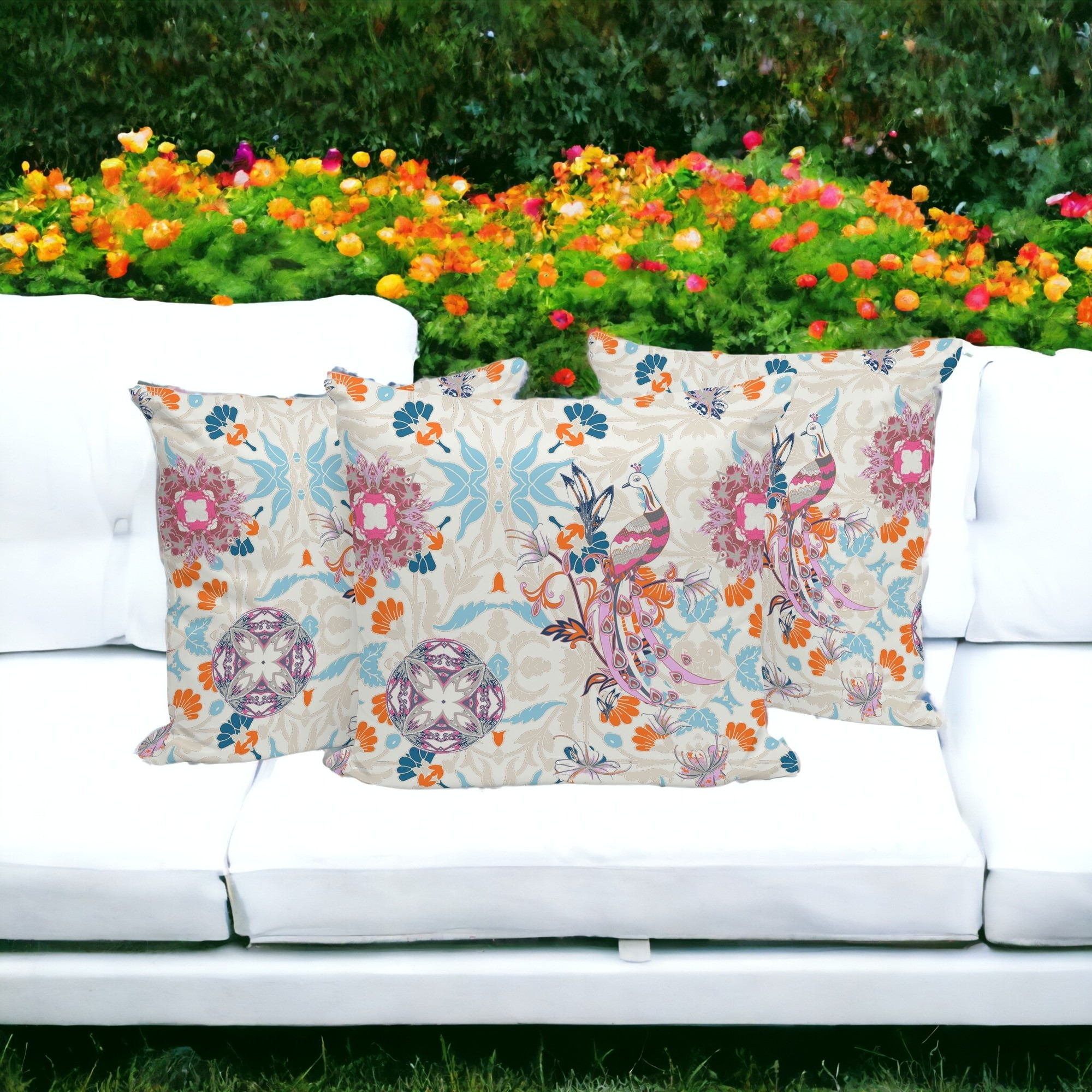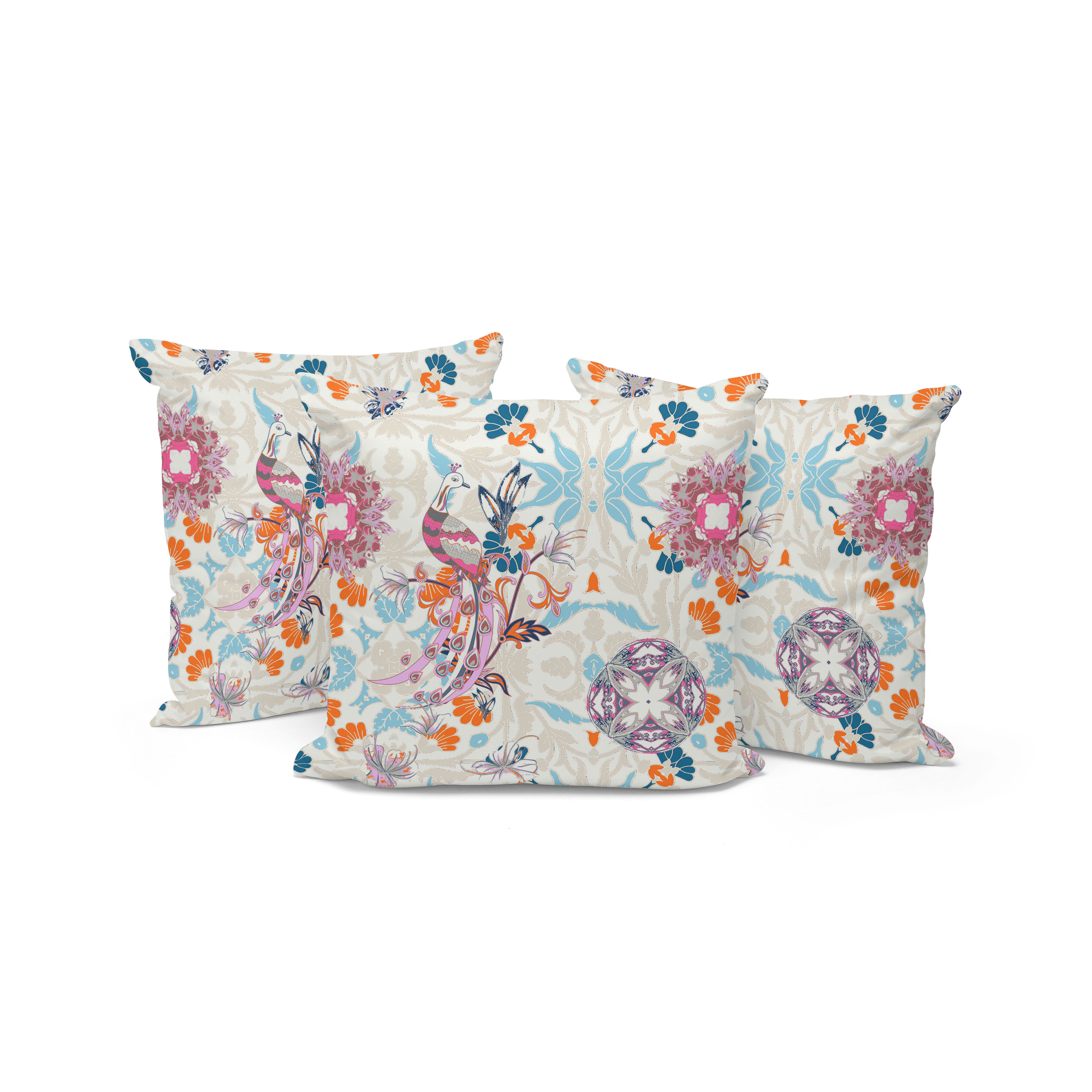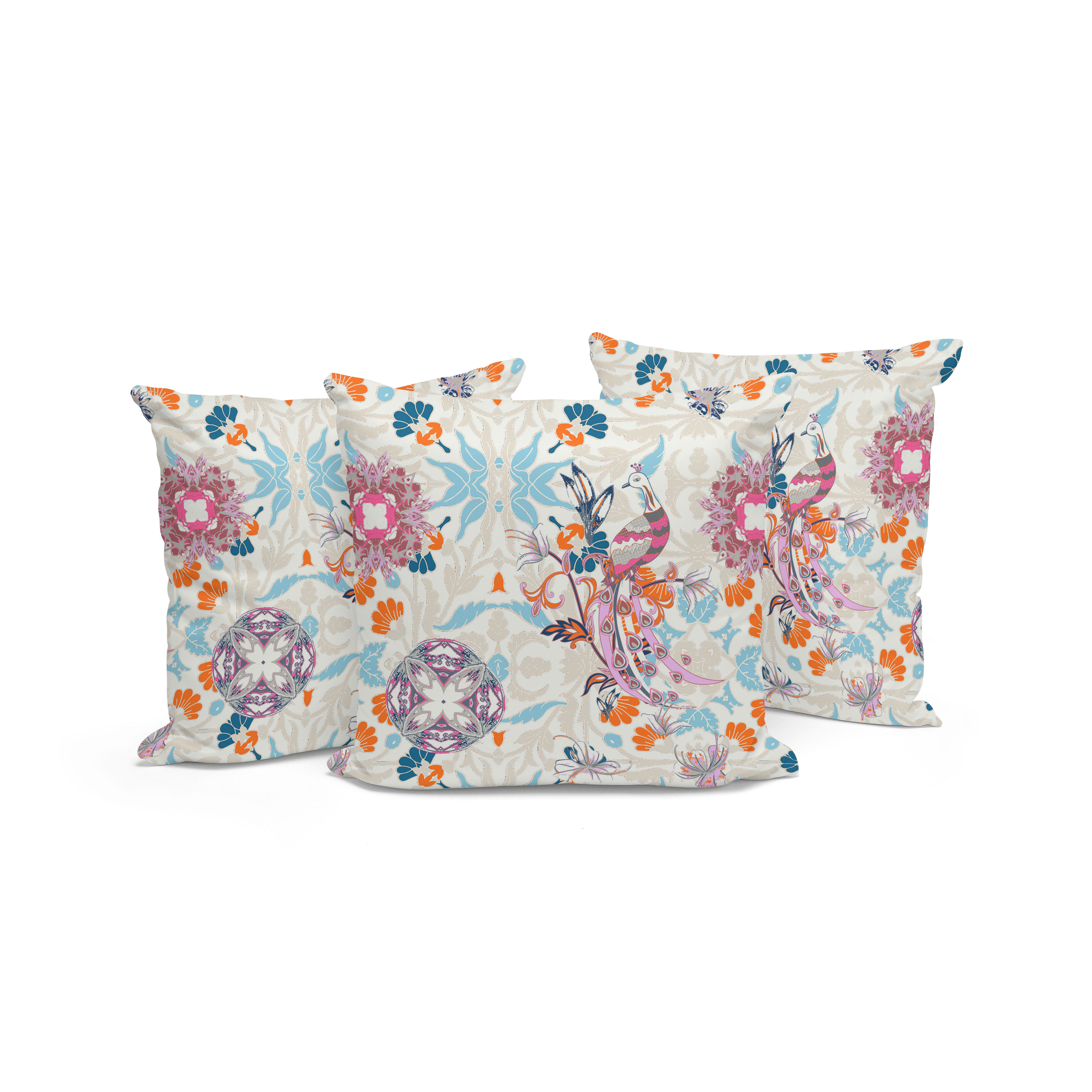 Set of Three Off White Peacock Abstract Indoor Outdoor Throw Pillow