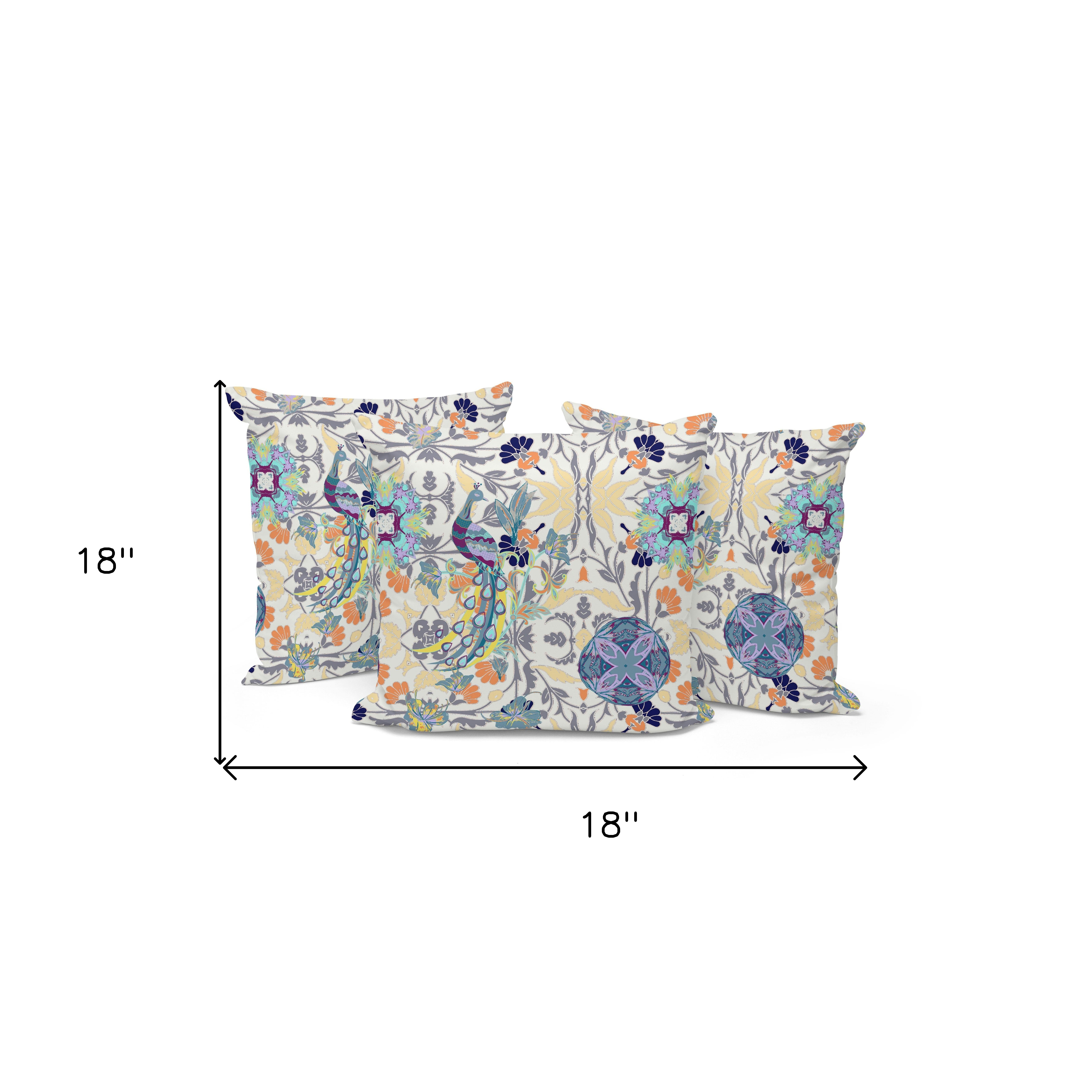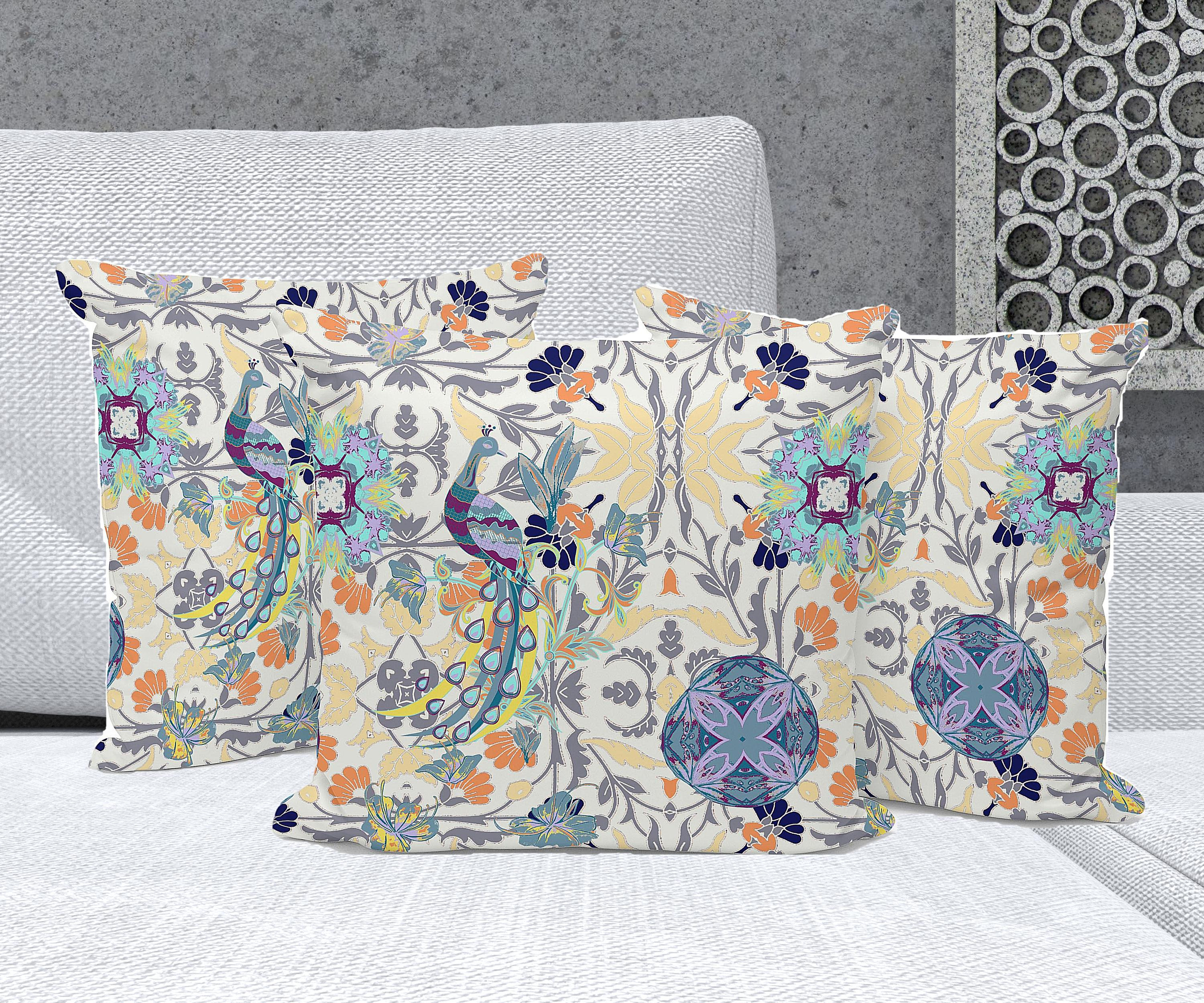 Set of Three Off White Peacock Abstract Indoor Outdoor Throw Pillow