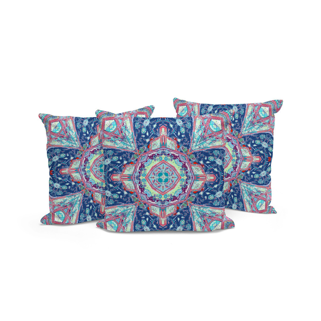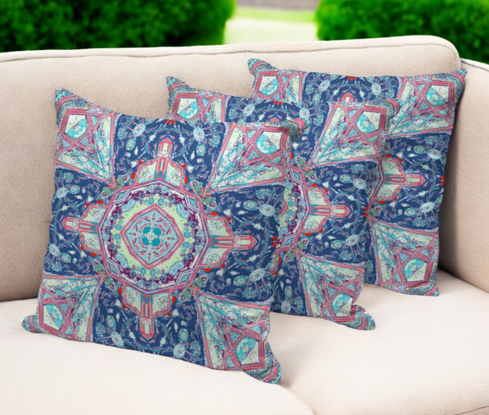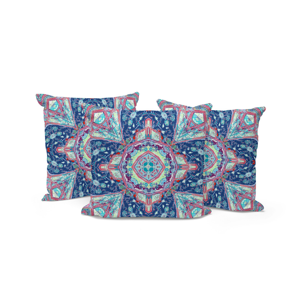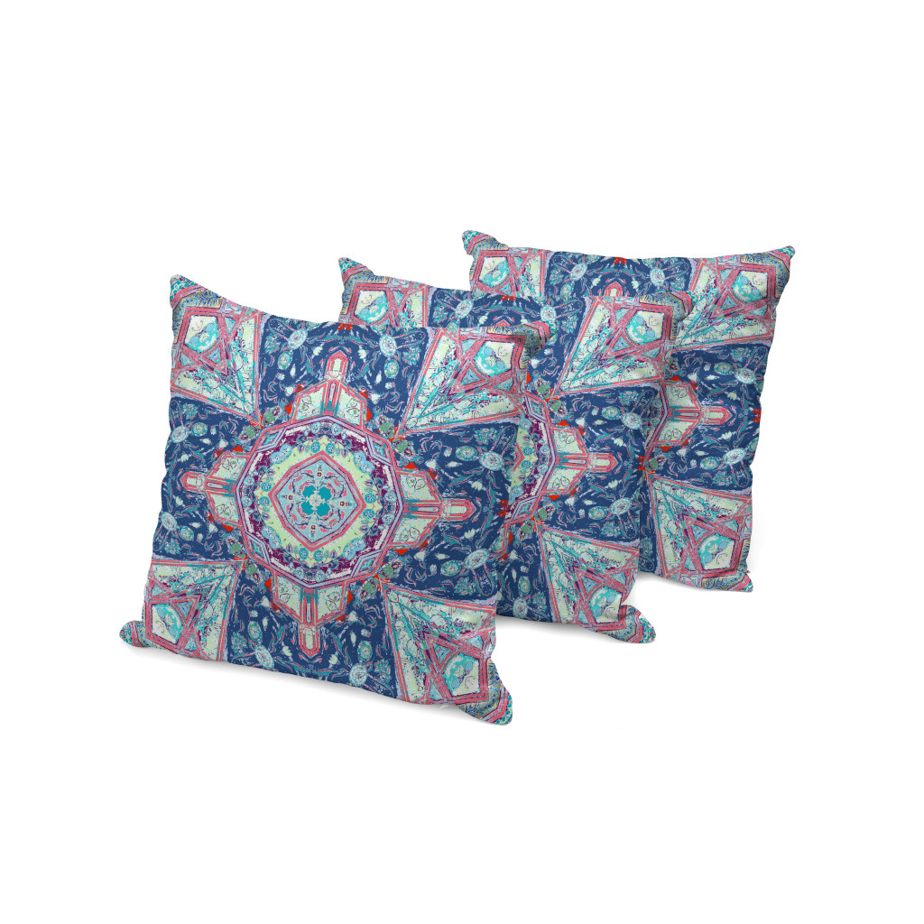 Buddha Flower Ceremony Indoor/Outdoor Set of 3 Pillows in Blue Light Blue Pink