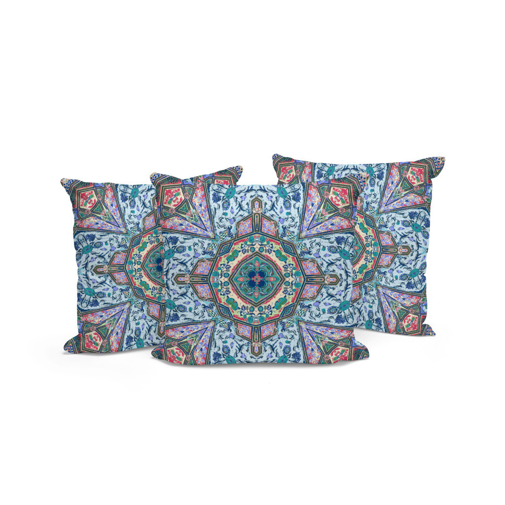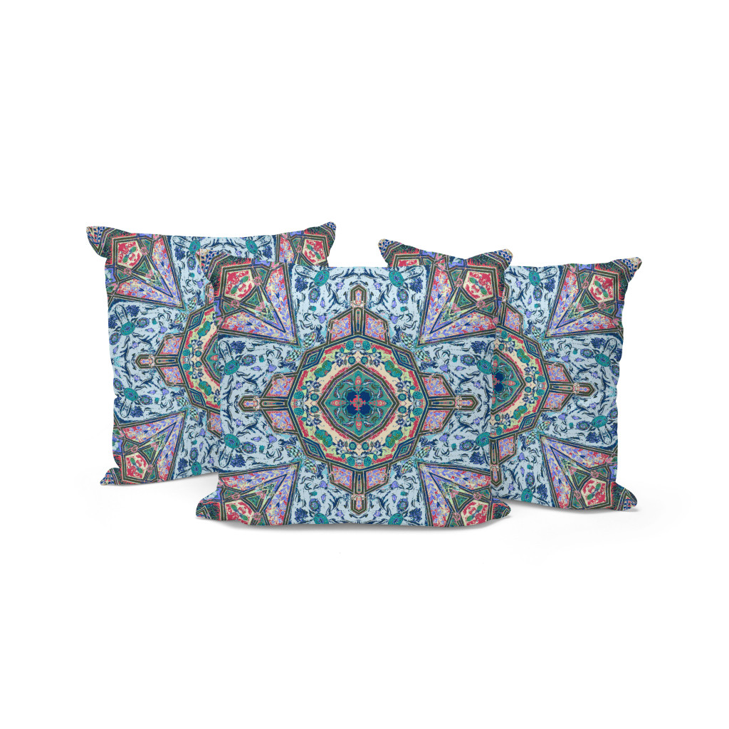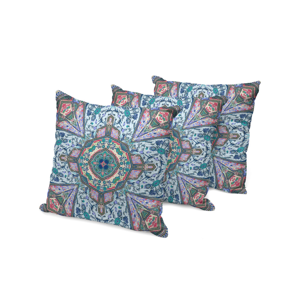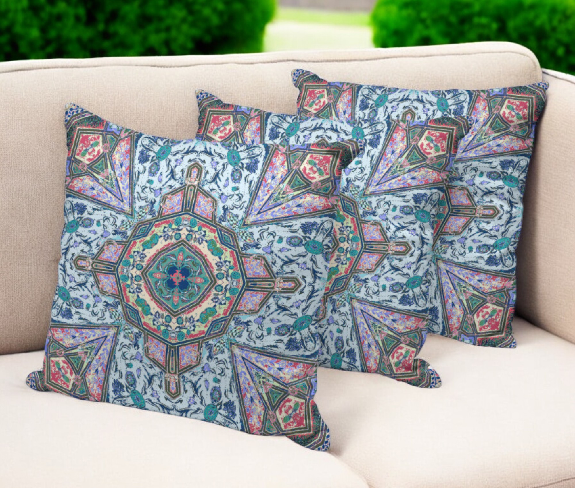 Buddha Flower Ceremony Indoor/Outdoor Set of 3 Pillows in Blue Muted Pink