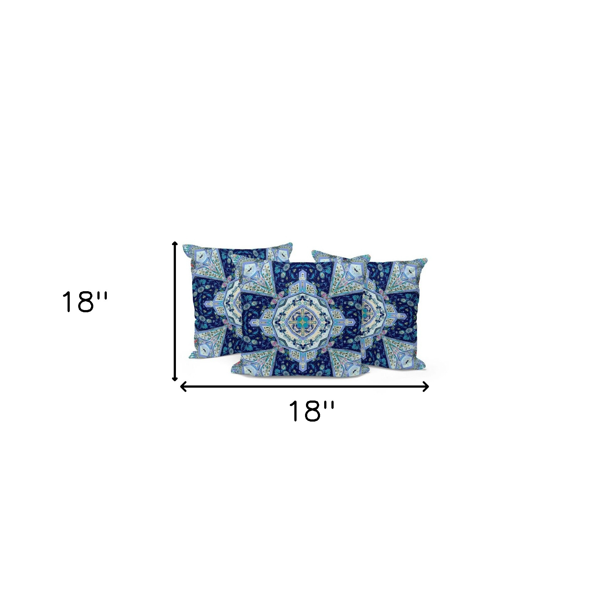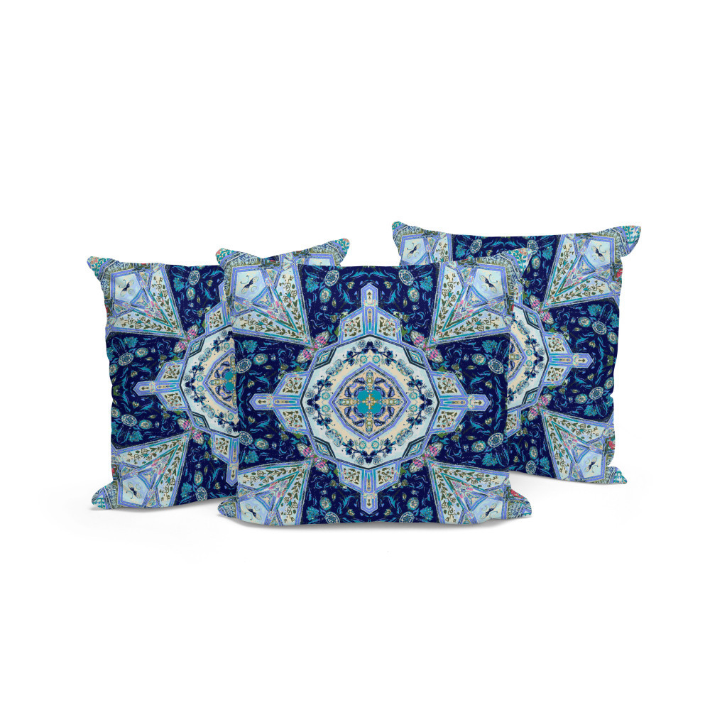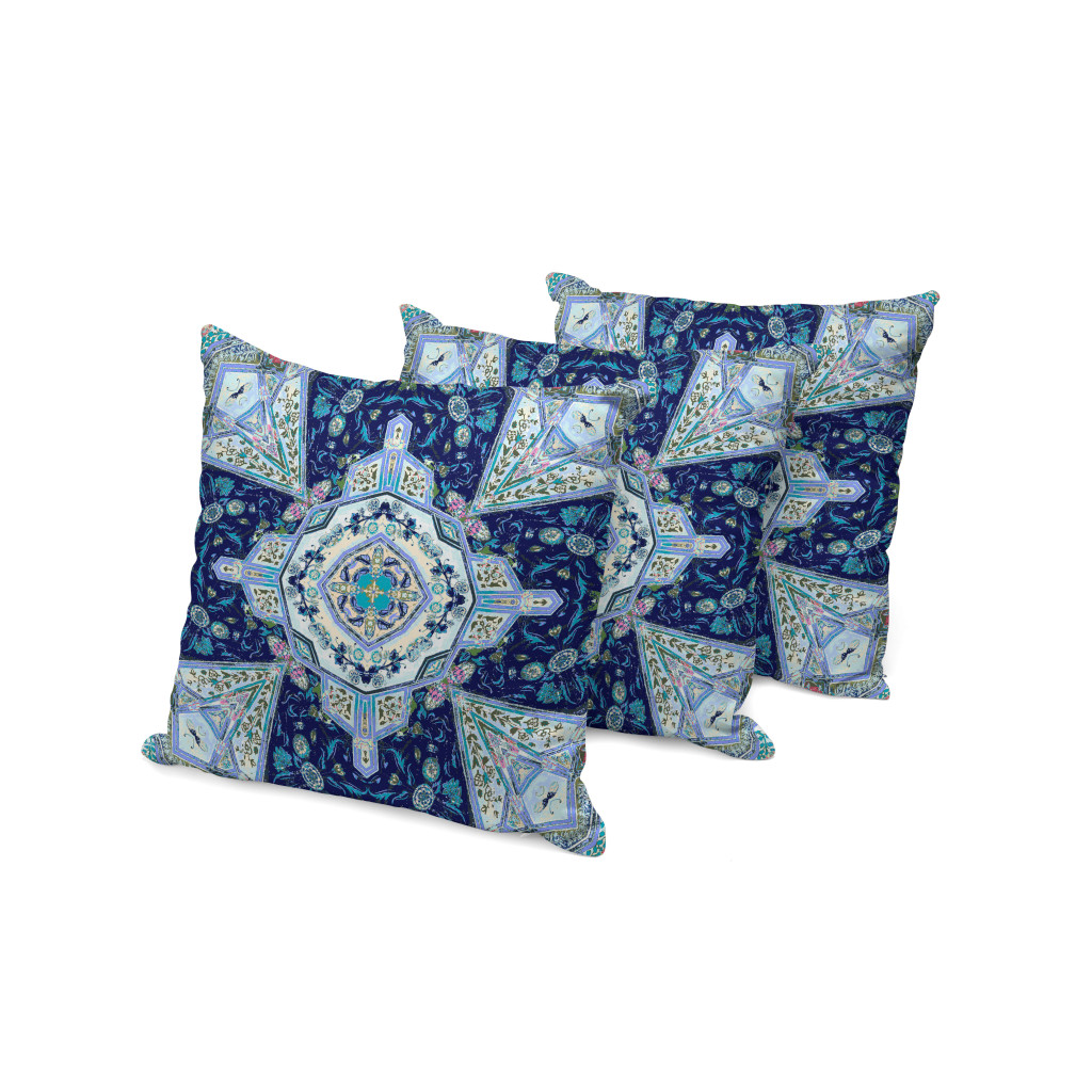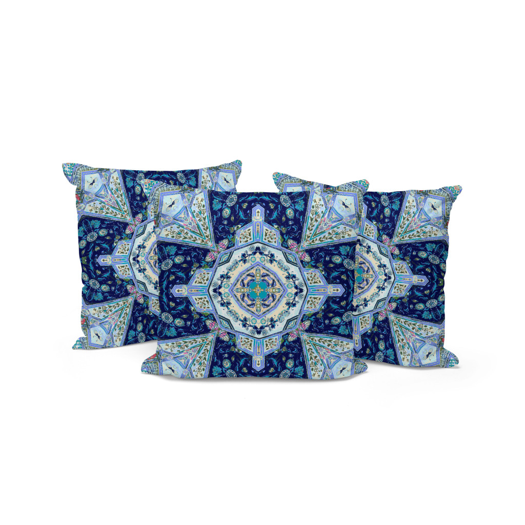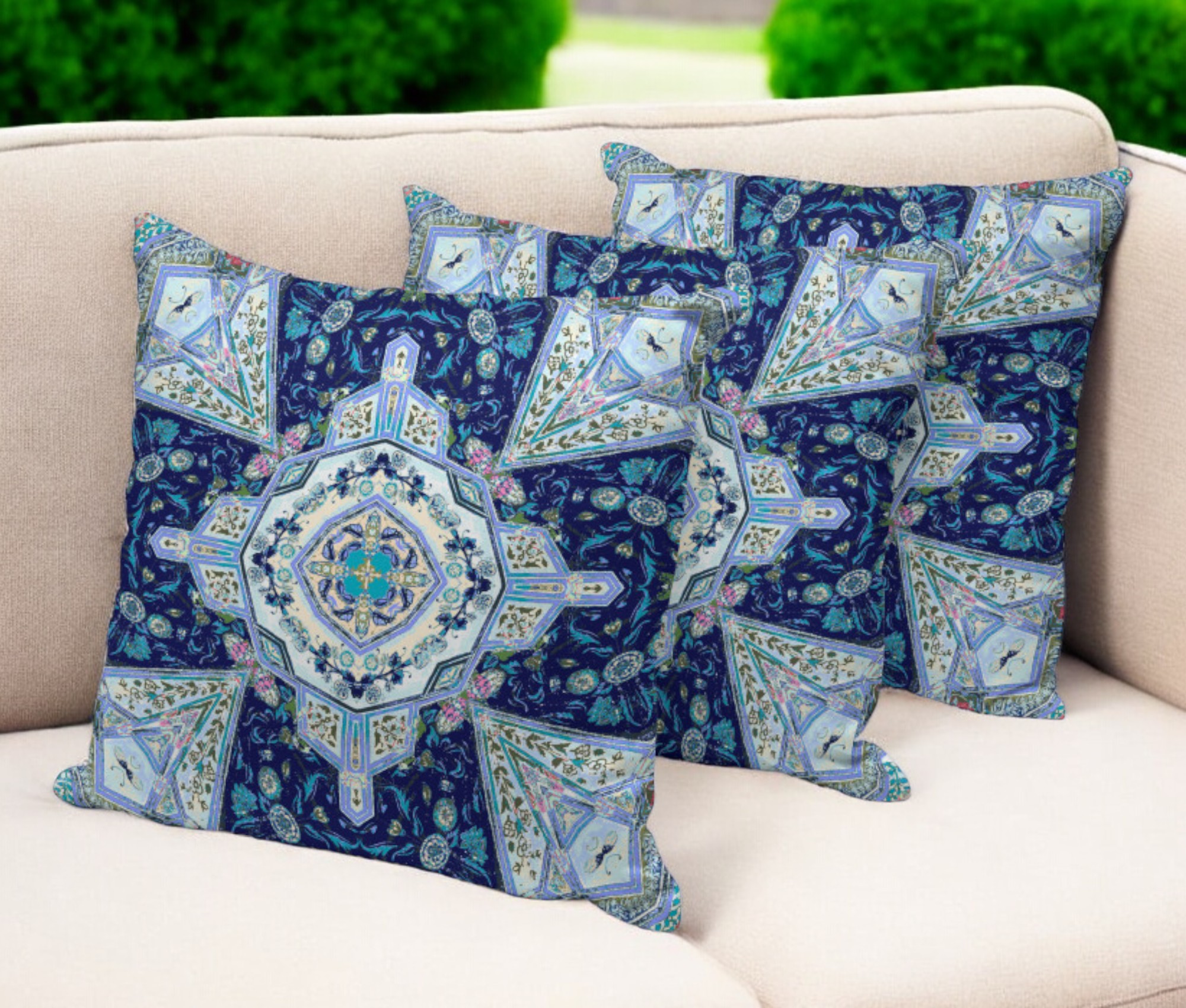 Buddha Flower Ceremony Indoor/Outdoor Set of 3 Pillows in Indigo Light Blue