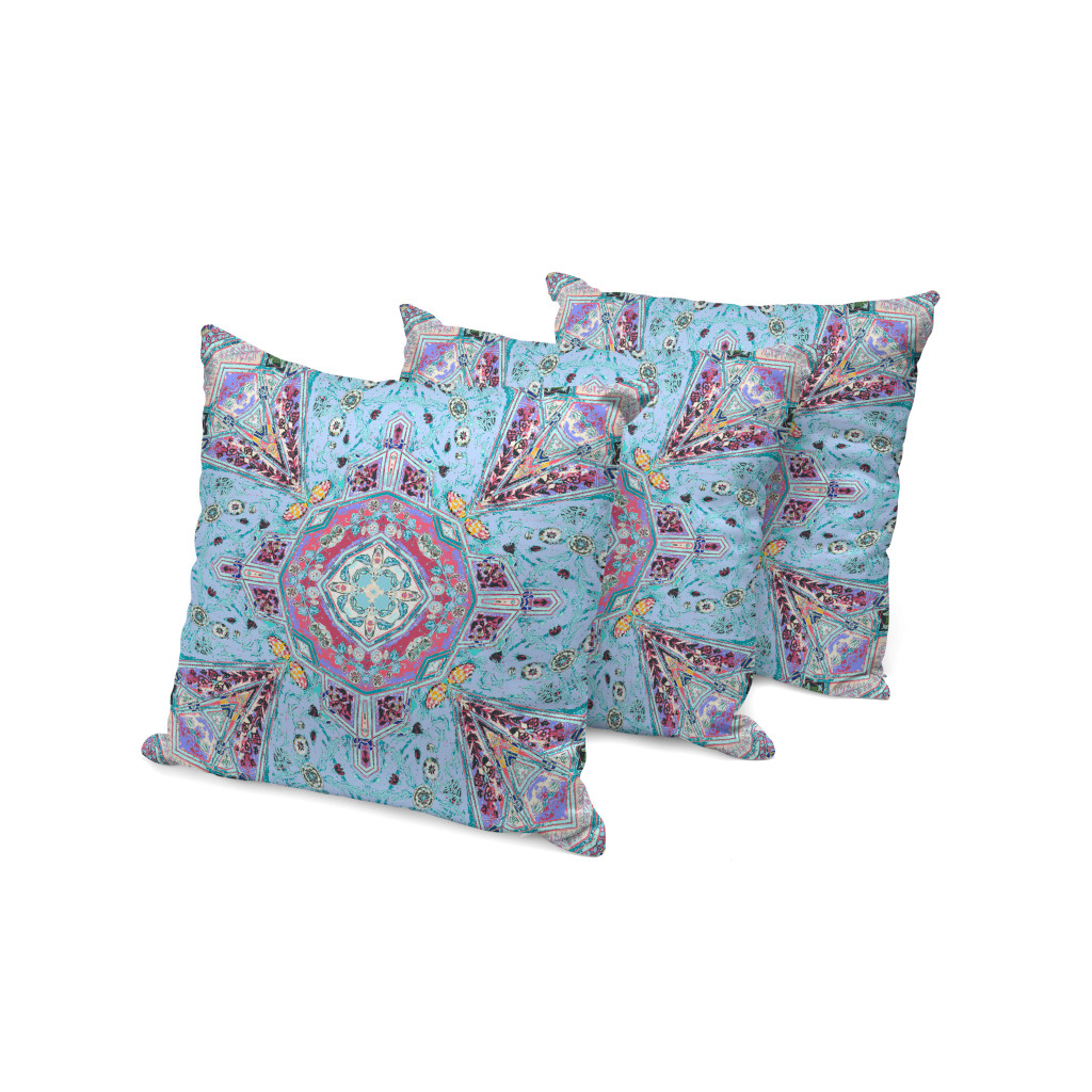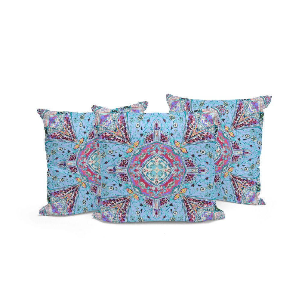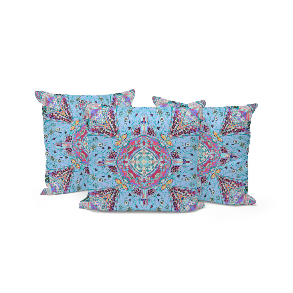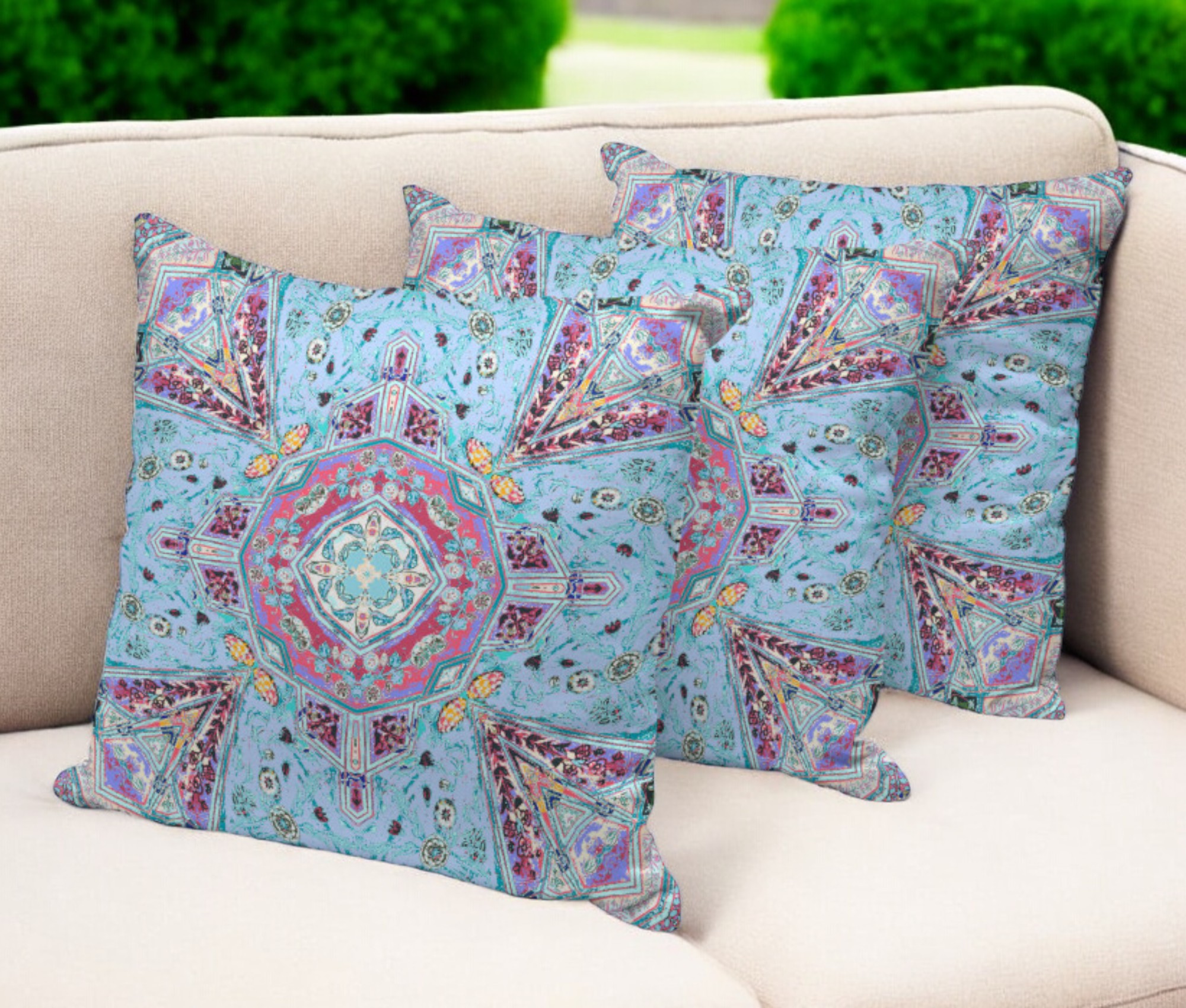 Buddha Flower Ceremony Indoor/Outdoor Set of 3 Pillows in Light Blue Magenta