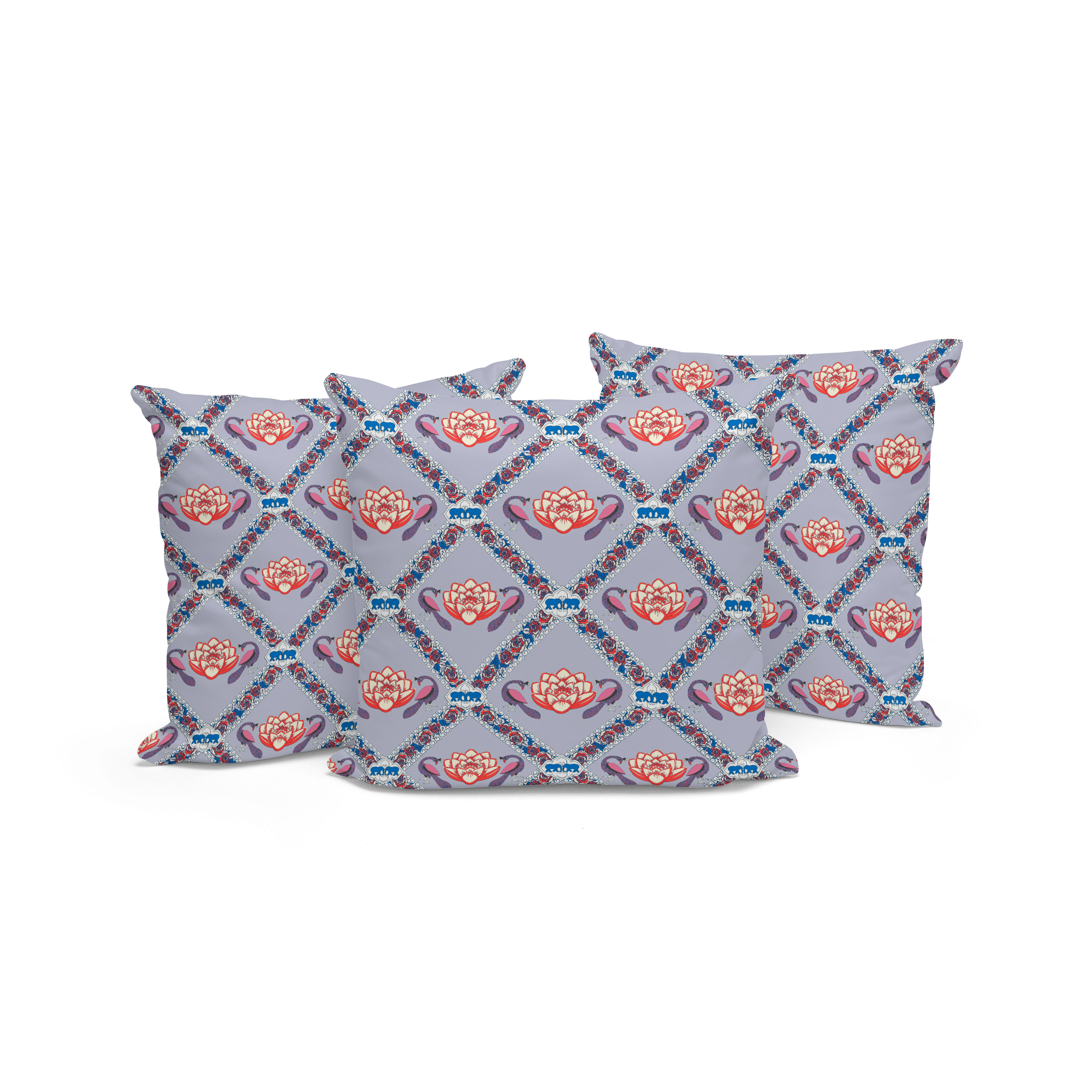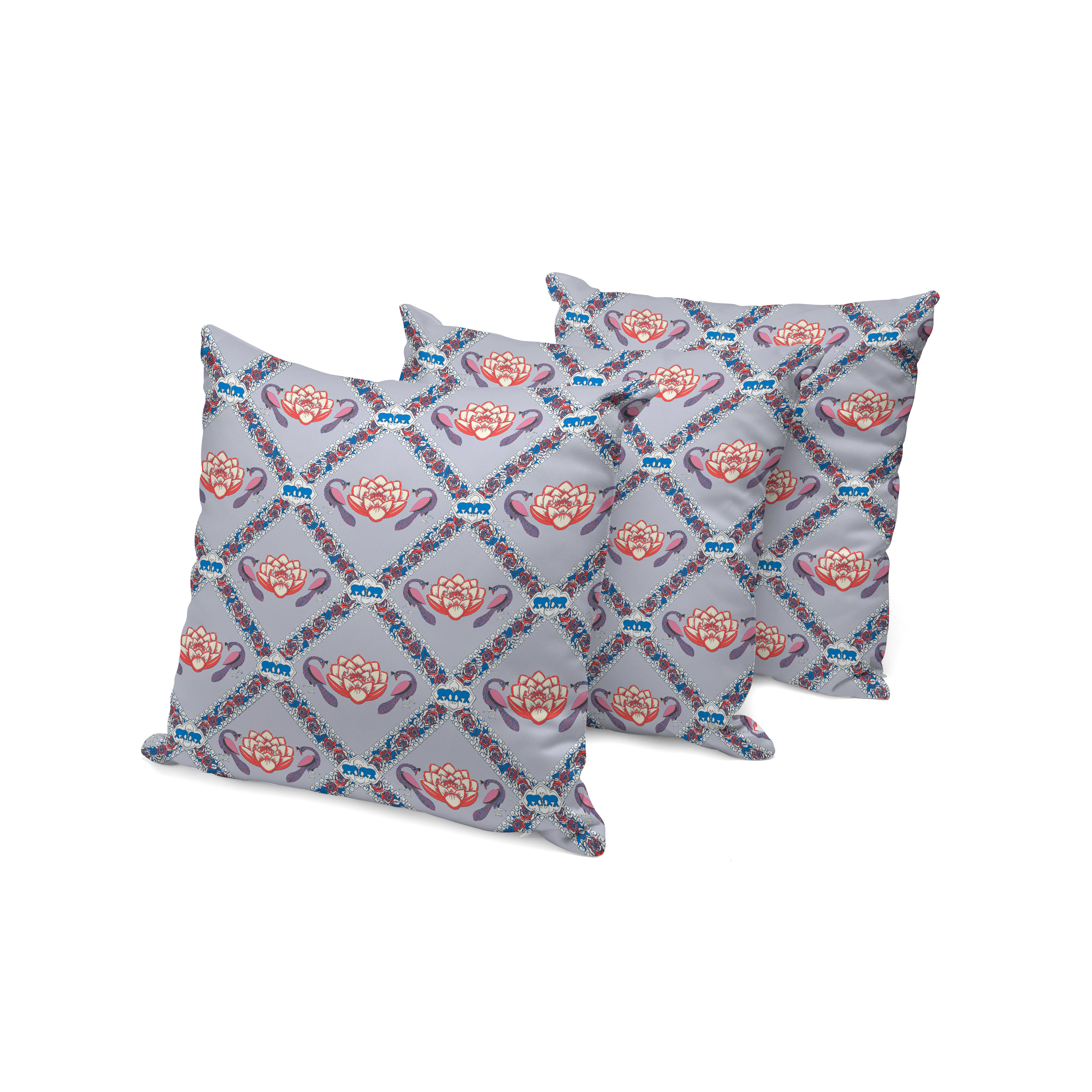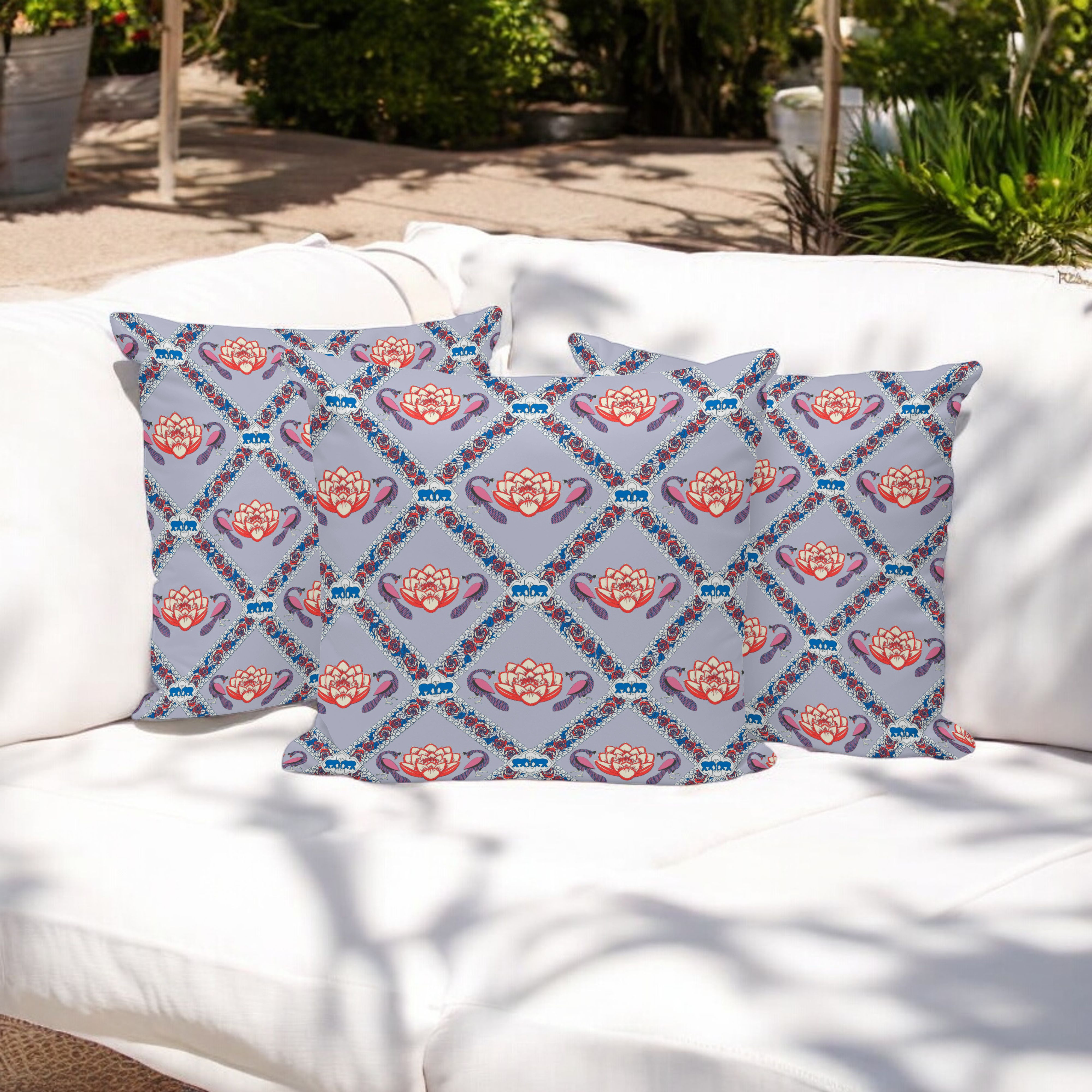 Lotus Peacock Rose Indoor/Outdoor Set of 3 Pillows in Gray Red Blue