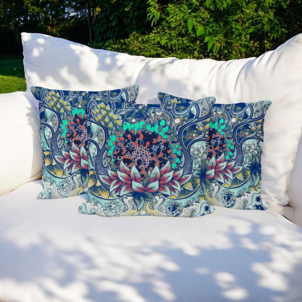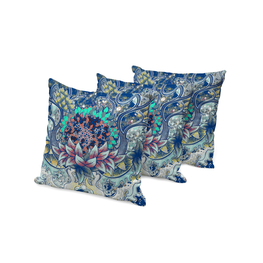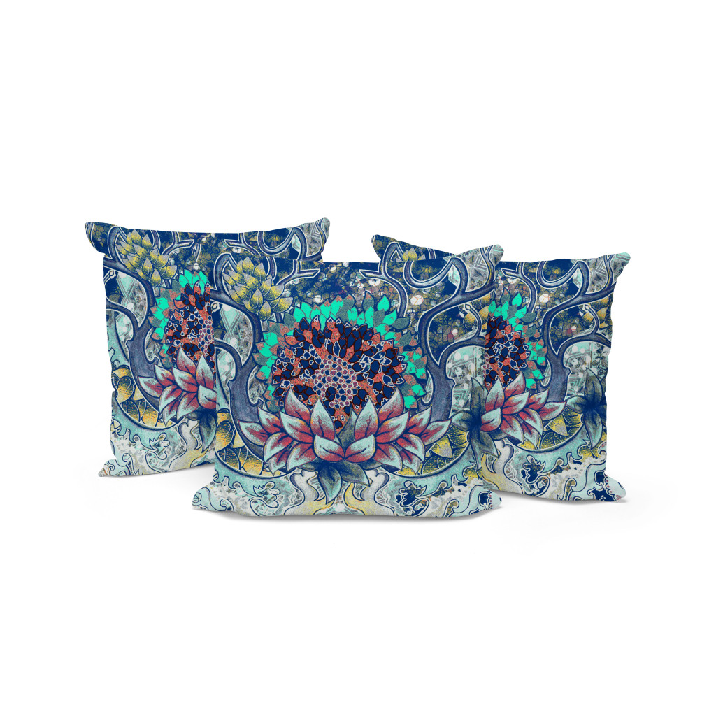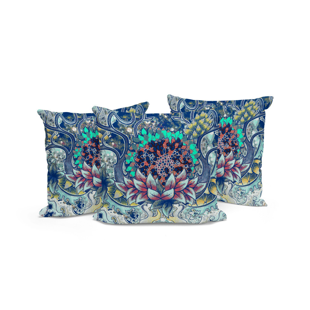 Set of Three Blue Botanical Indoor Outdoor Throw Pillow