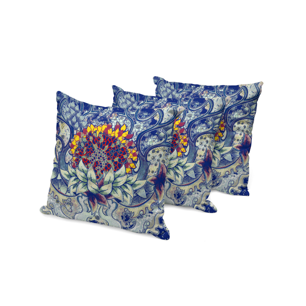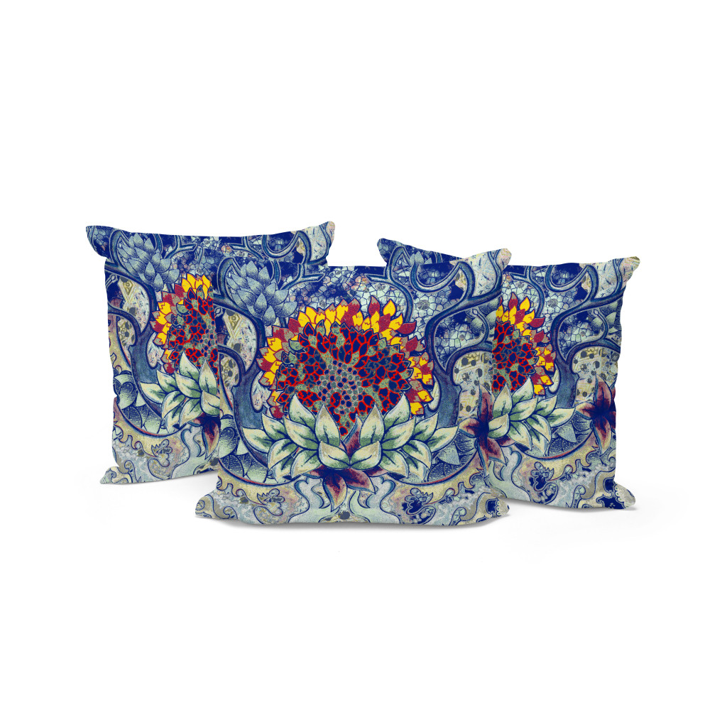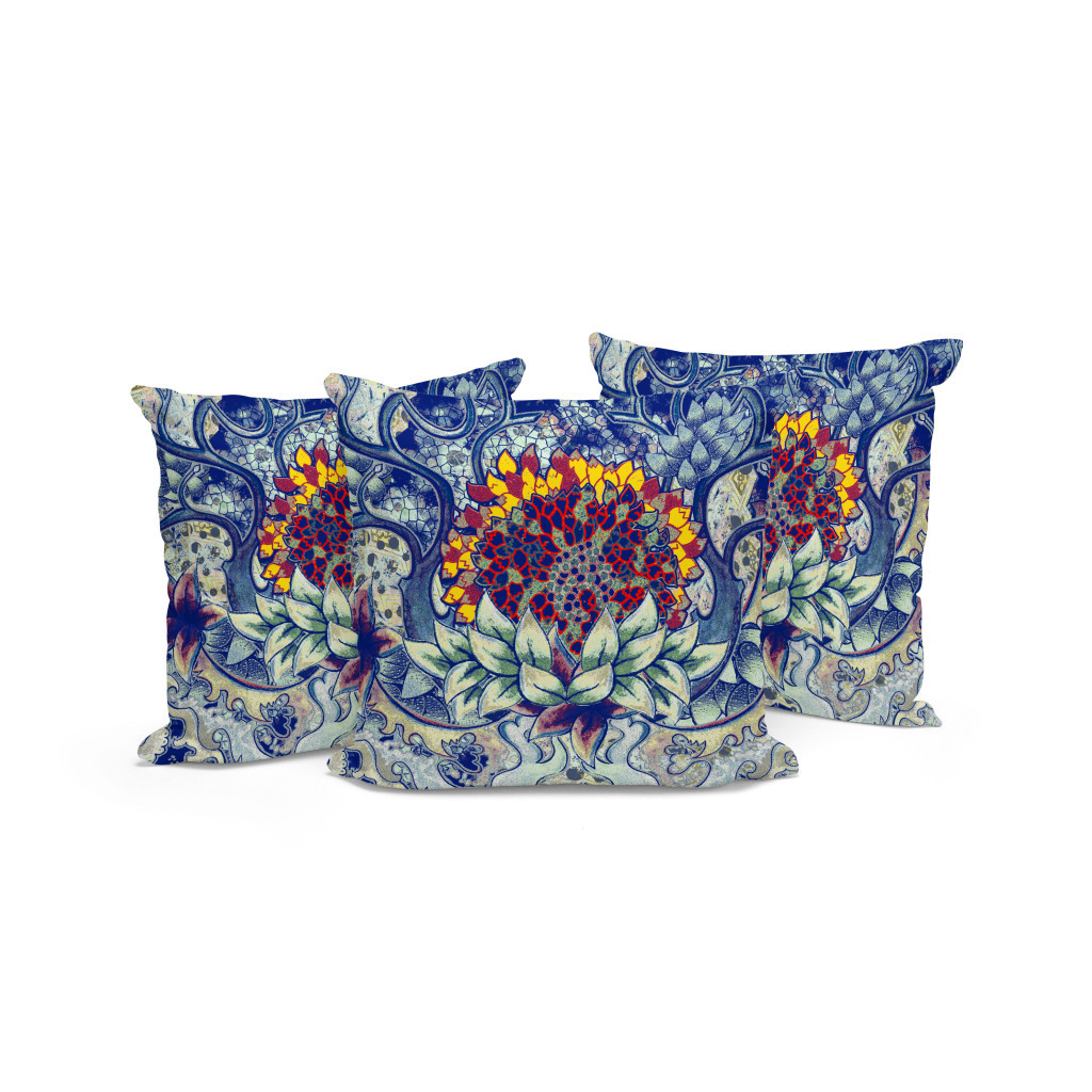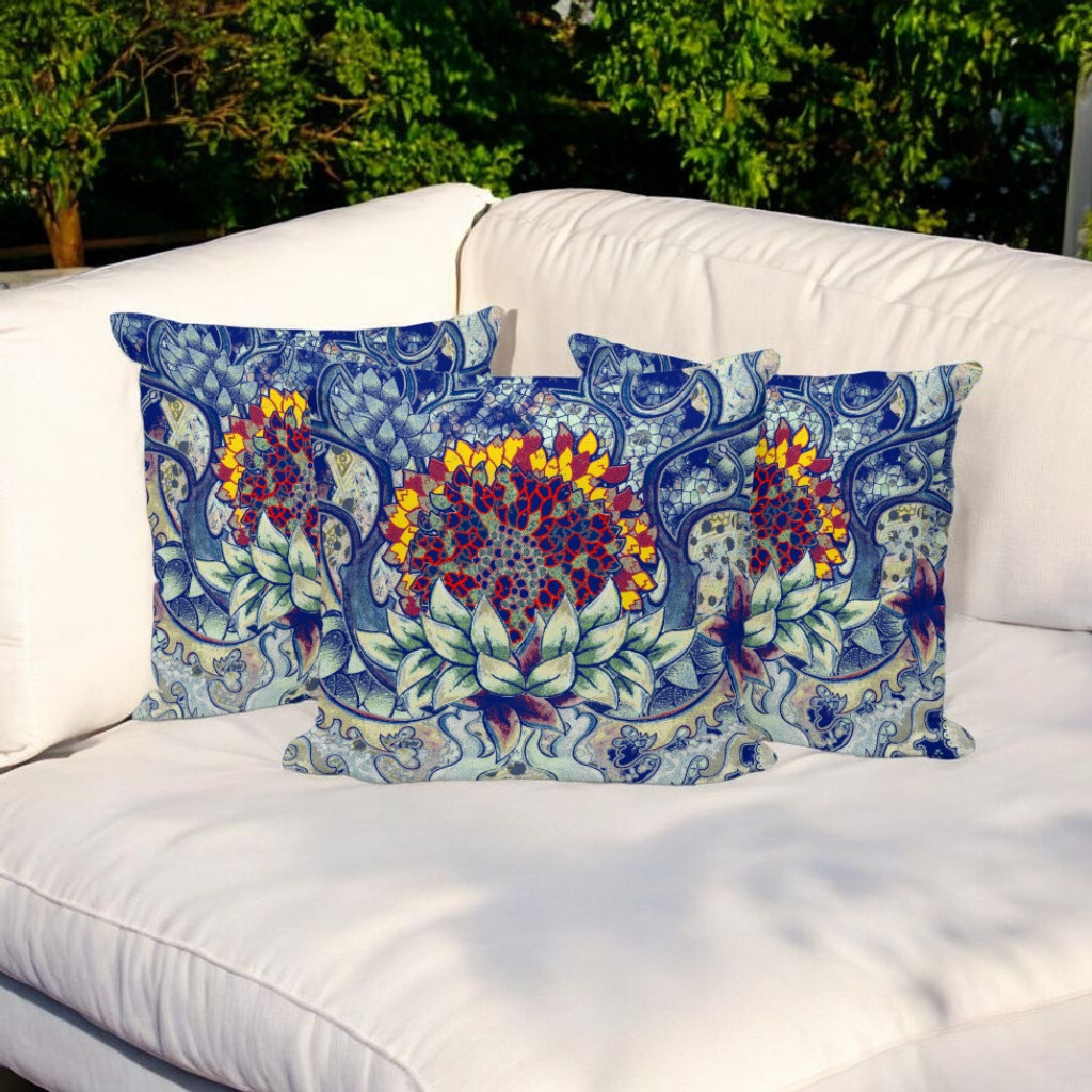 Set of Three Blue Botanical Indoor Outdoor Throw Pillow
