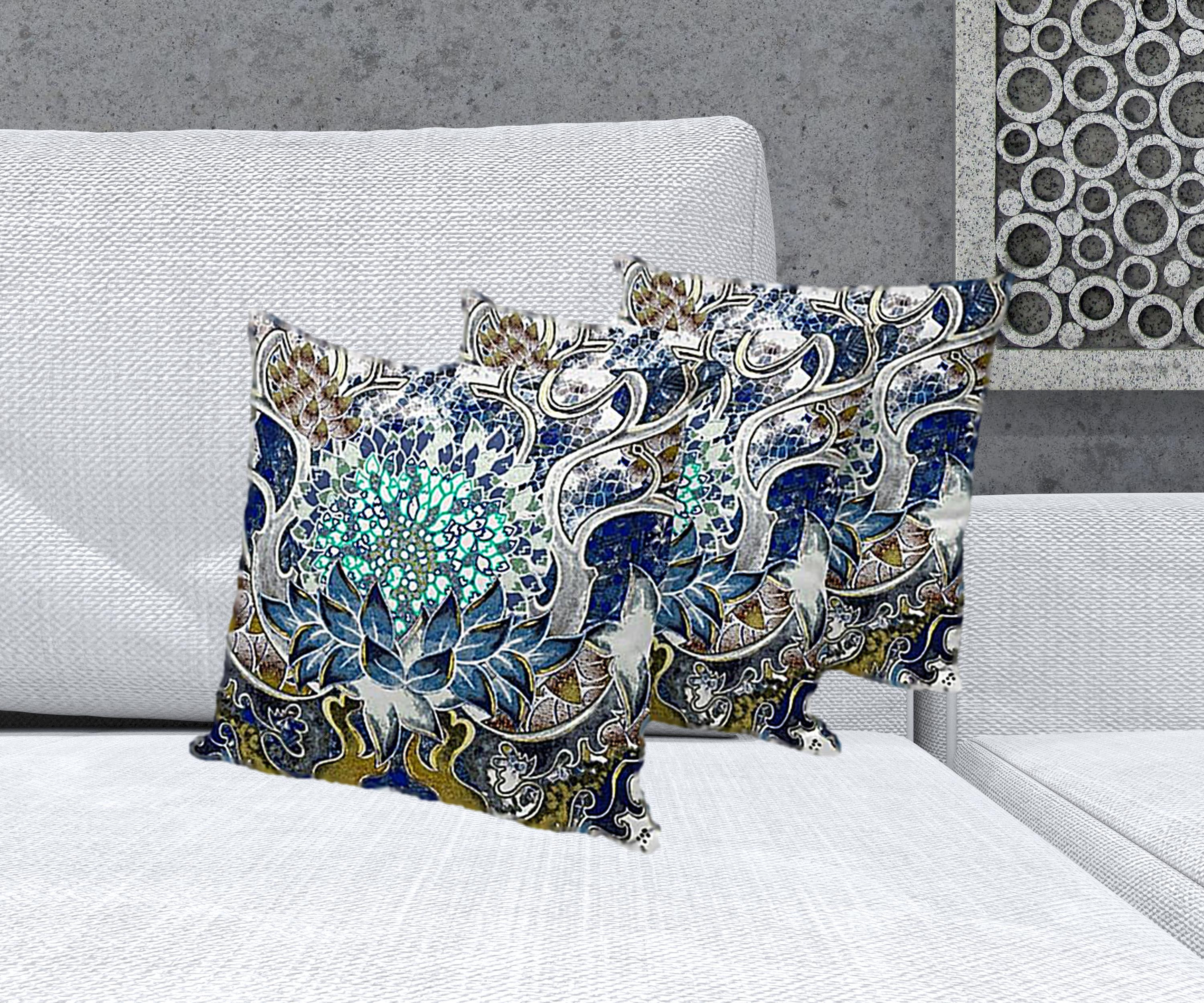 Set of Three Blue Botanical Indoor Outdoor Throw Pillow