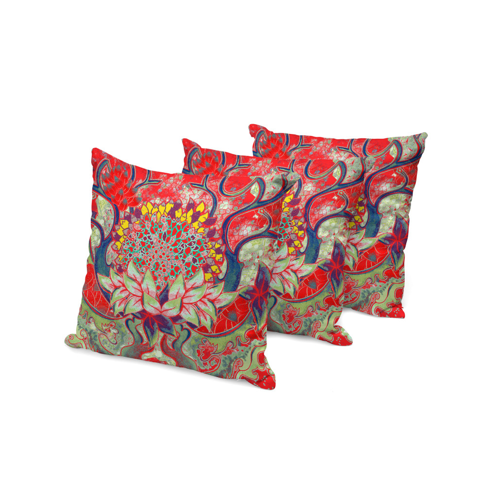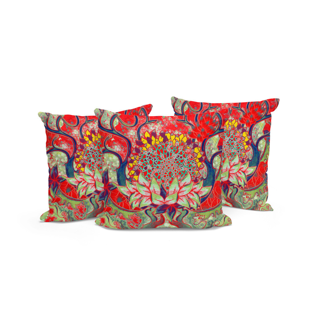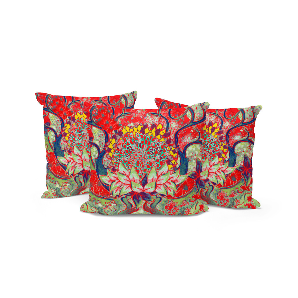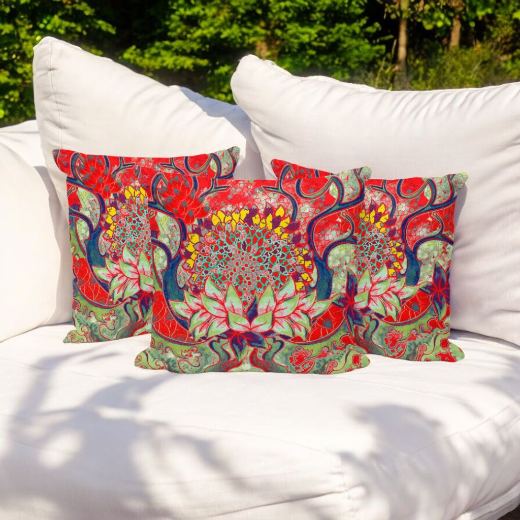 Set of Three Red Botanical Indoor Outdoor Throw Pillow
