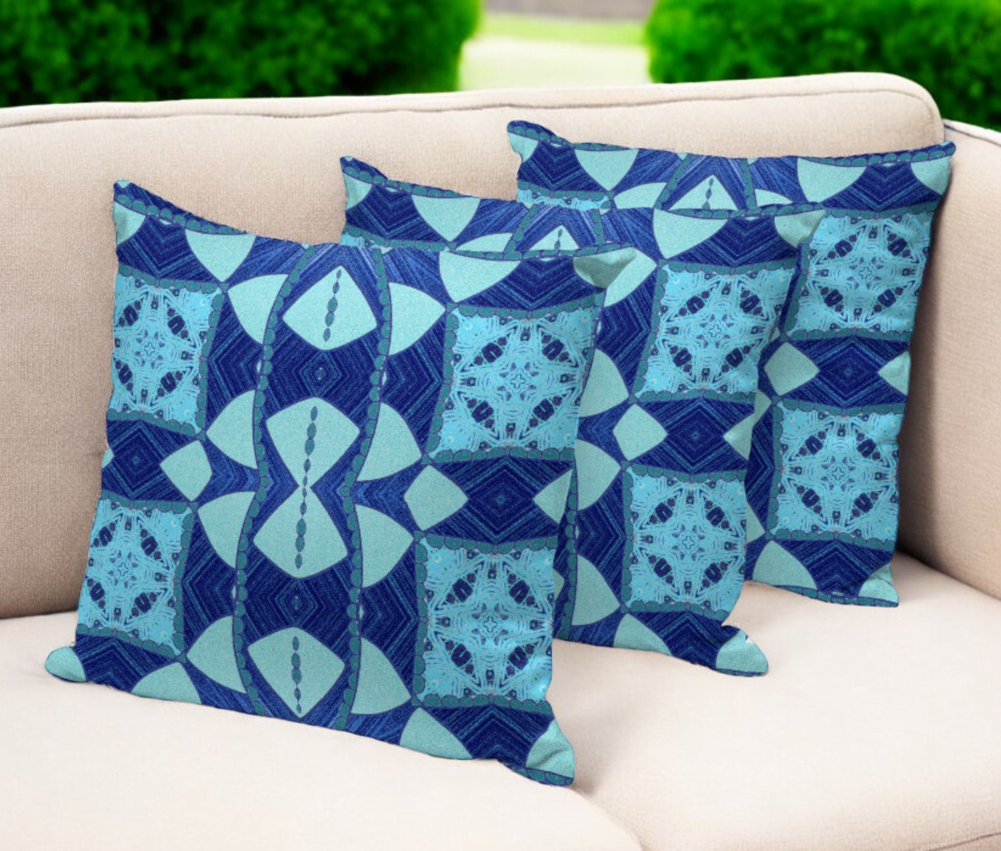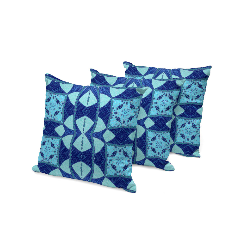 Set of Three Blue Geometric Indoor Outdoor Throw Pillow