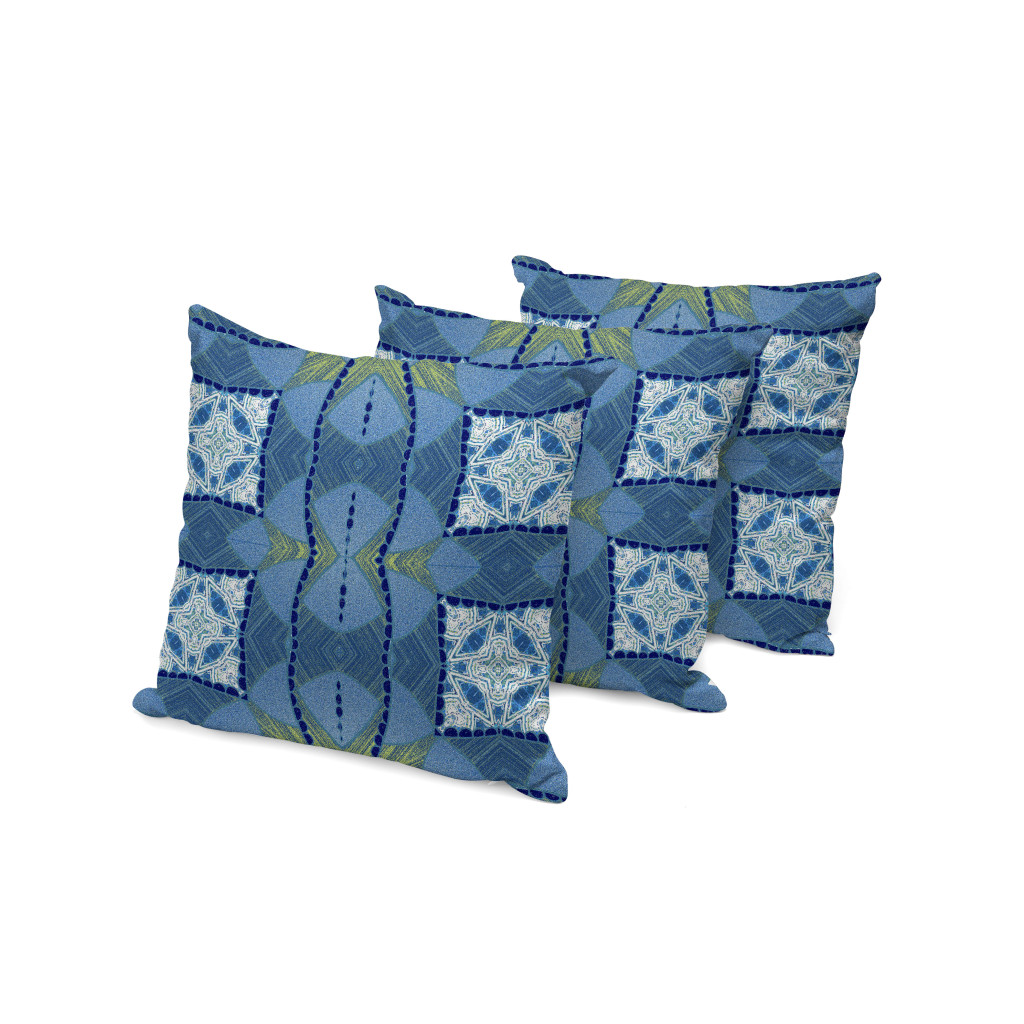 Set of Three Blue Geometric Indoor Outdoor Throw Pillow