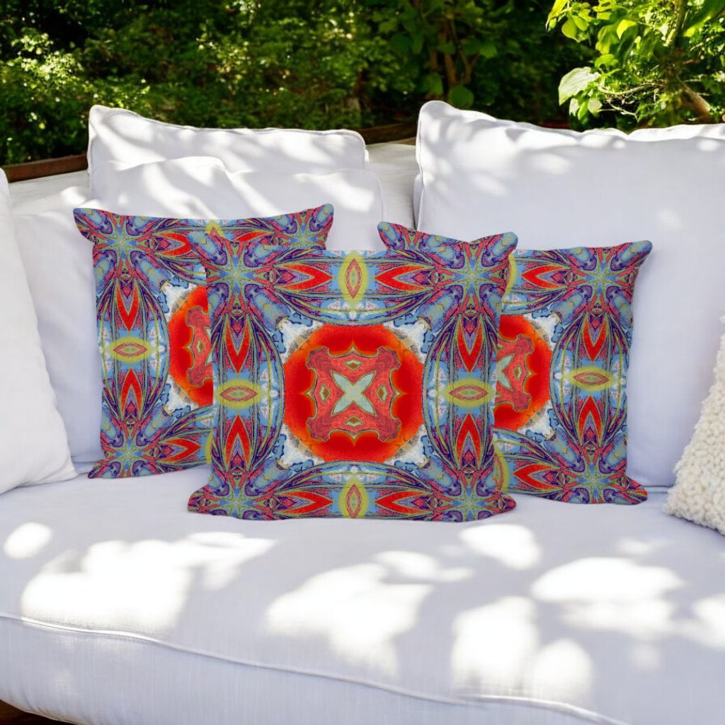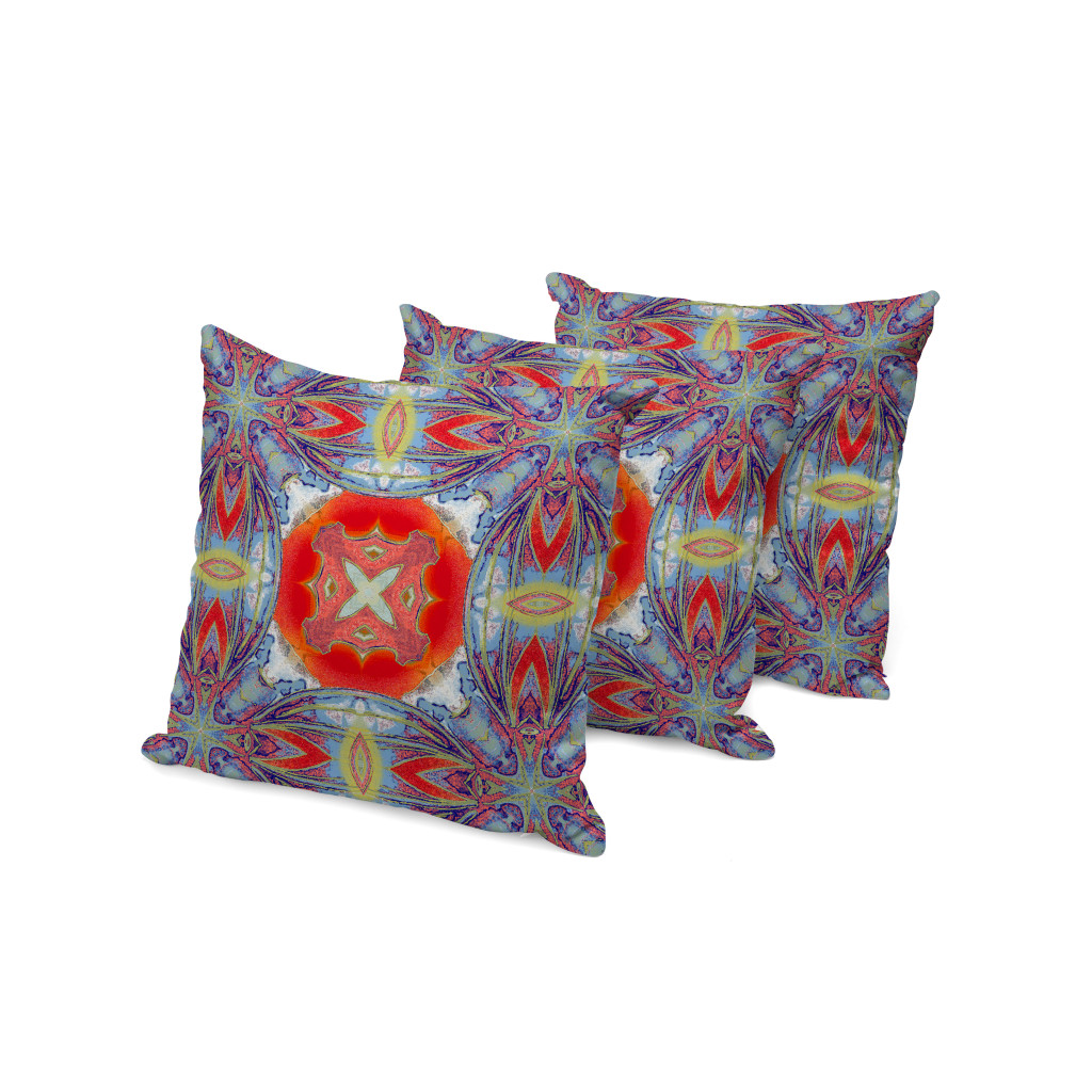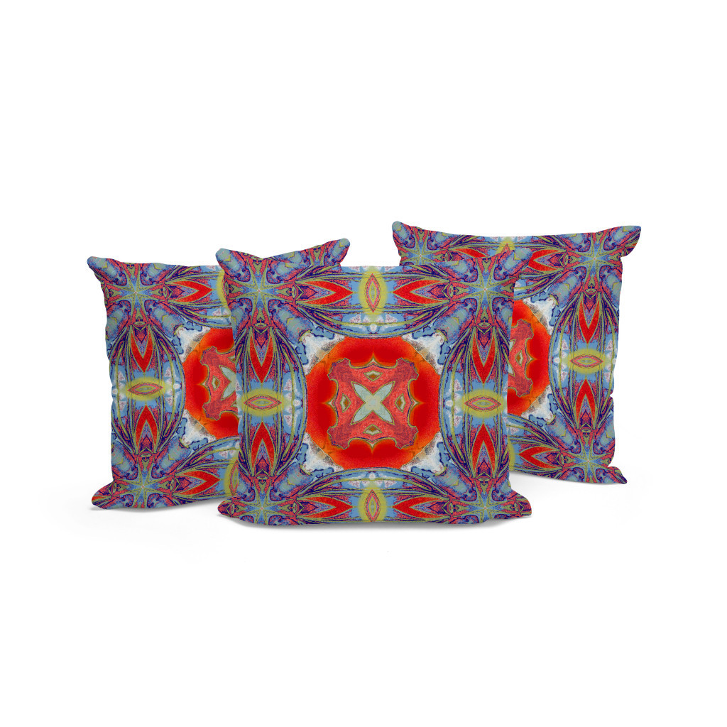 Pastel Floral Squares Indoor/Outdoor Set of 3 Pillows in Muted Blue Hot Orange