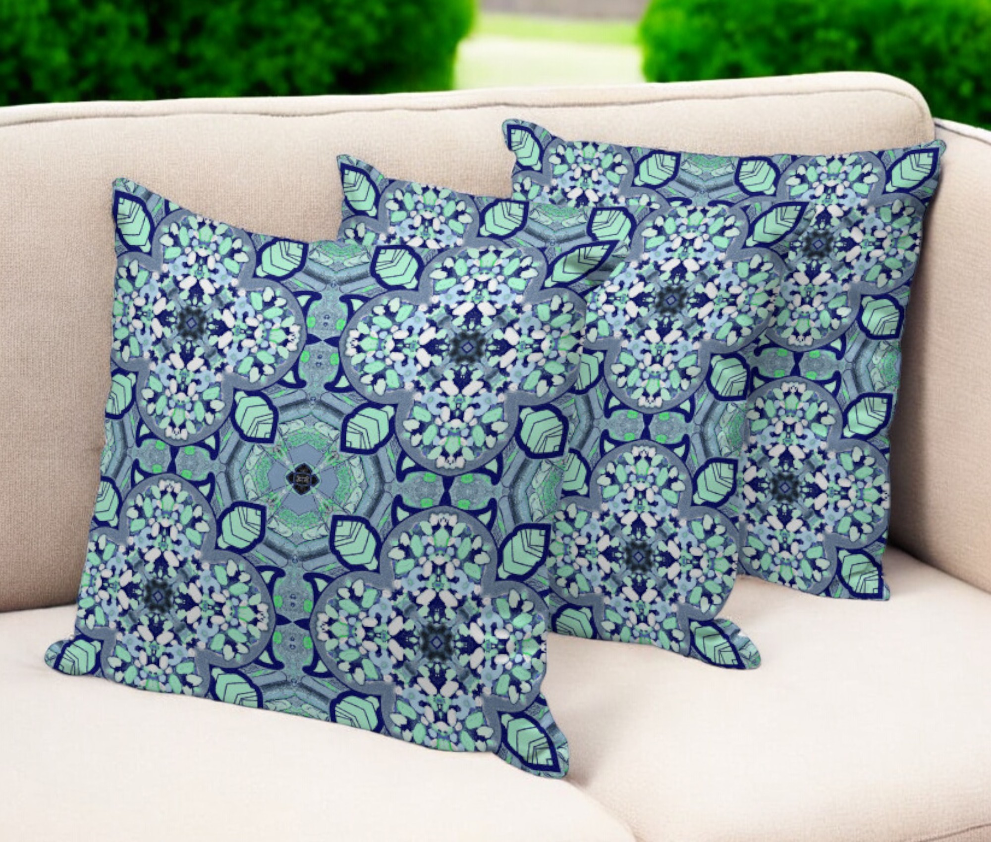Clover Leaf Floral Indoor/Outdoor Set of 3 Pillows in Muted Blue Aqua