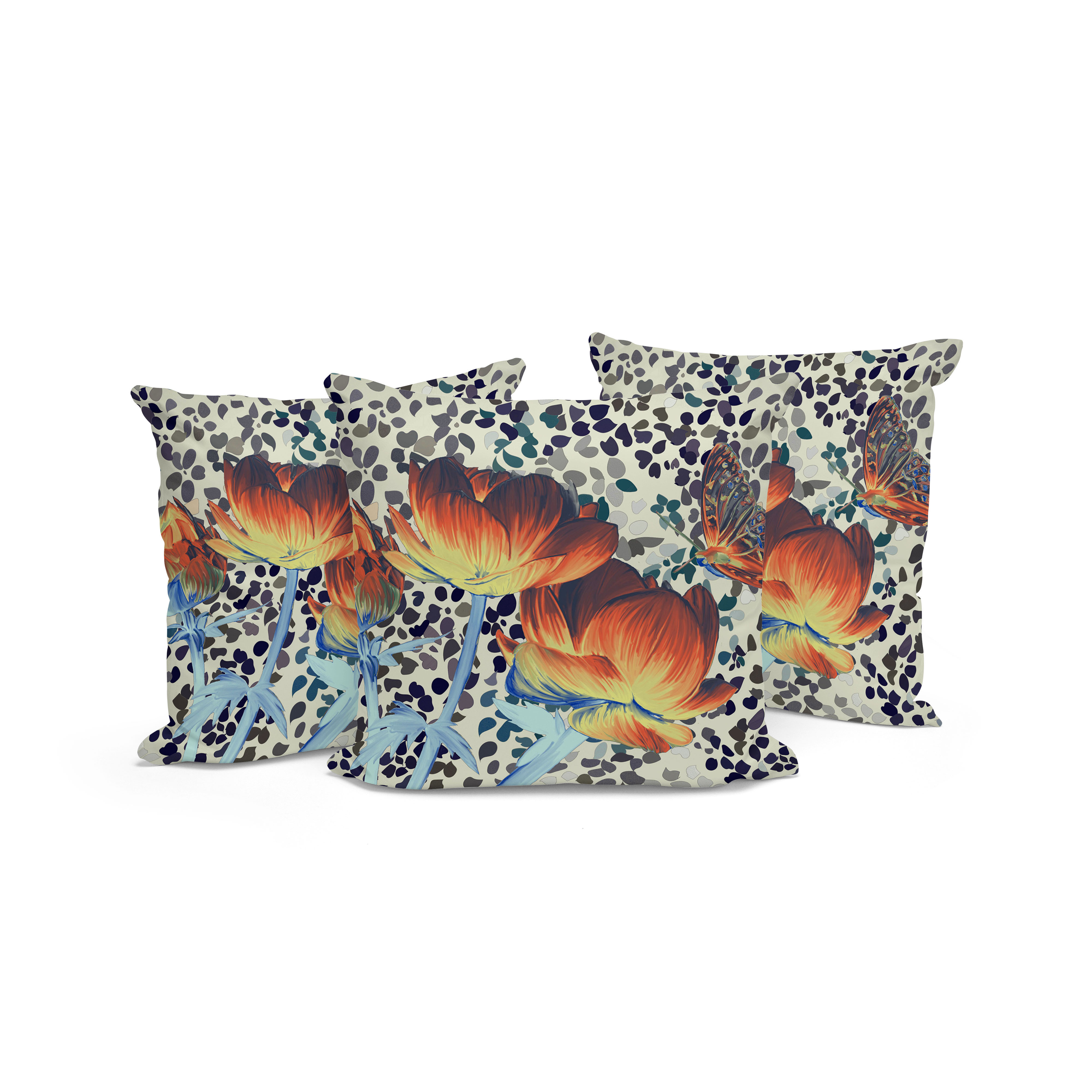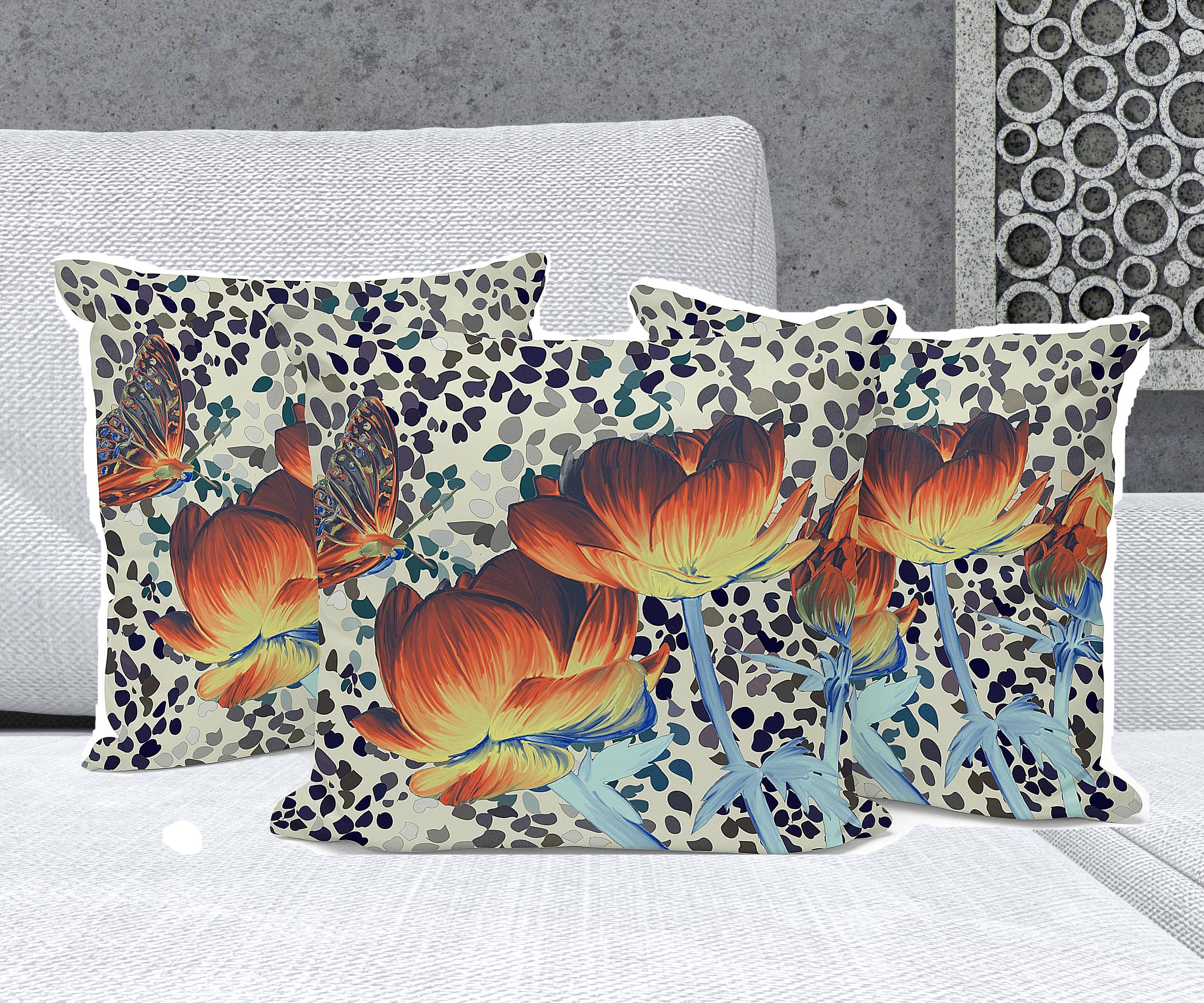 Three Roses with Butterfly Indoor/Outdoor Set of 3 Pillows in Orange Yellow Cream