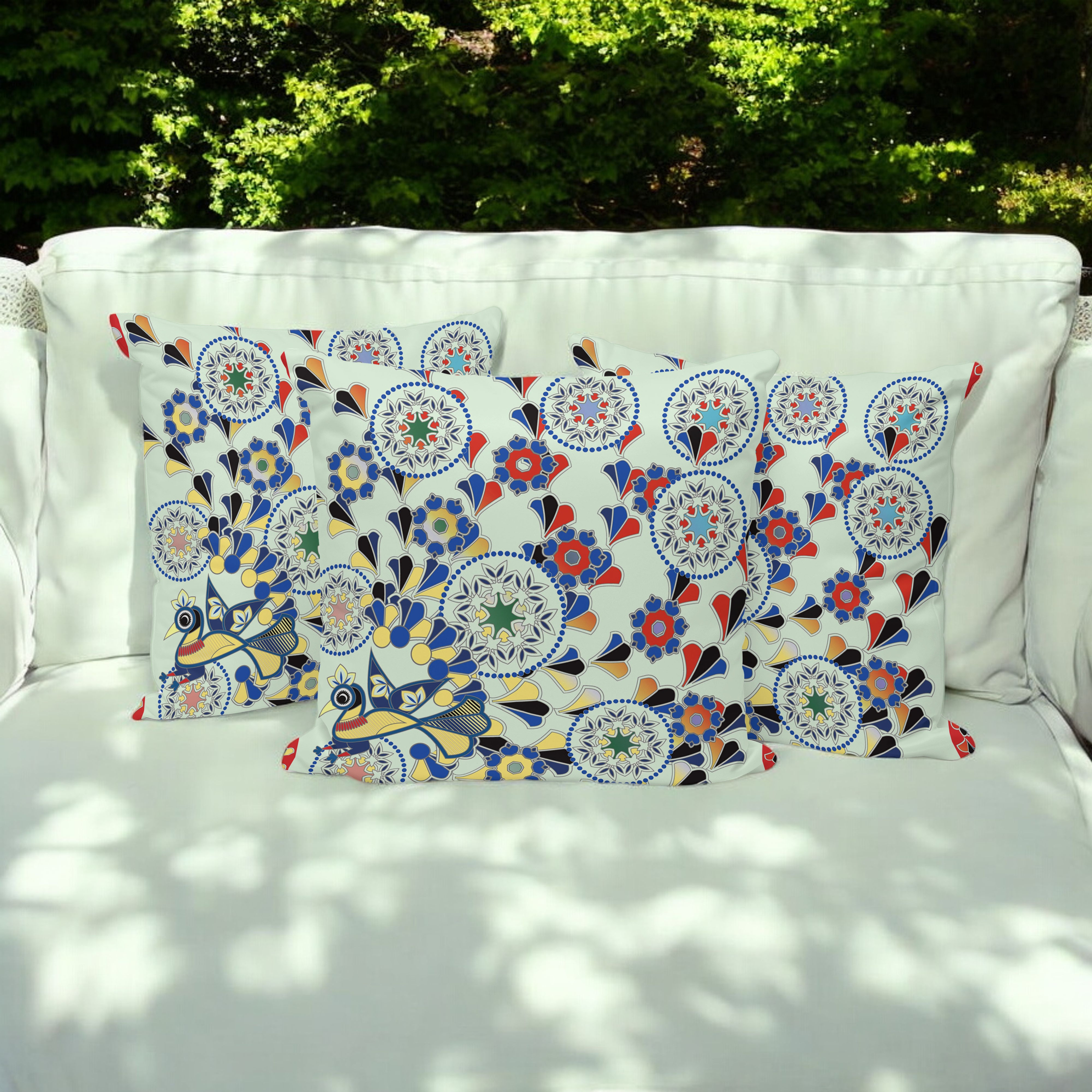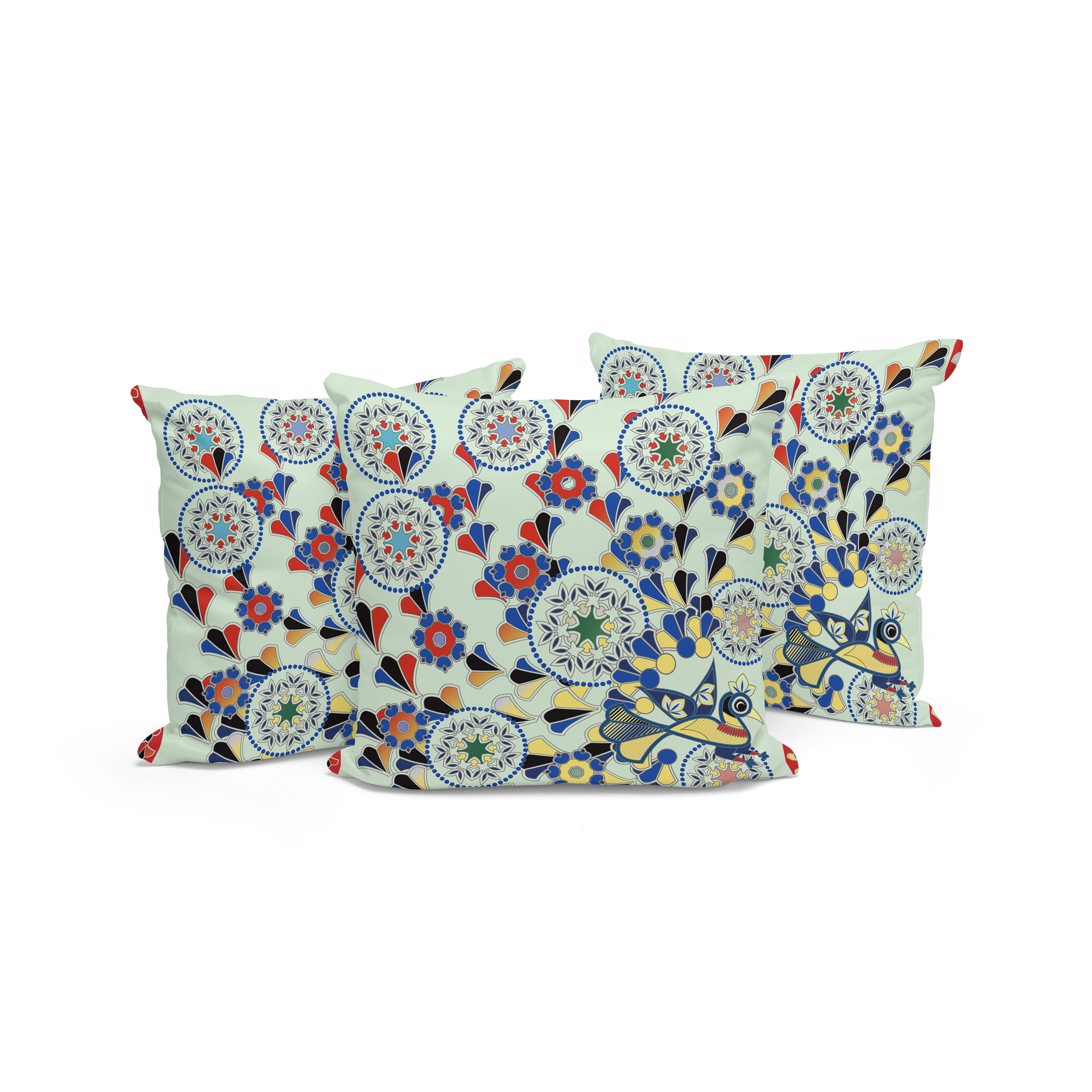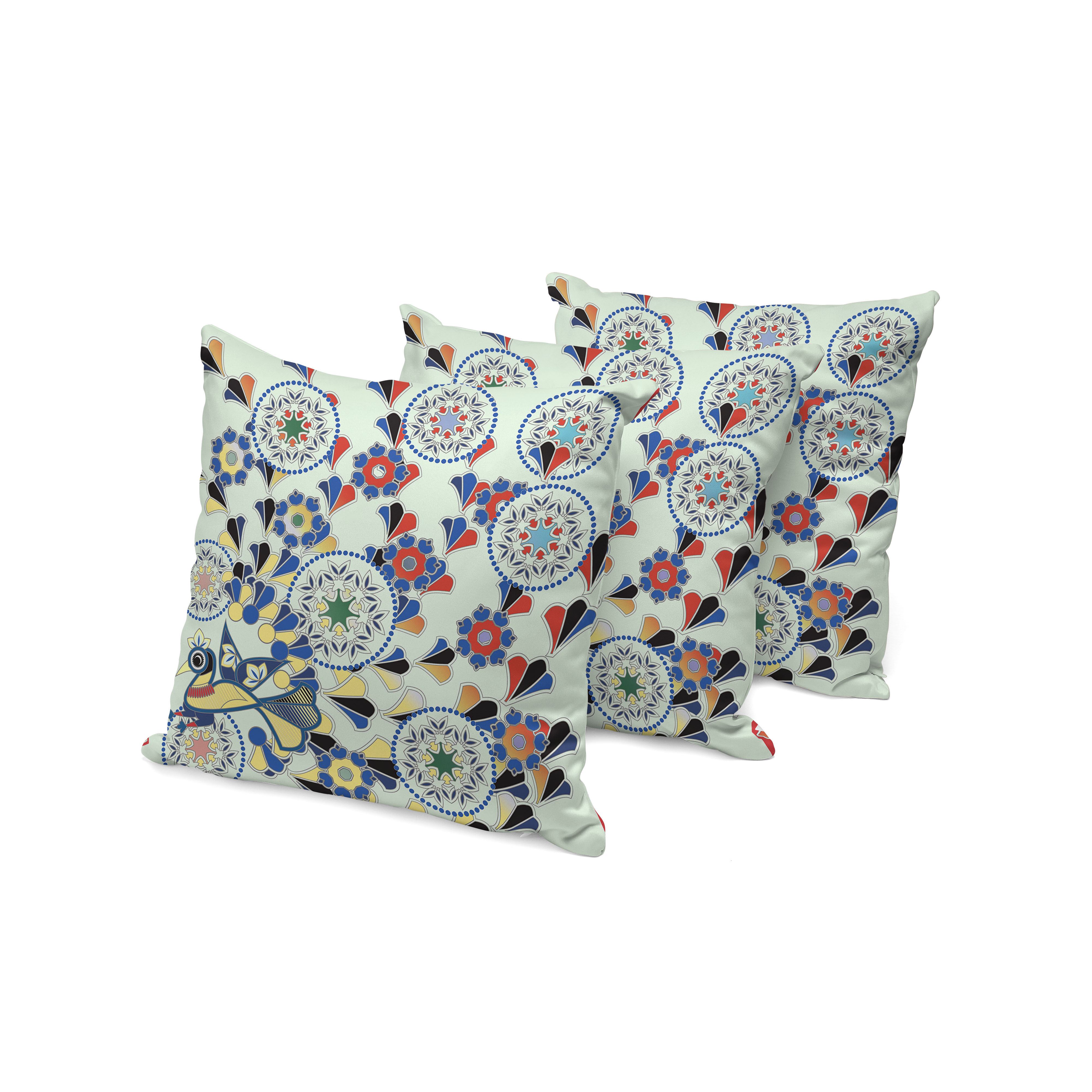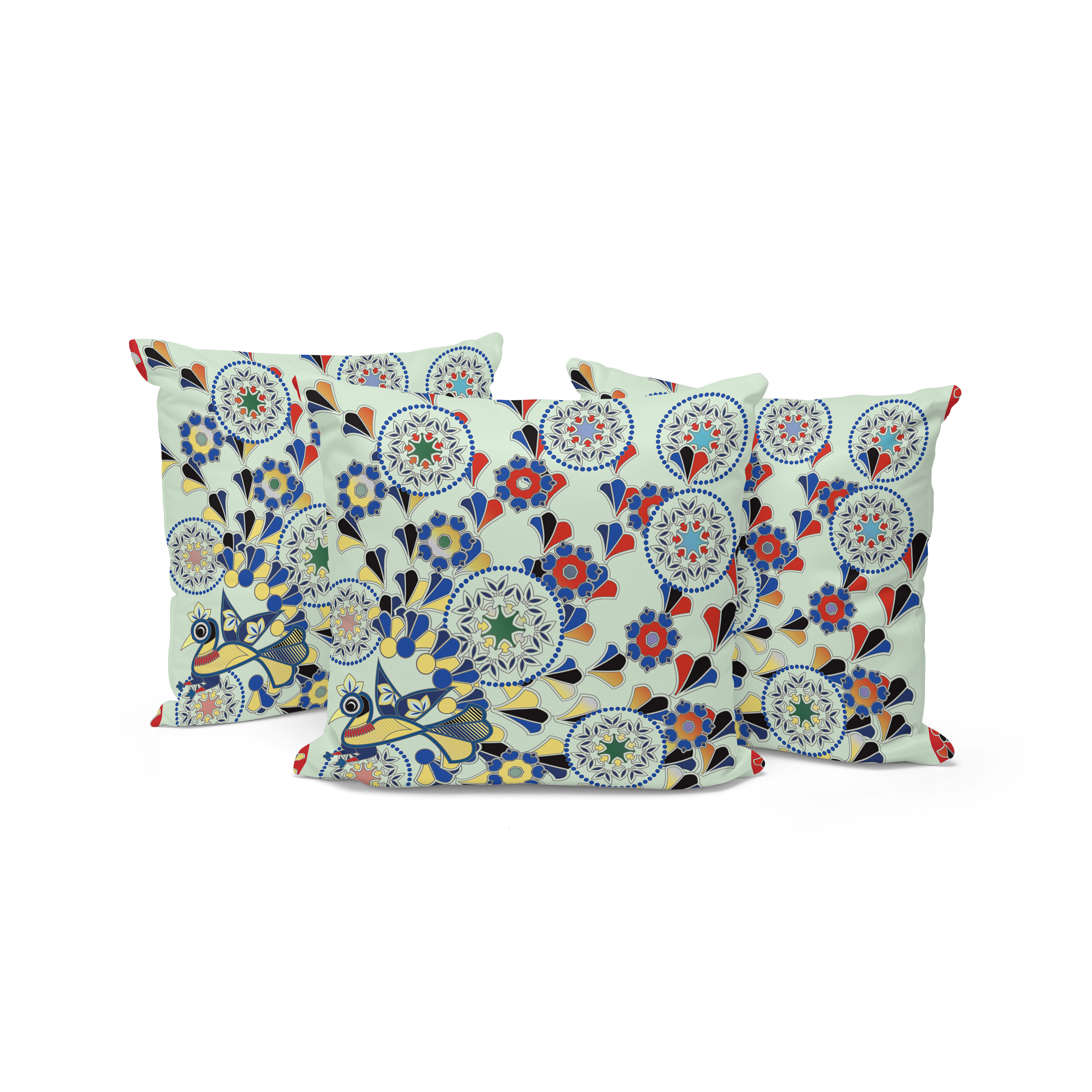 Glory of Flowers Peacock Indoor/Outdoor Set of 3 Pillows in Light Green Blue Red