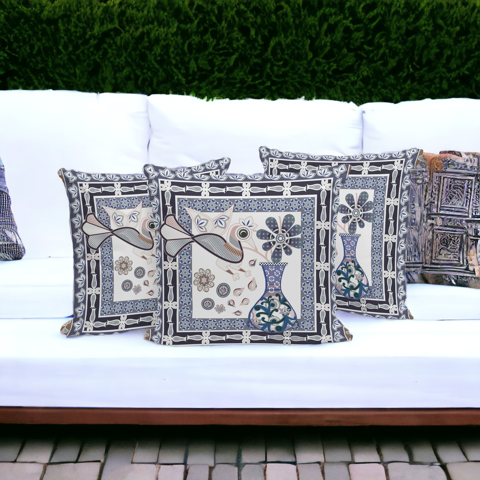 Set of Three Beige Peacock Indoor Outdoor Throw Pillow