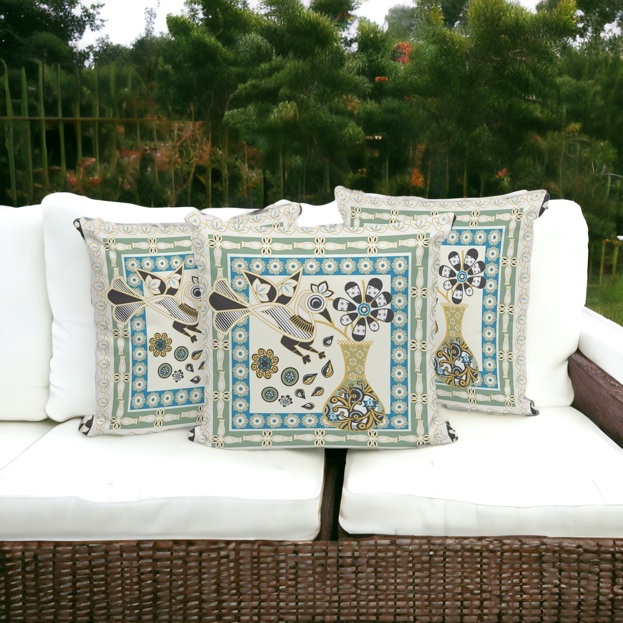 Love Your Vase Peacock Indoor/Outdoor Set of 3 Pillows in Cream Blue Yellow