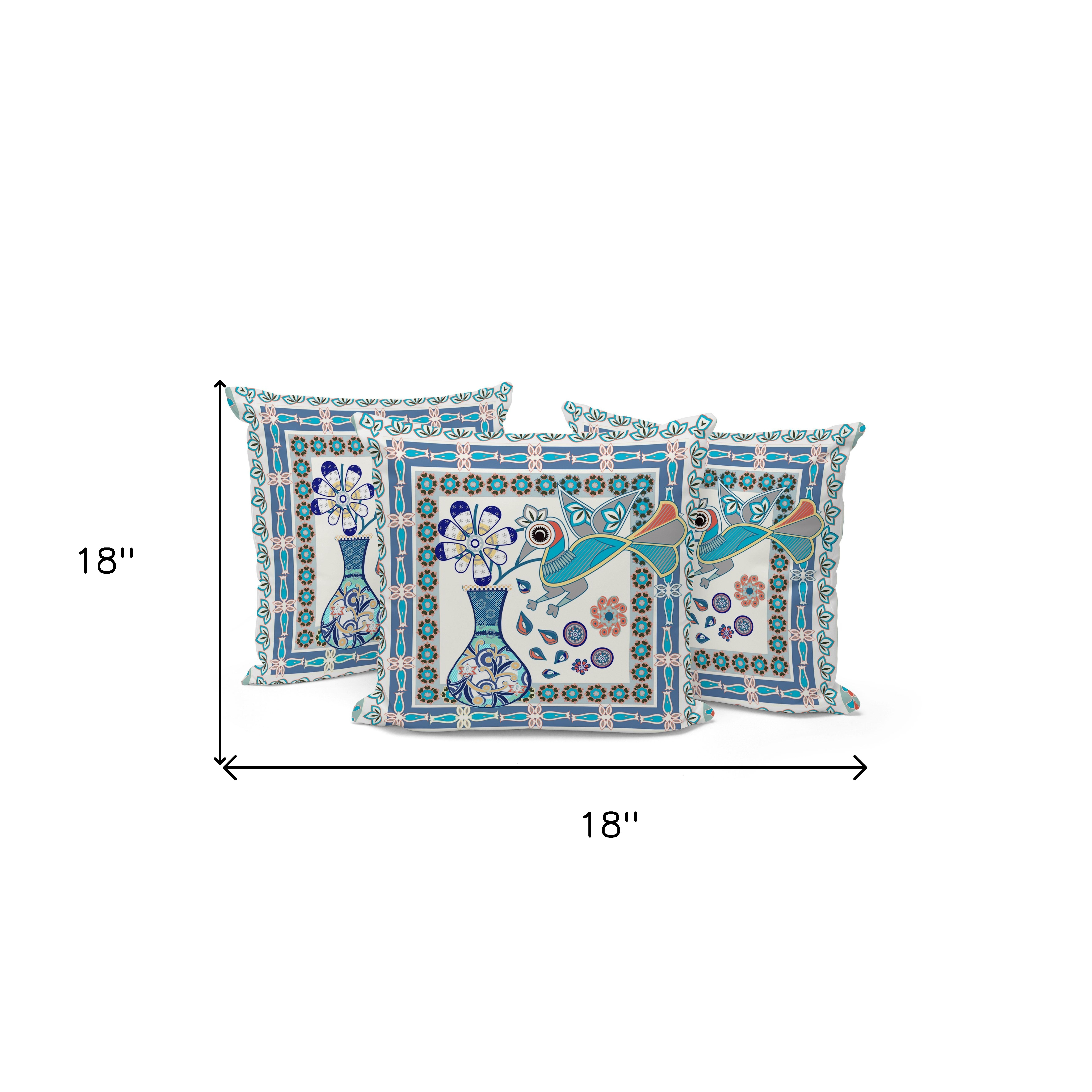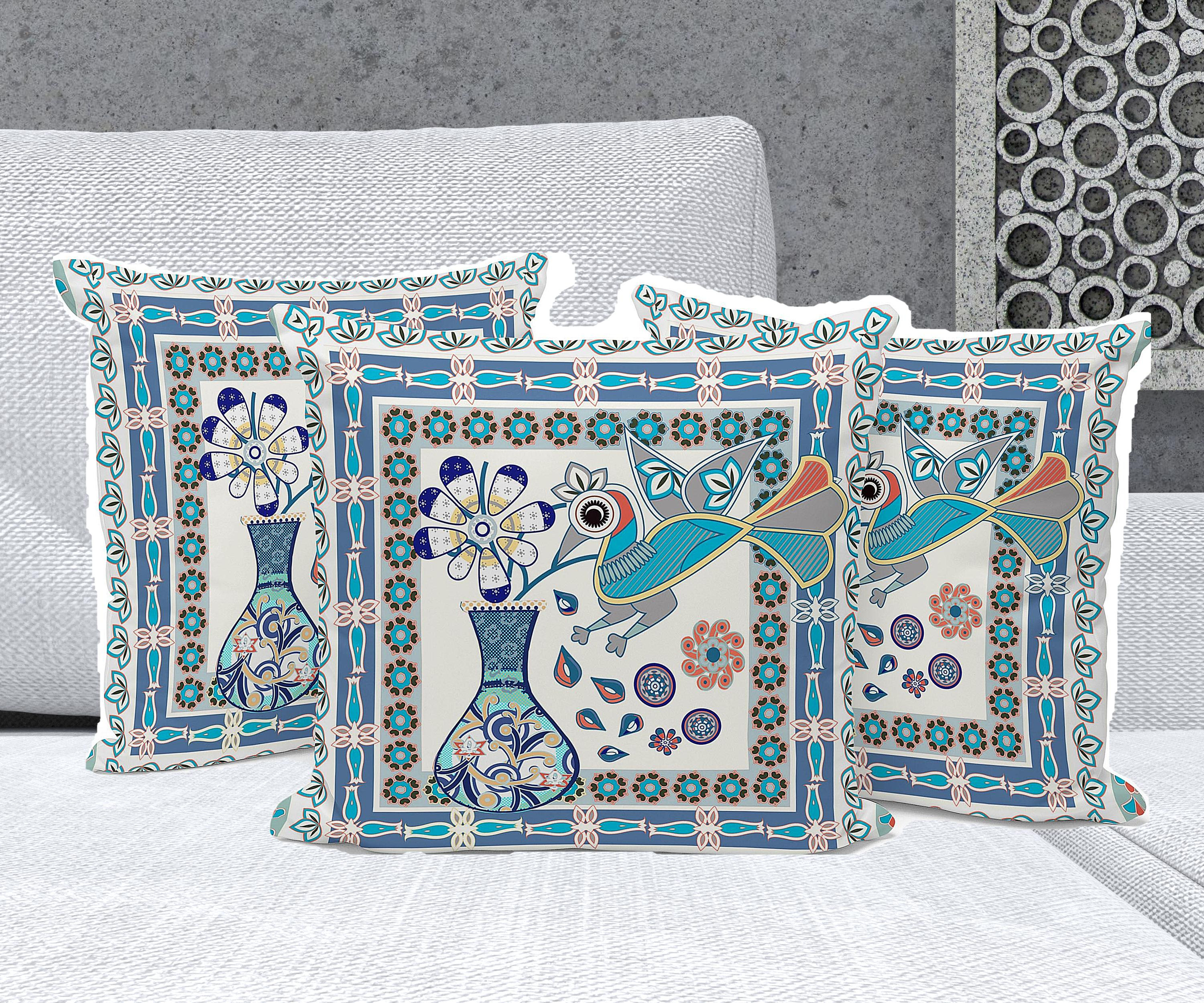 Love Your Vase Peacock Indoor/Outdoor Set of 3 Pillows in Off-White Blue Gray