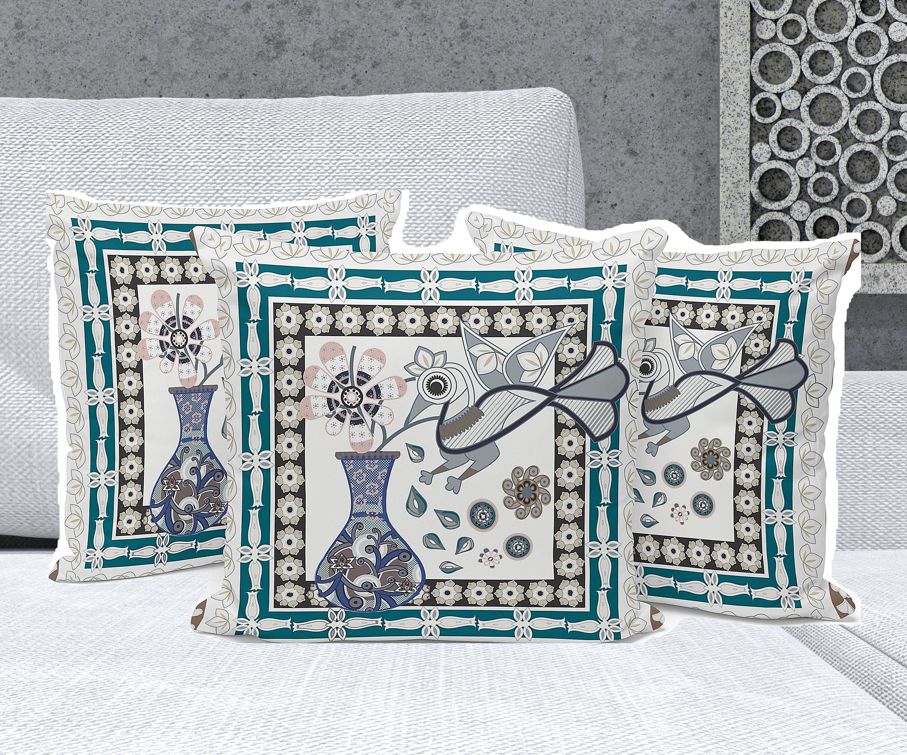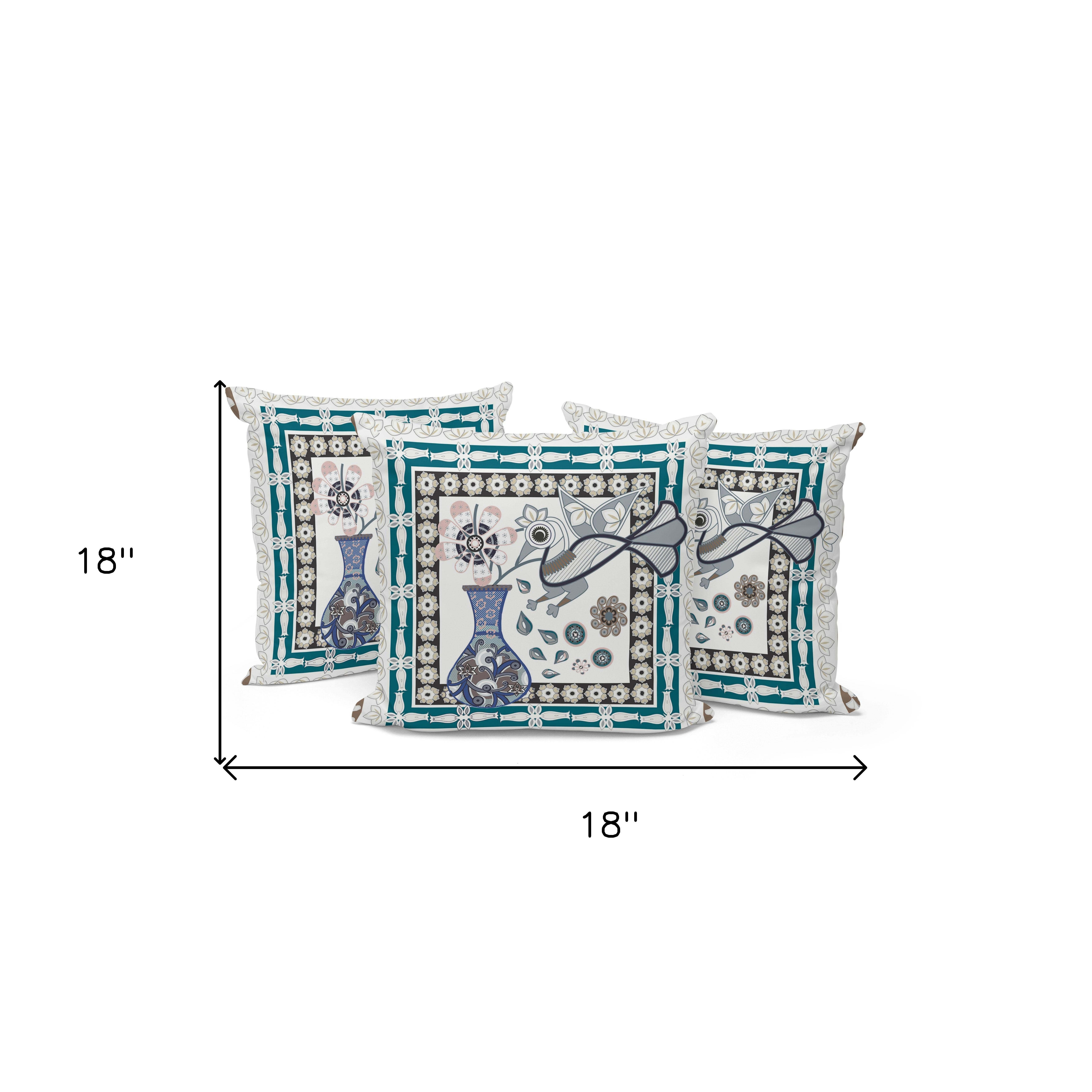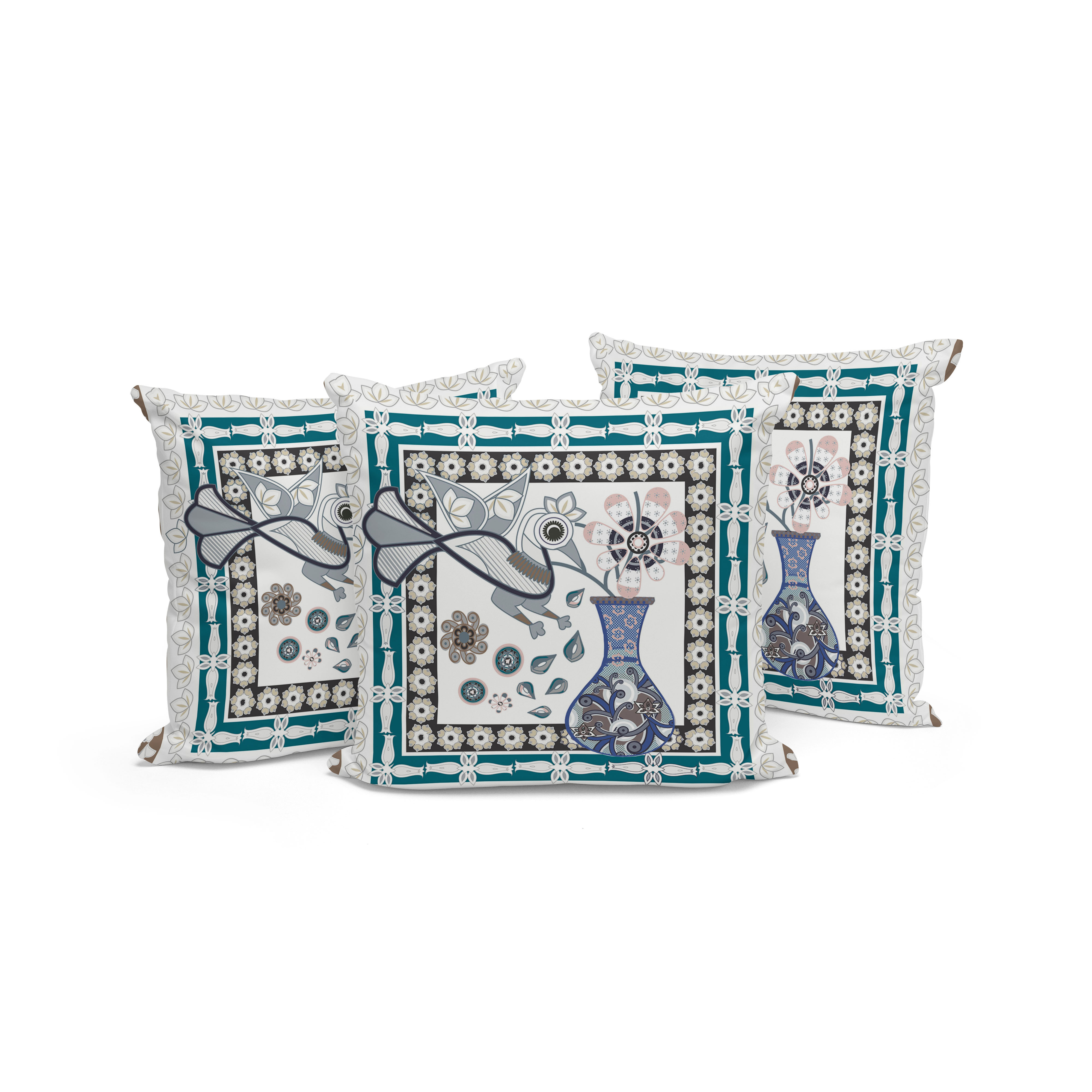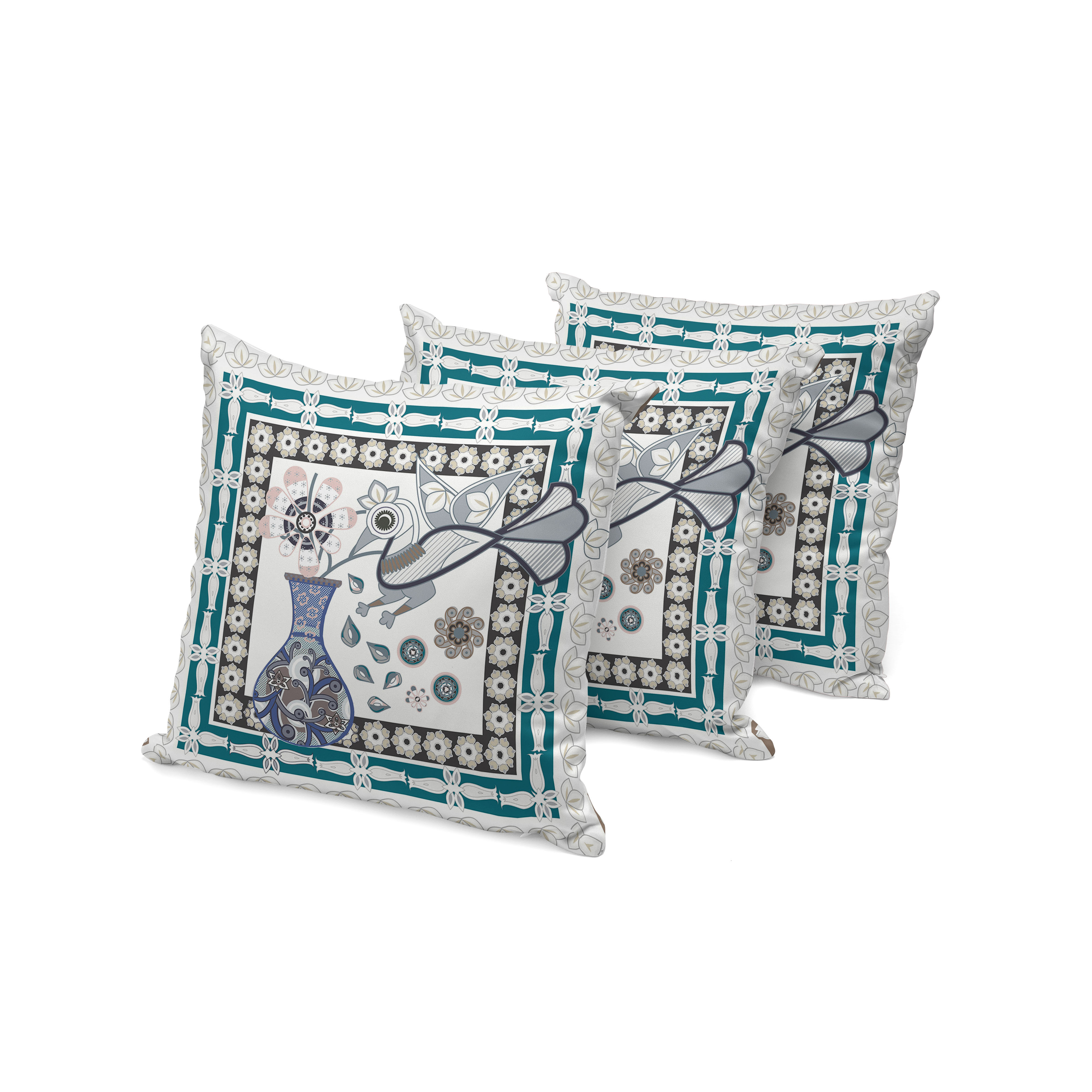 Love Your Vase Peacock Indoor/Outdoor Set of 3 Pillows in Off-White Dark Aqua Beige