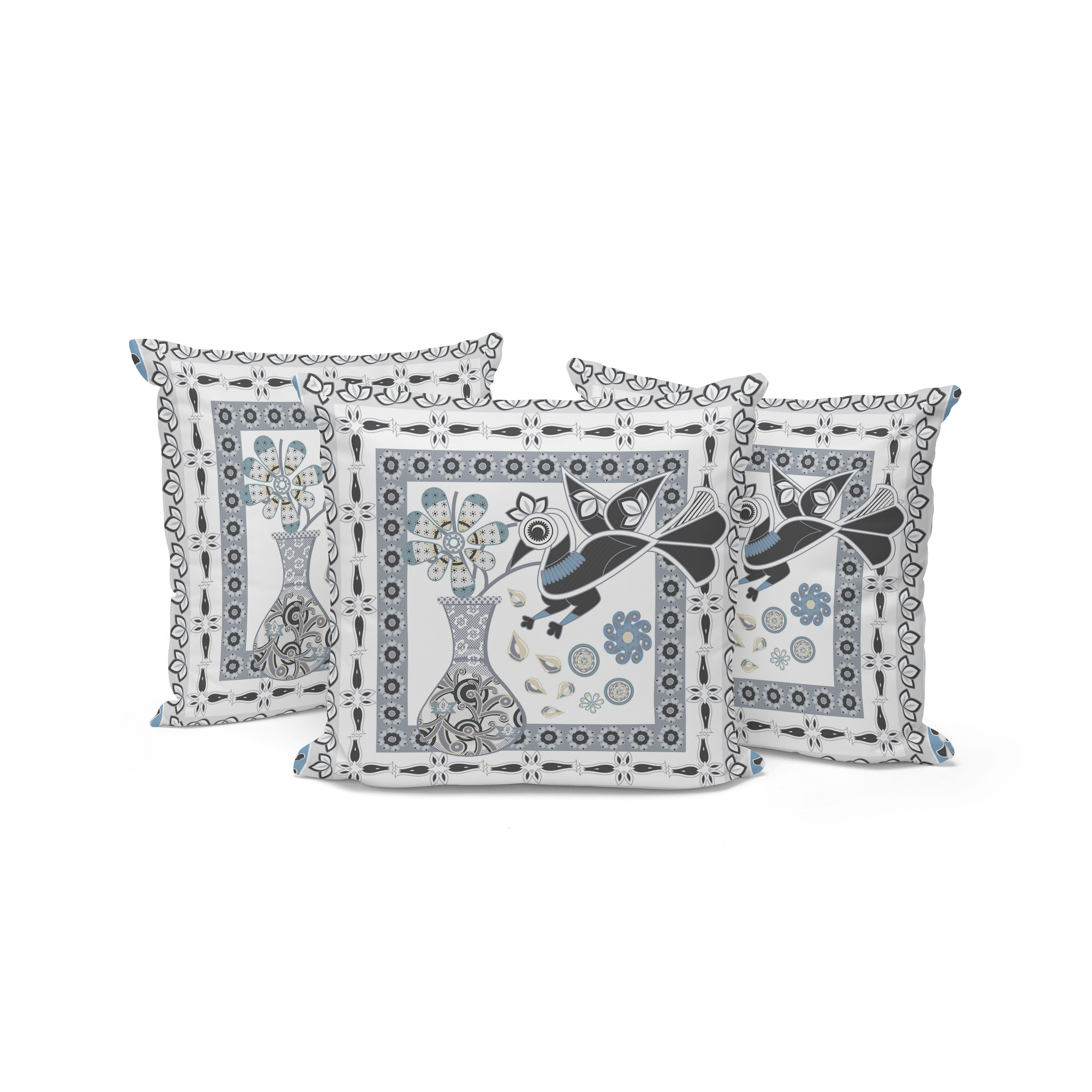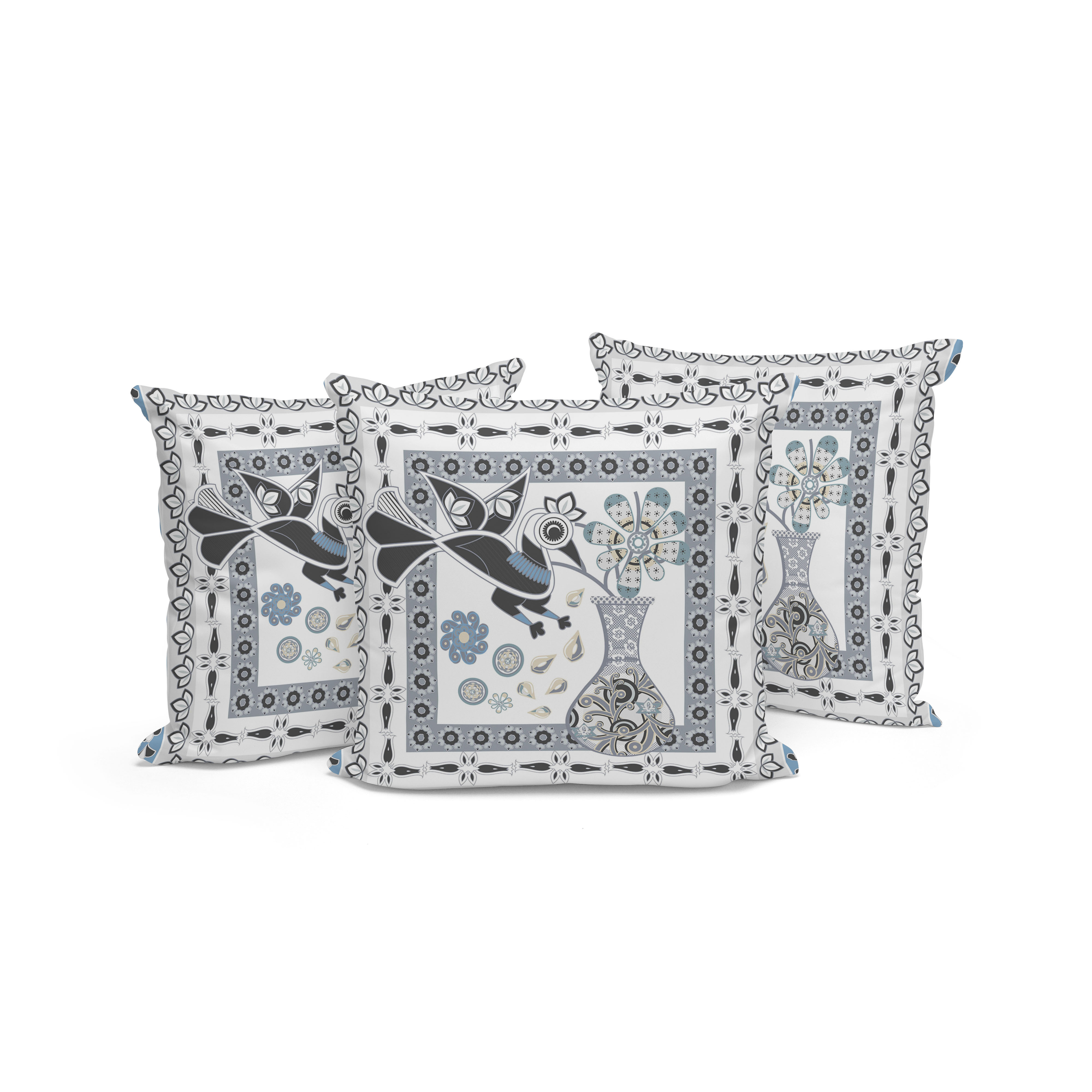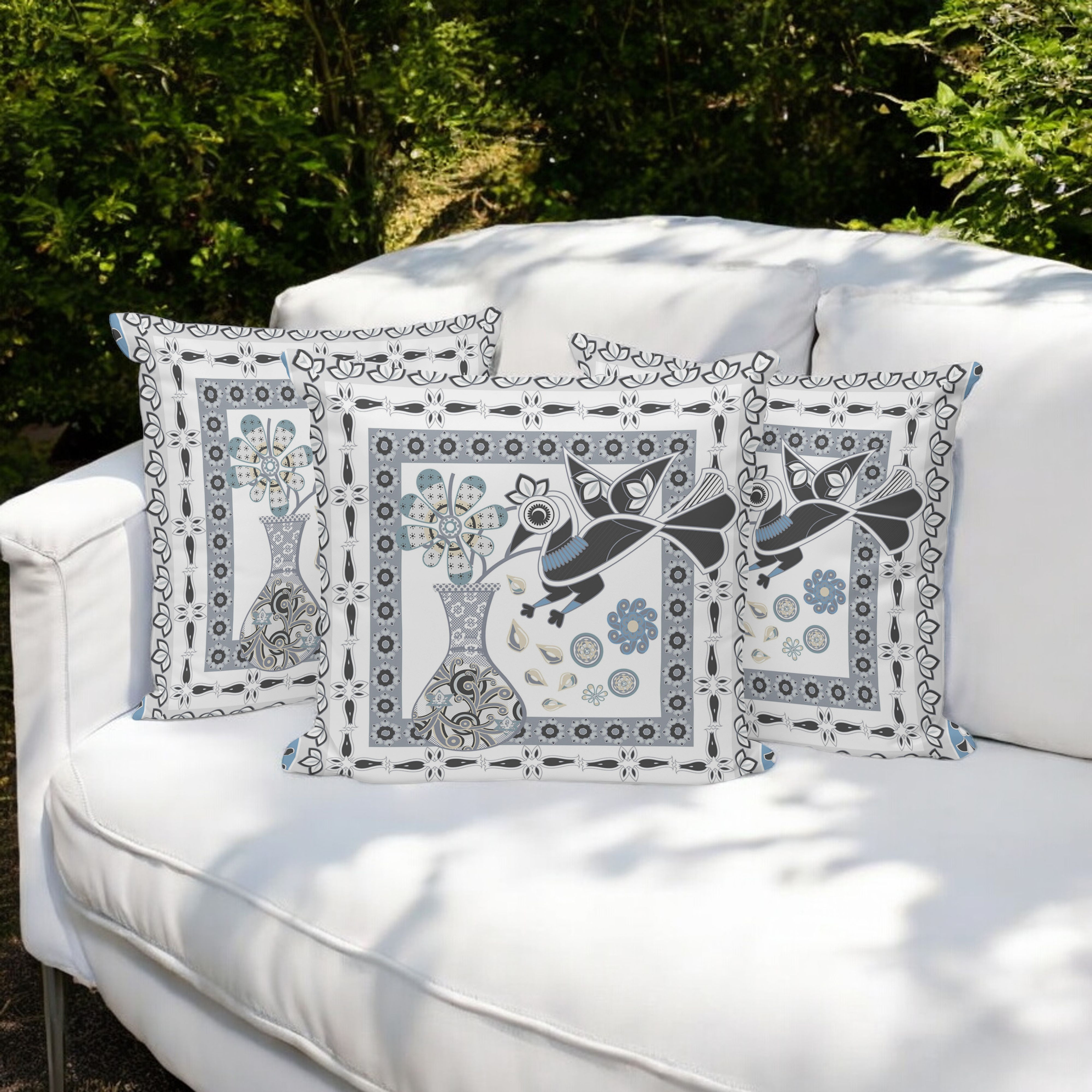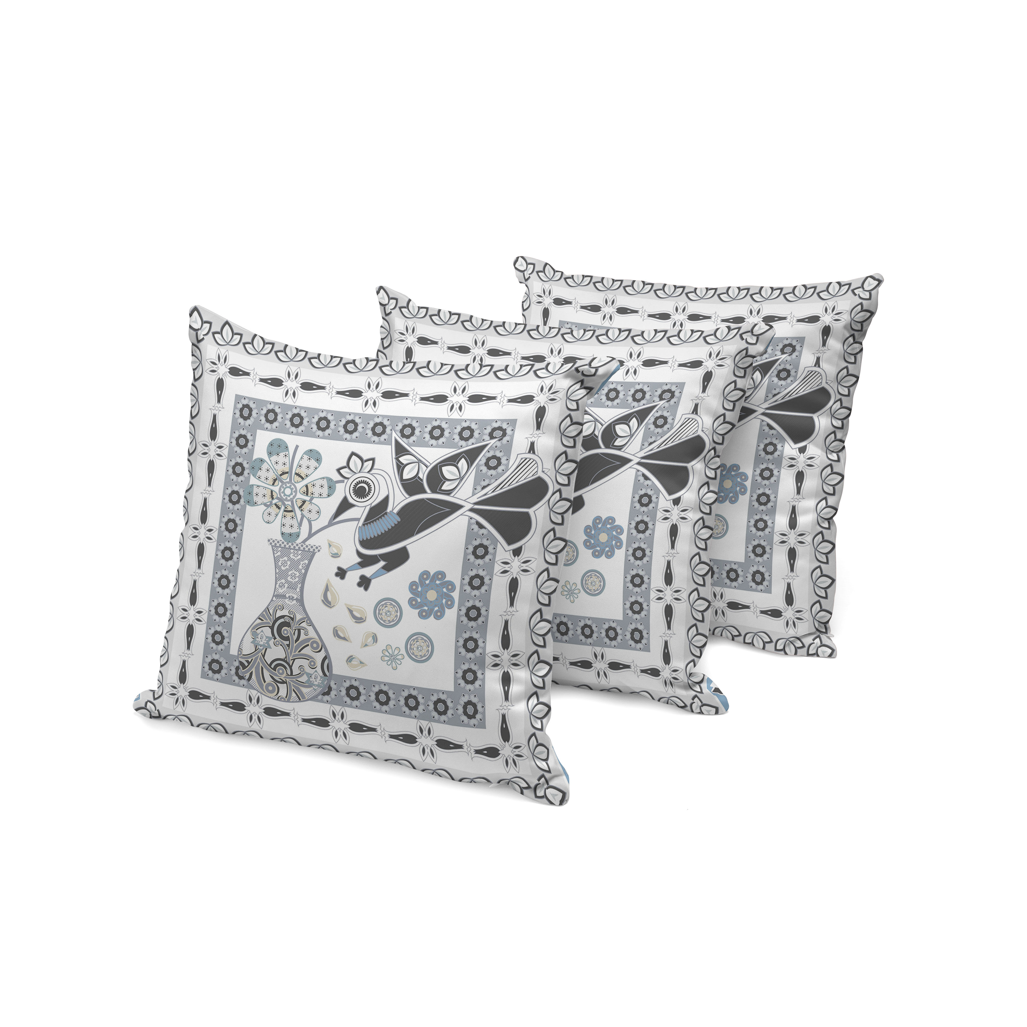 Love Your Vase Peacock Indoor/Outdoor Set of 3 Pillows in White Black Gray Blue