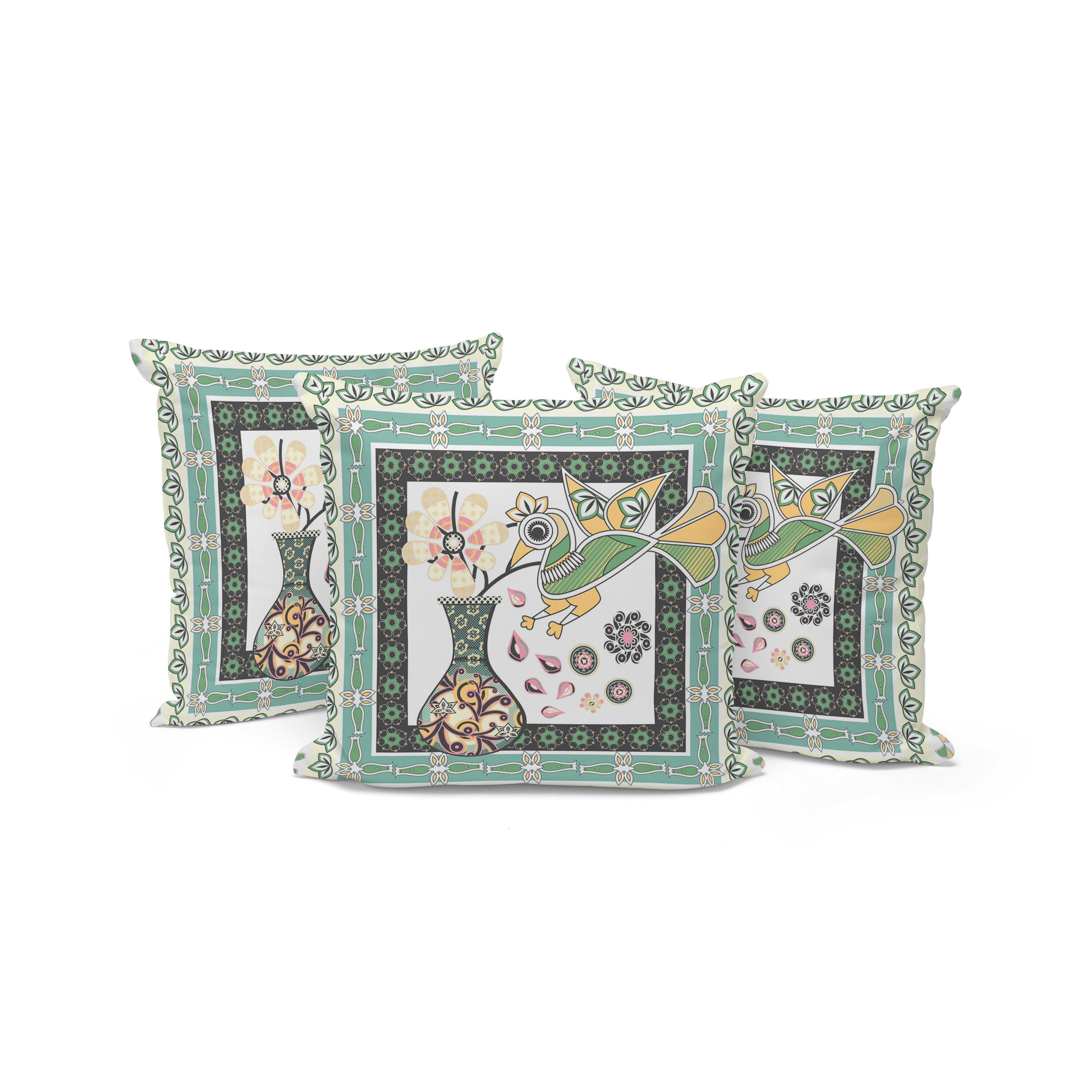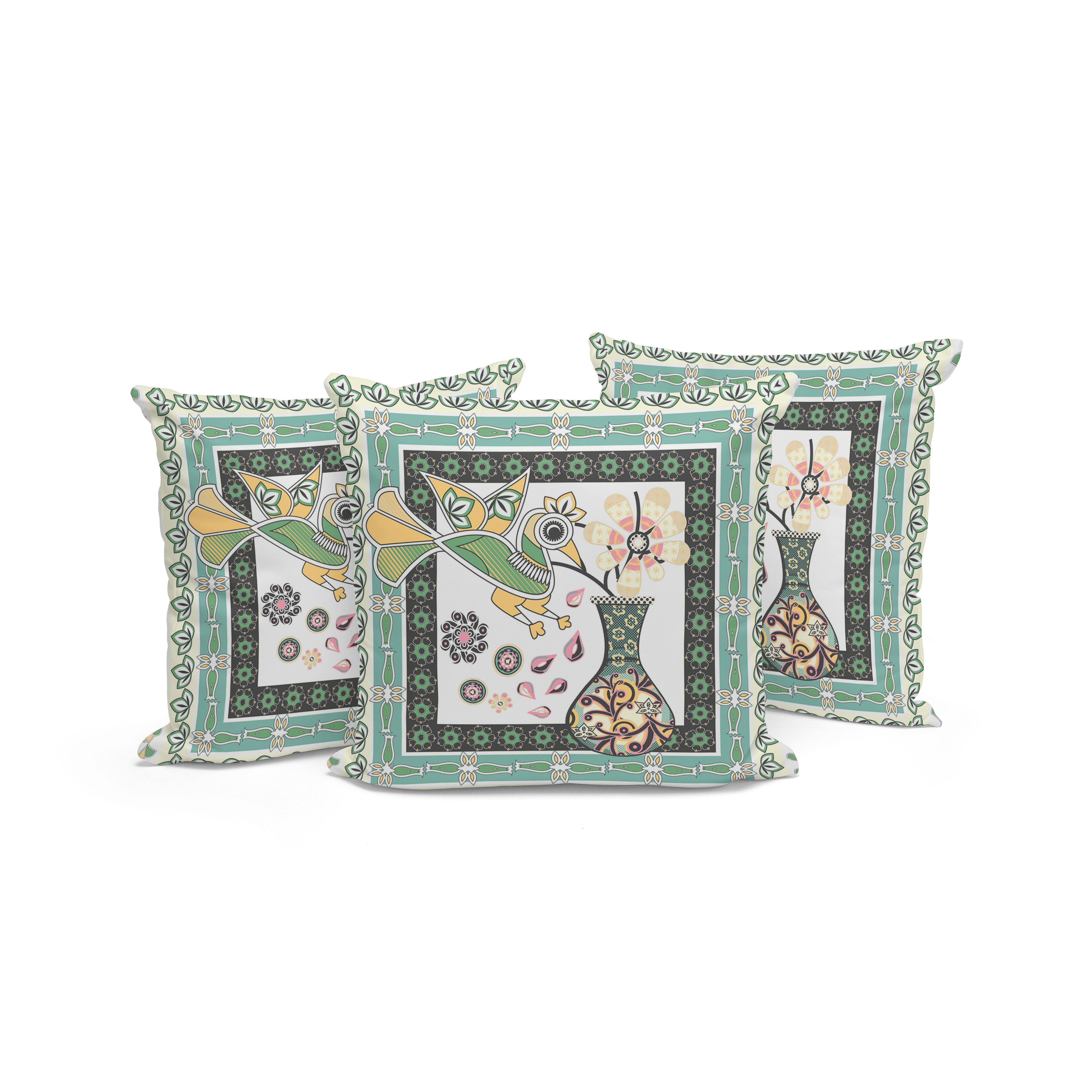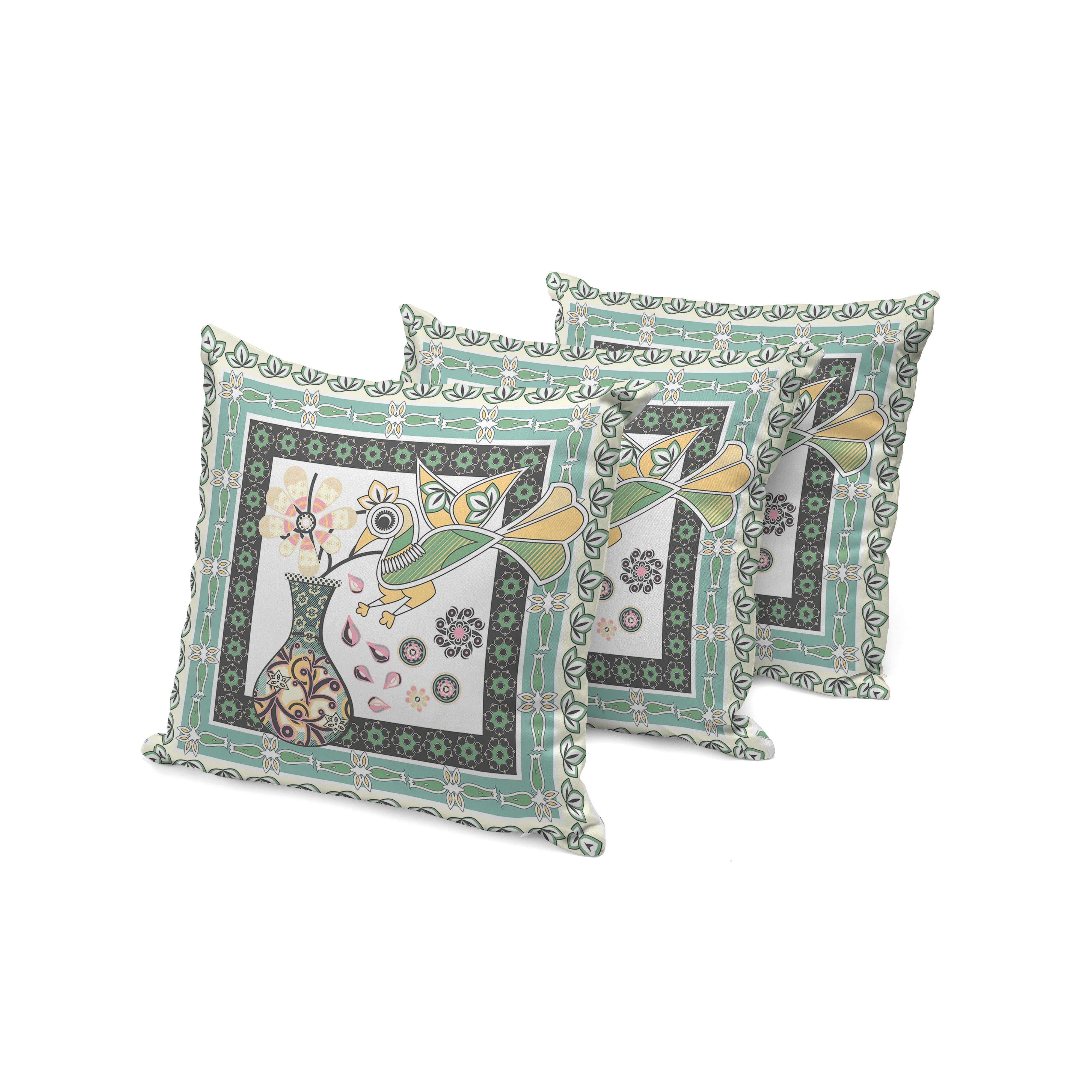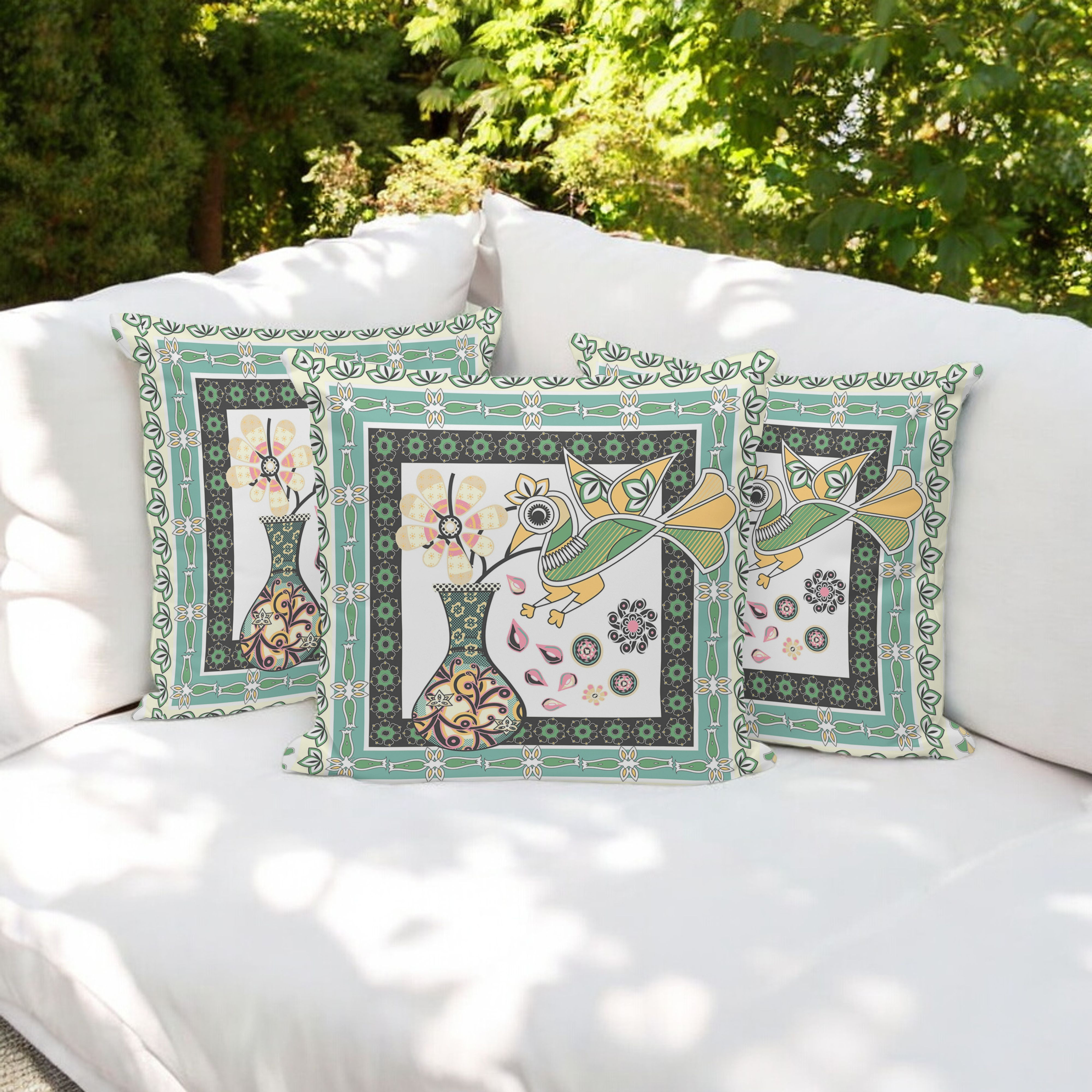Love Your Vase Peacock Indoor/Outdoor Set of 3 Pillows in White Black Yellow Green