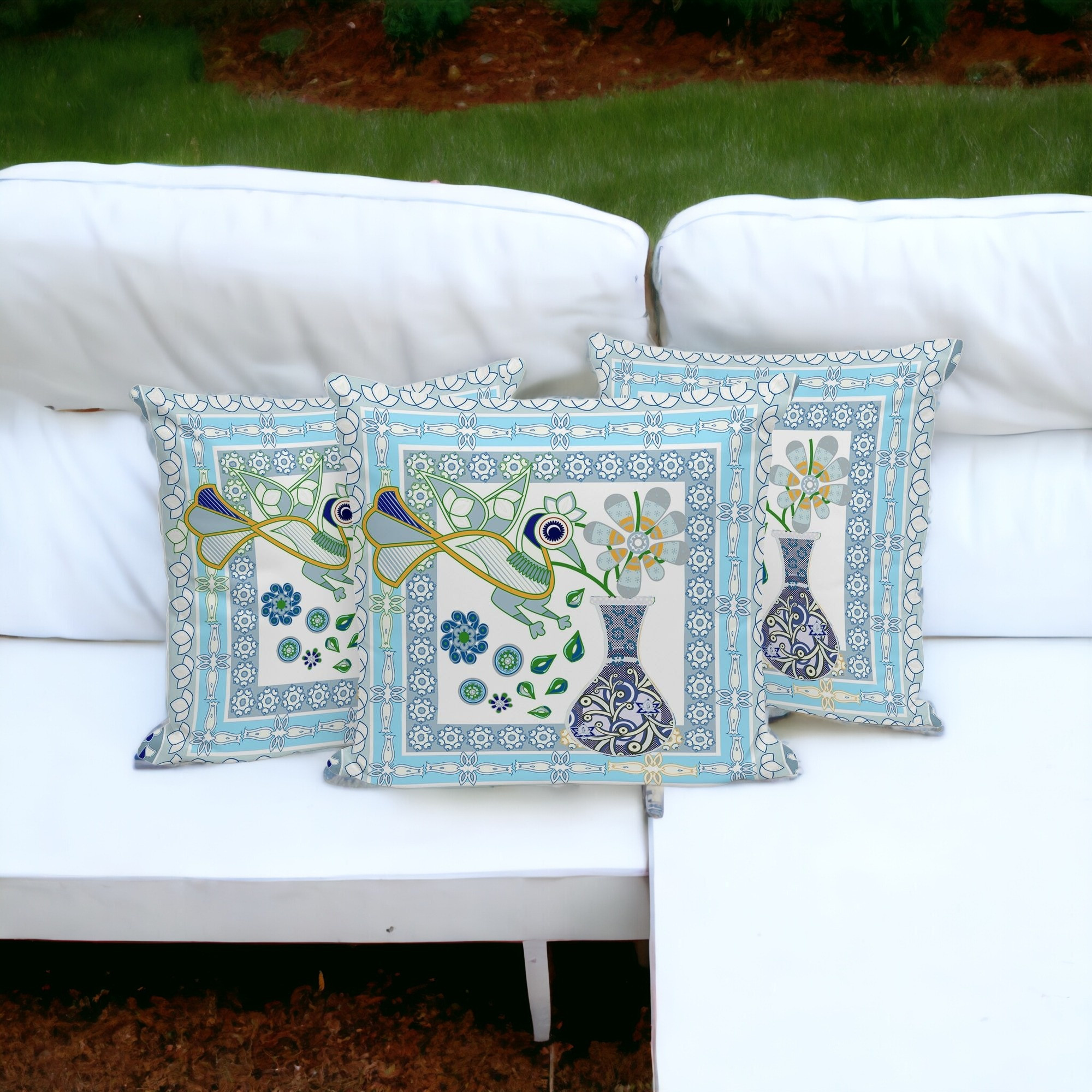 Love Your Vase Peacock Indoor/Outdoor Set of 3 Pillows in White Gold Gray