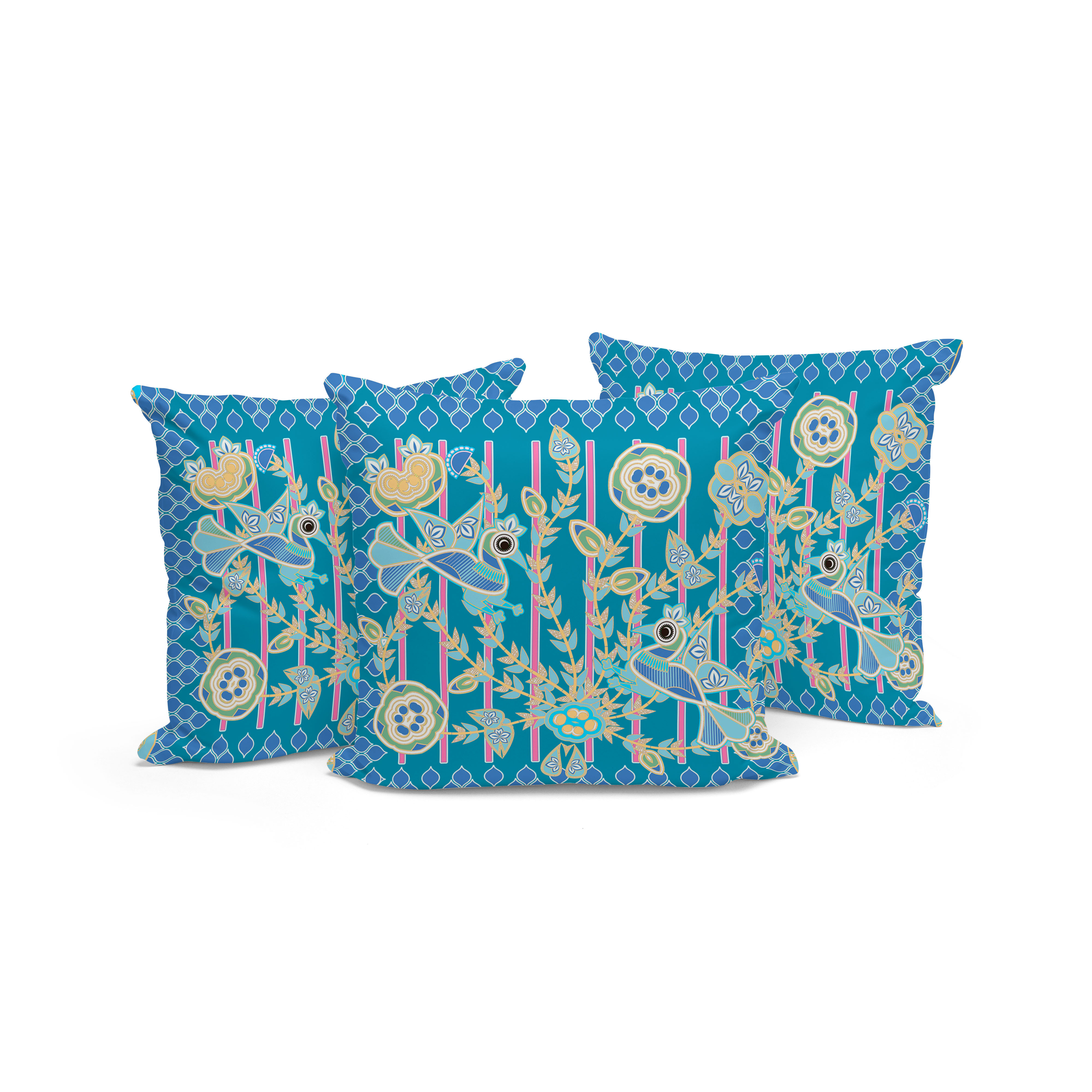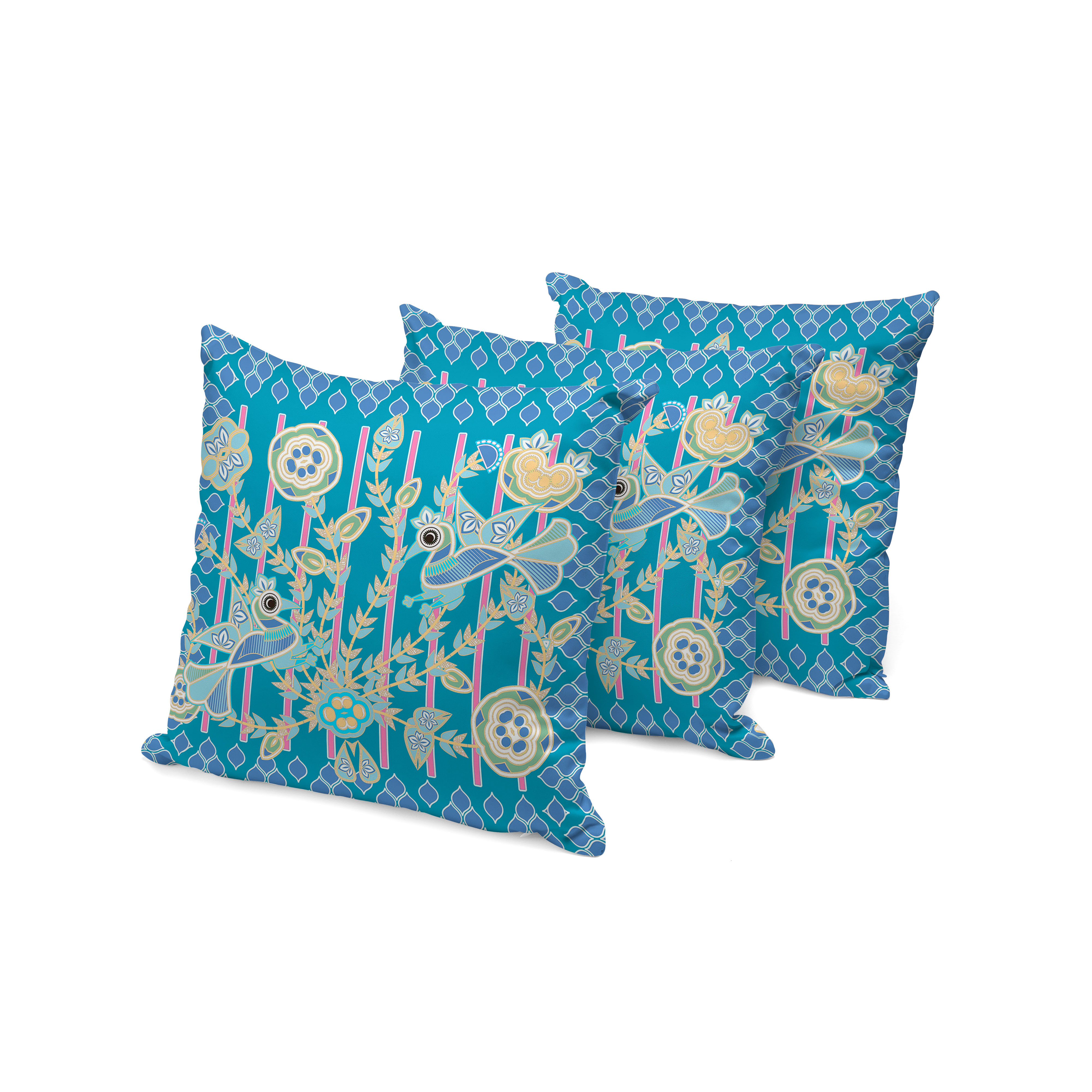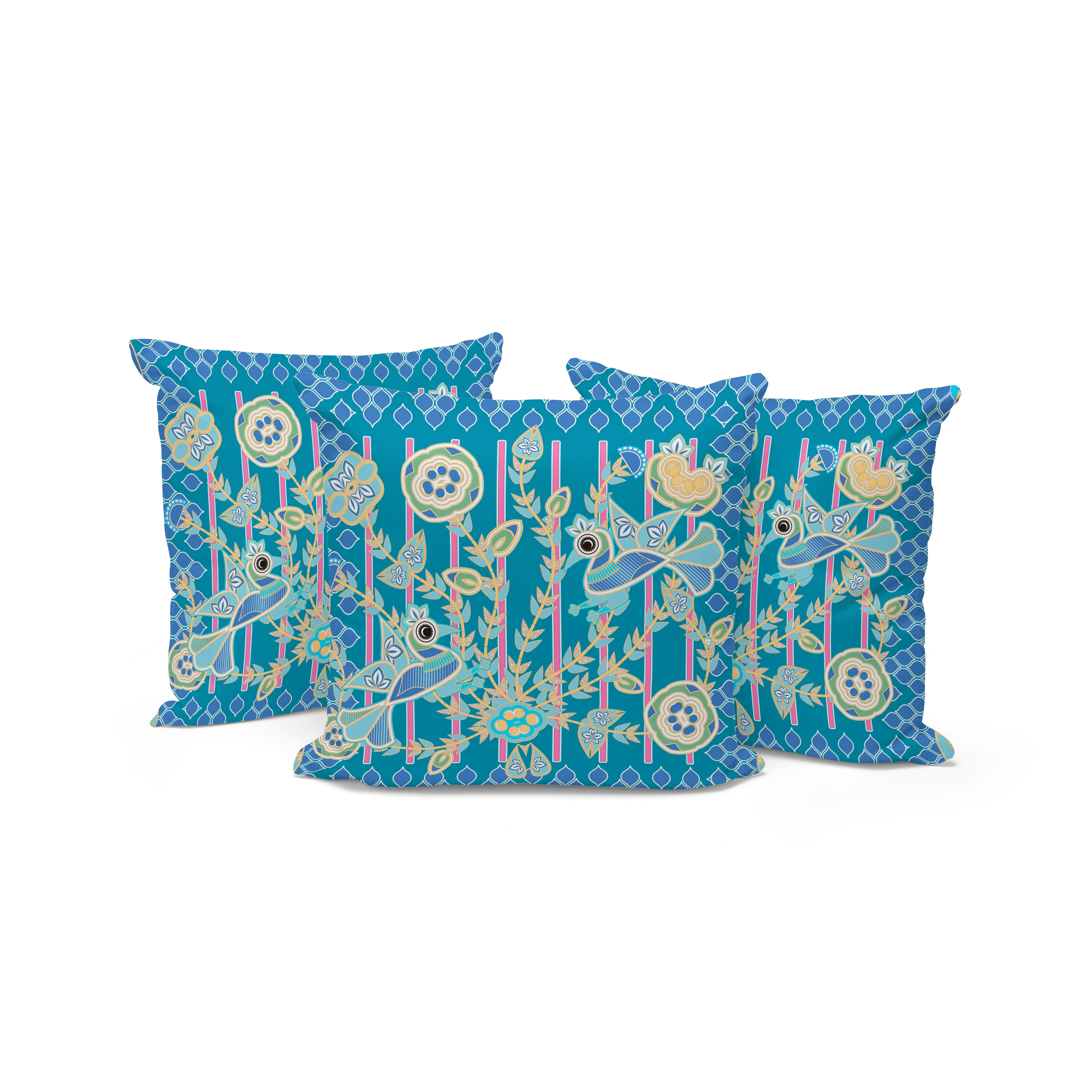 Pond Peacock Indoor/Outdoor Set of 3 Pillows in Blue Gold Green