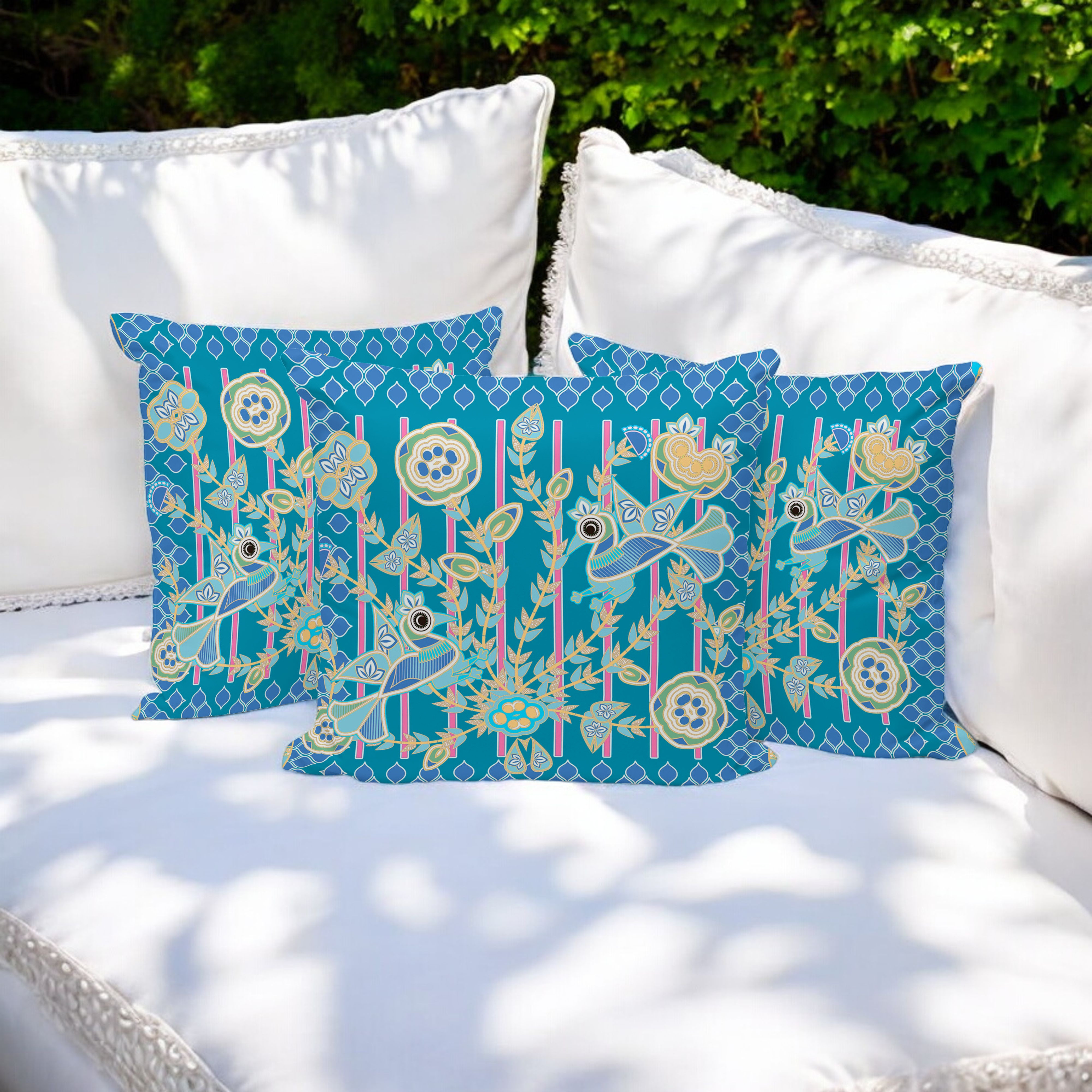 Set of Three Blue Peacock Indoor Outdoor Throw Pillow
