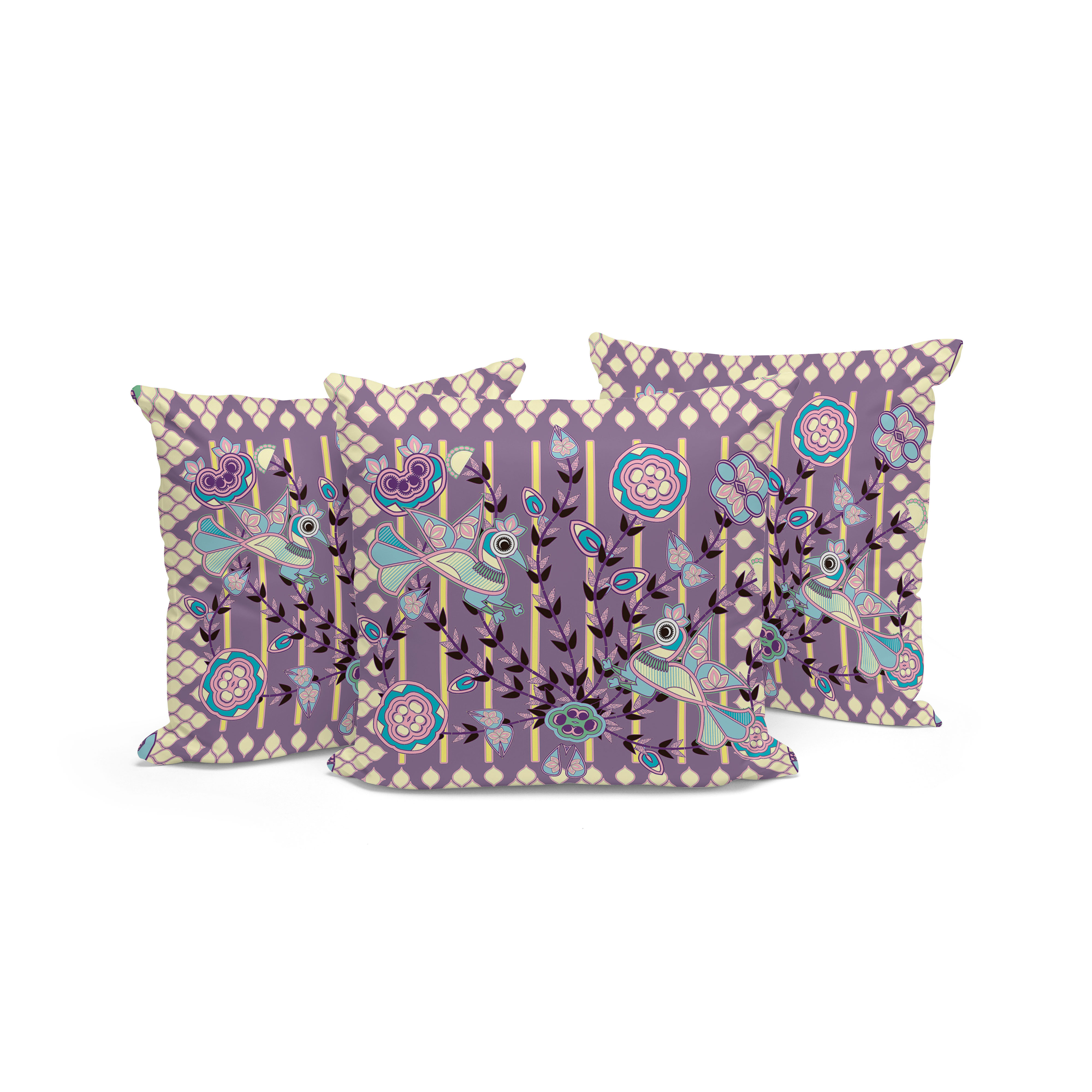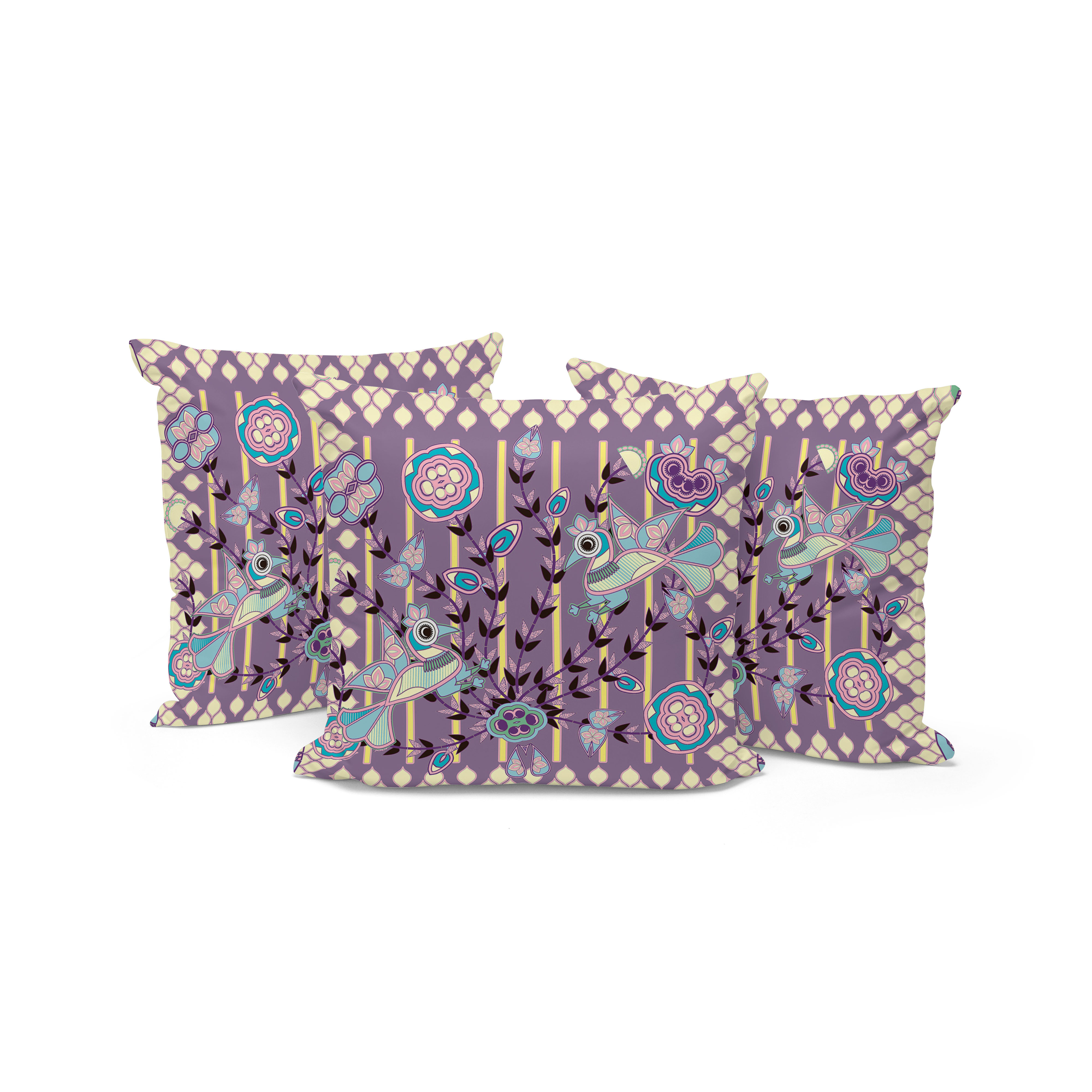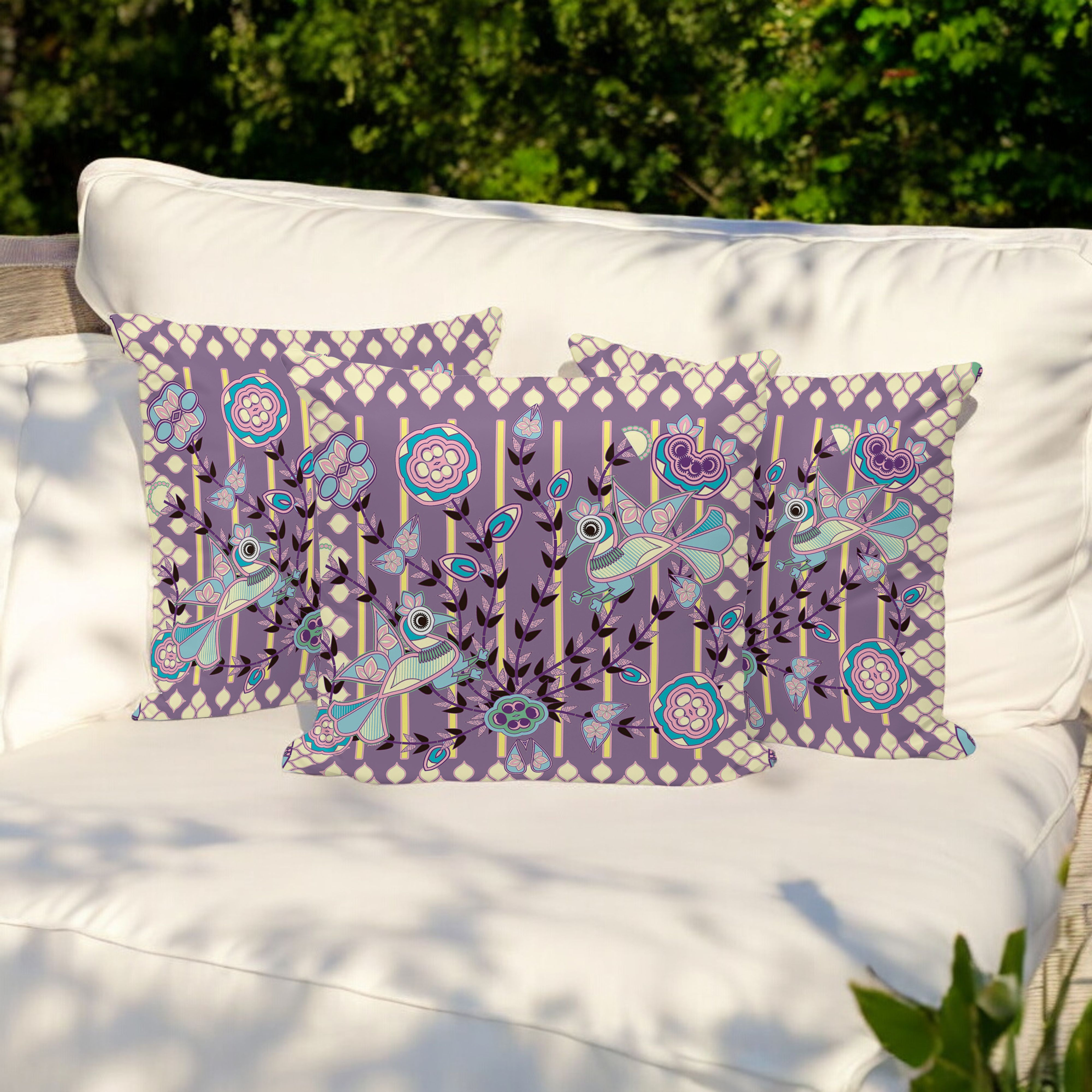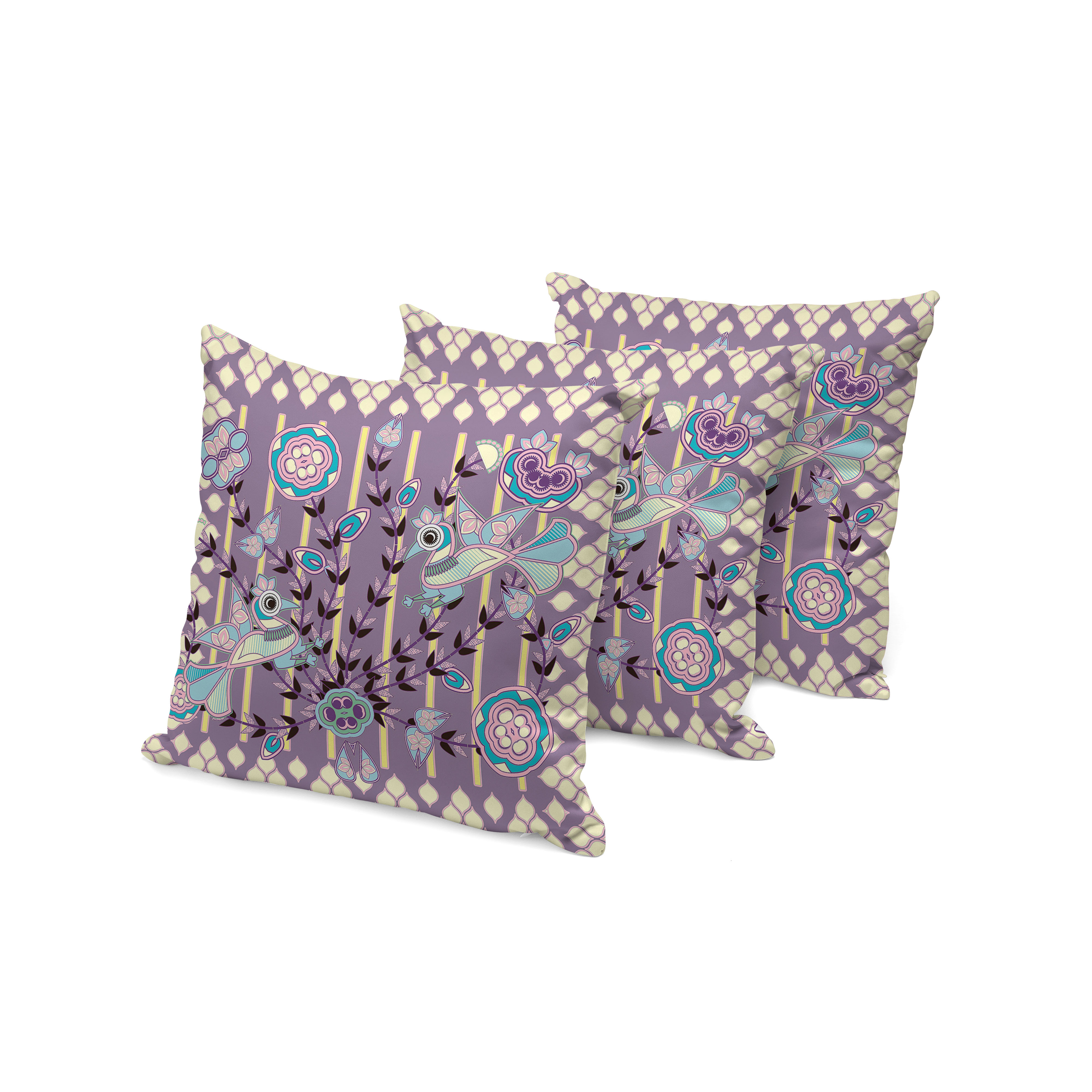 Pond Peacock Indoor/Outdoor Set of 3 Pillows in Muted Purple Yellow