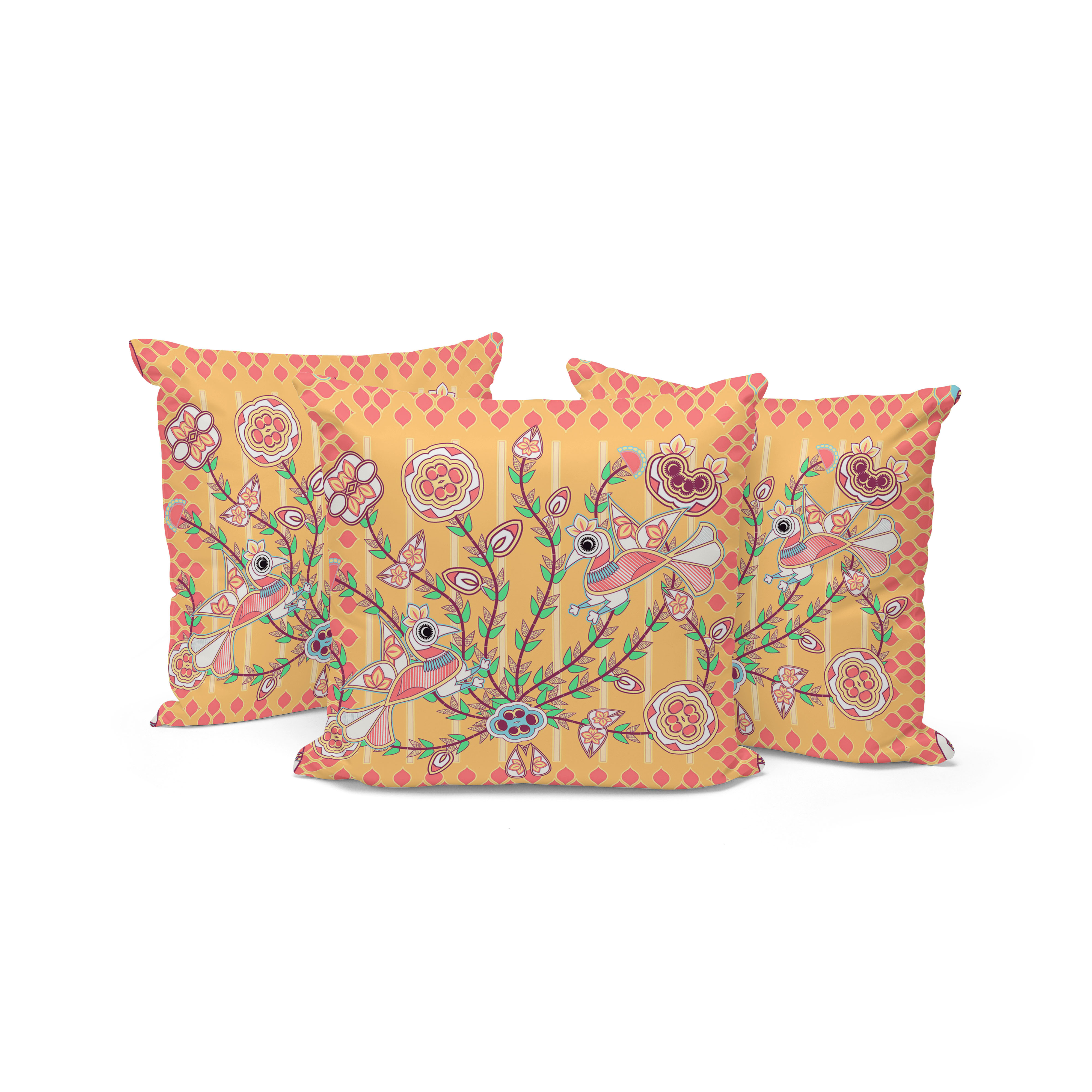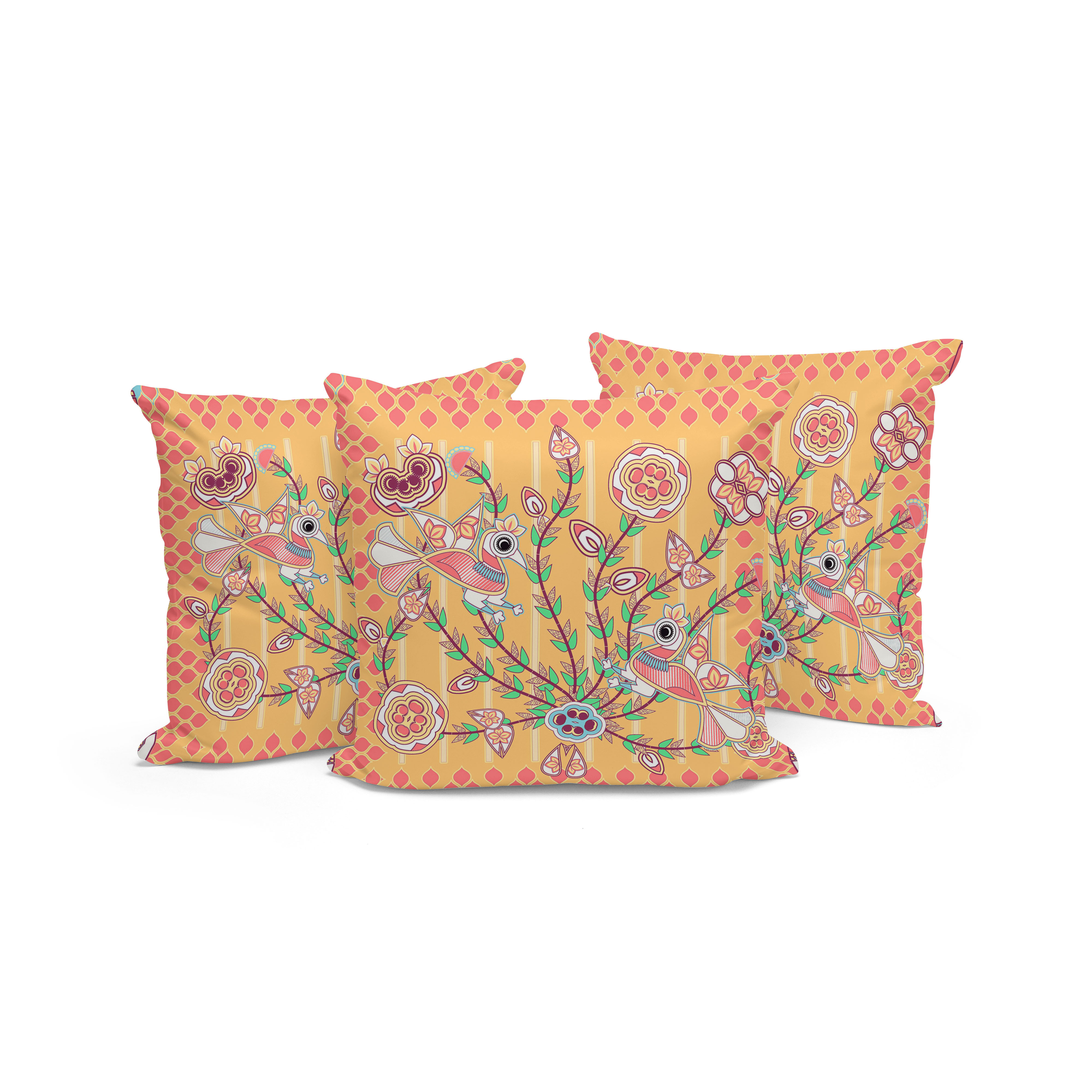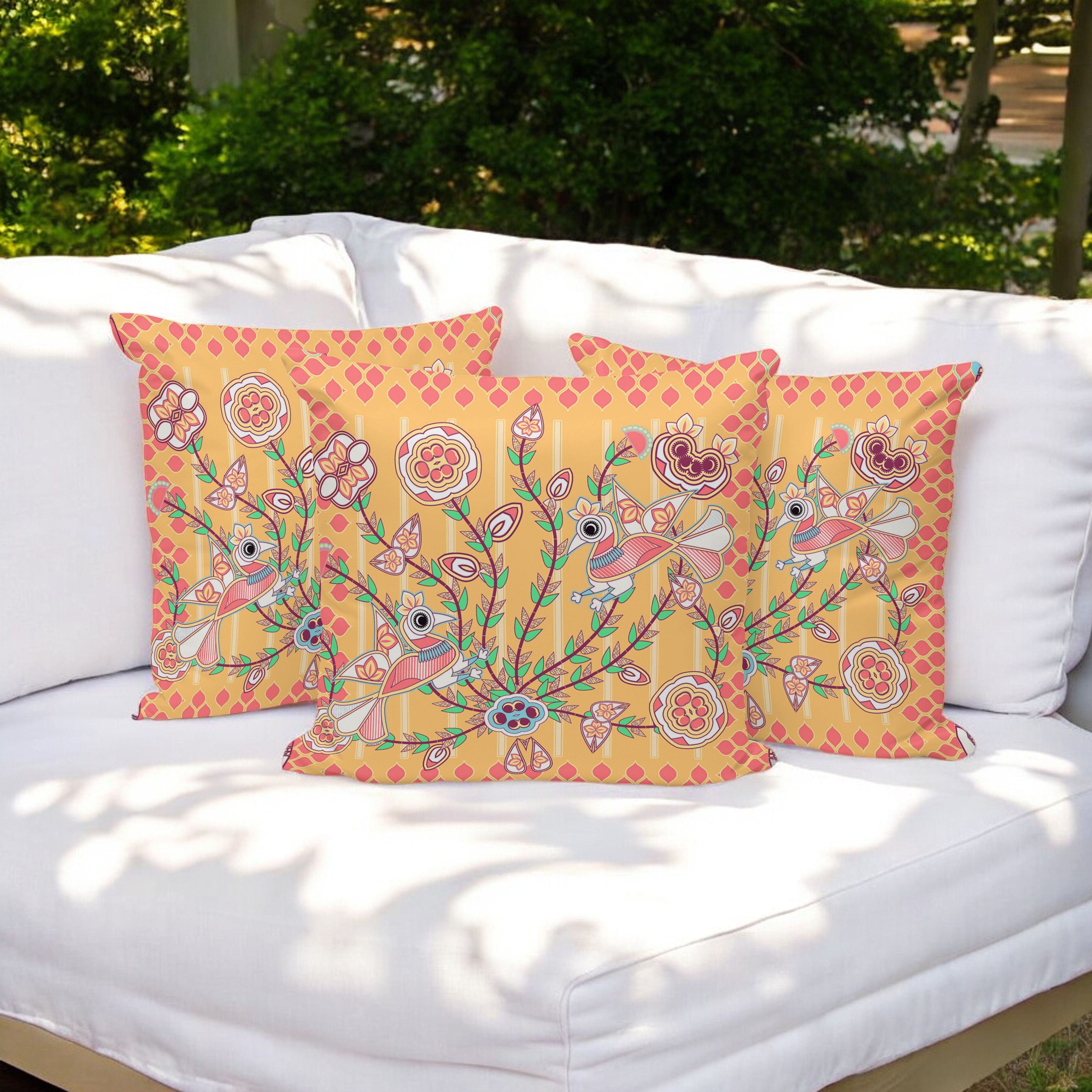 Set of Three Yellow Peacock Indoor Outdoor Throw Pillow
