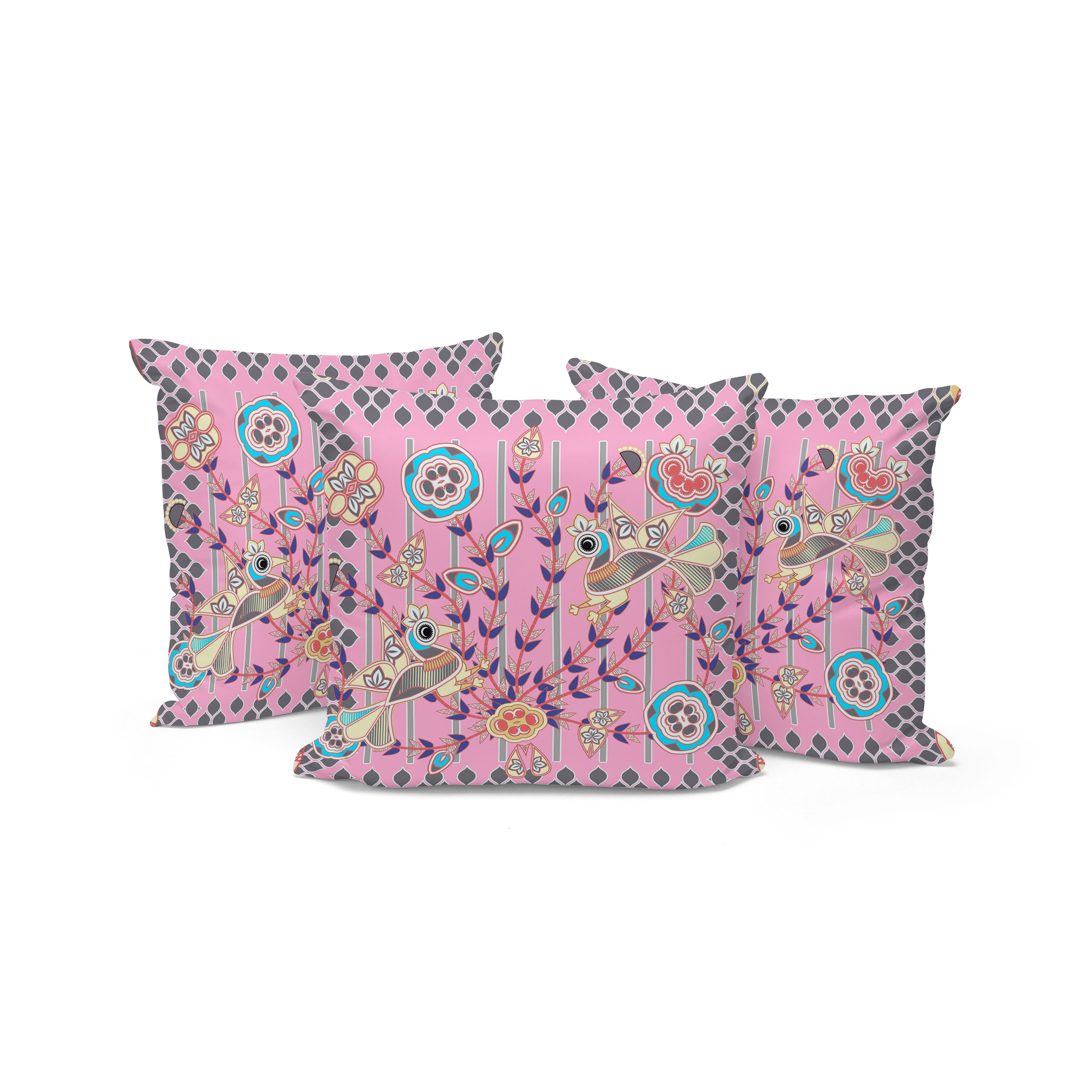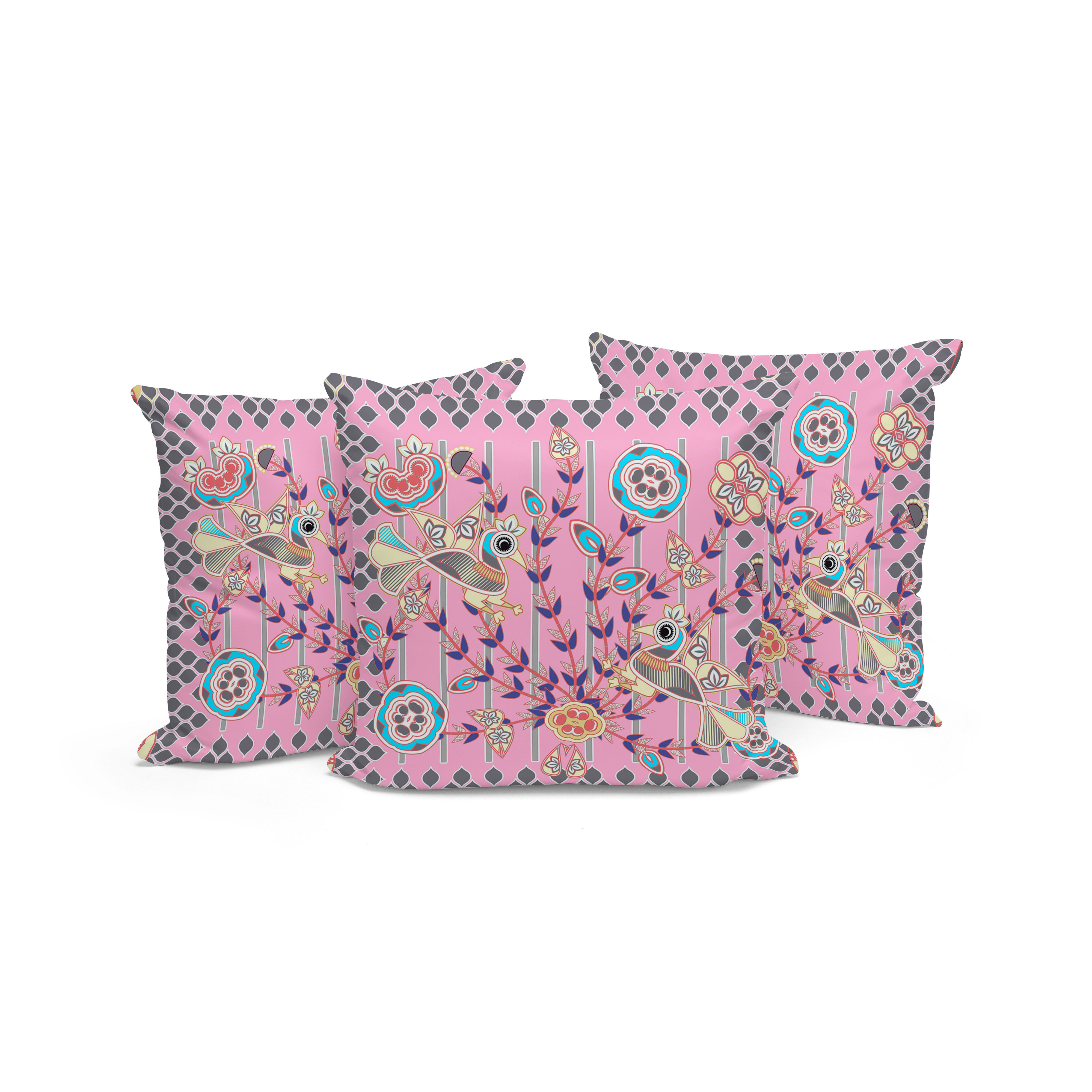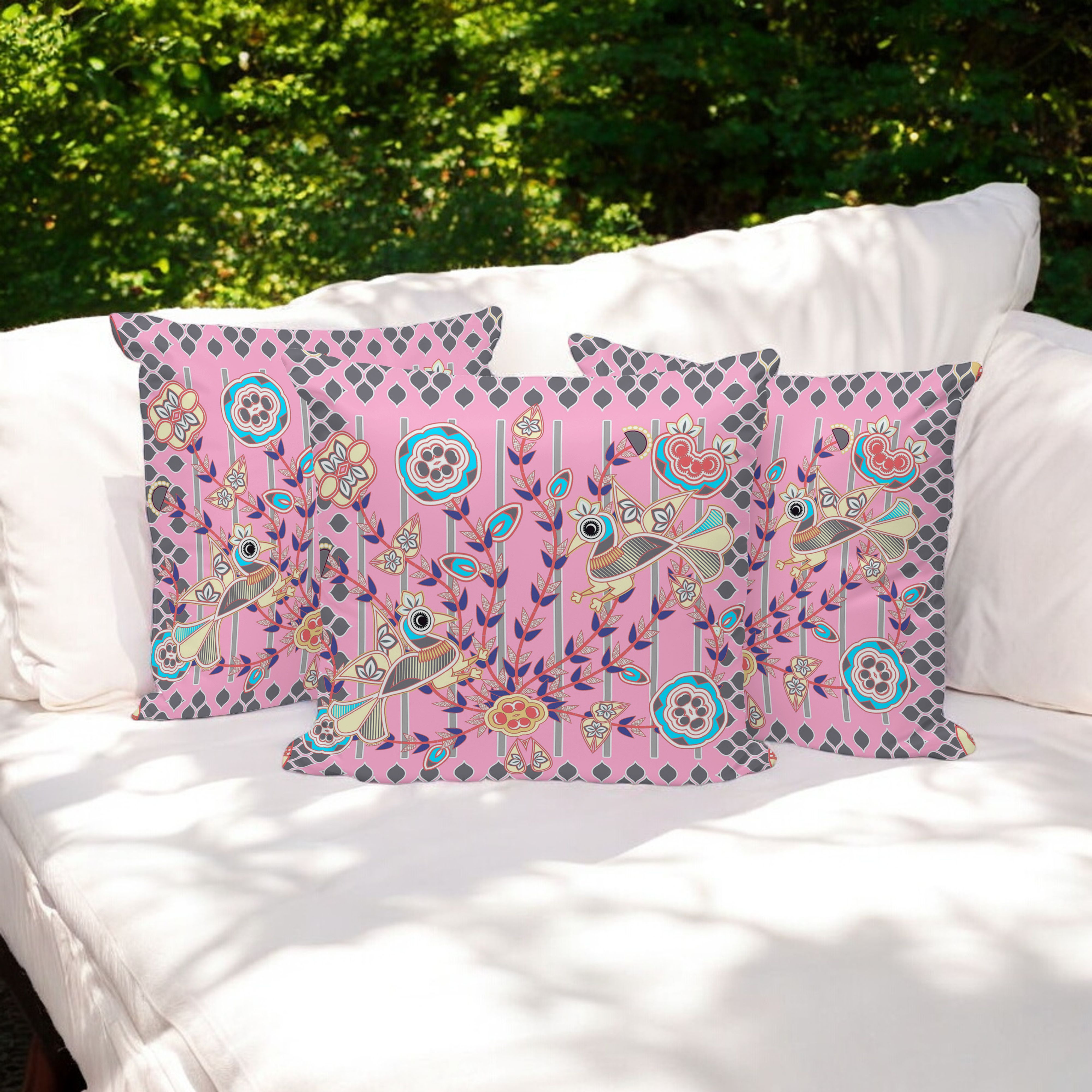 Set of Three Pink Peacock Indoor Outdoor Throw Pillow