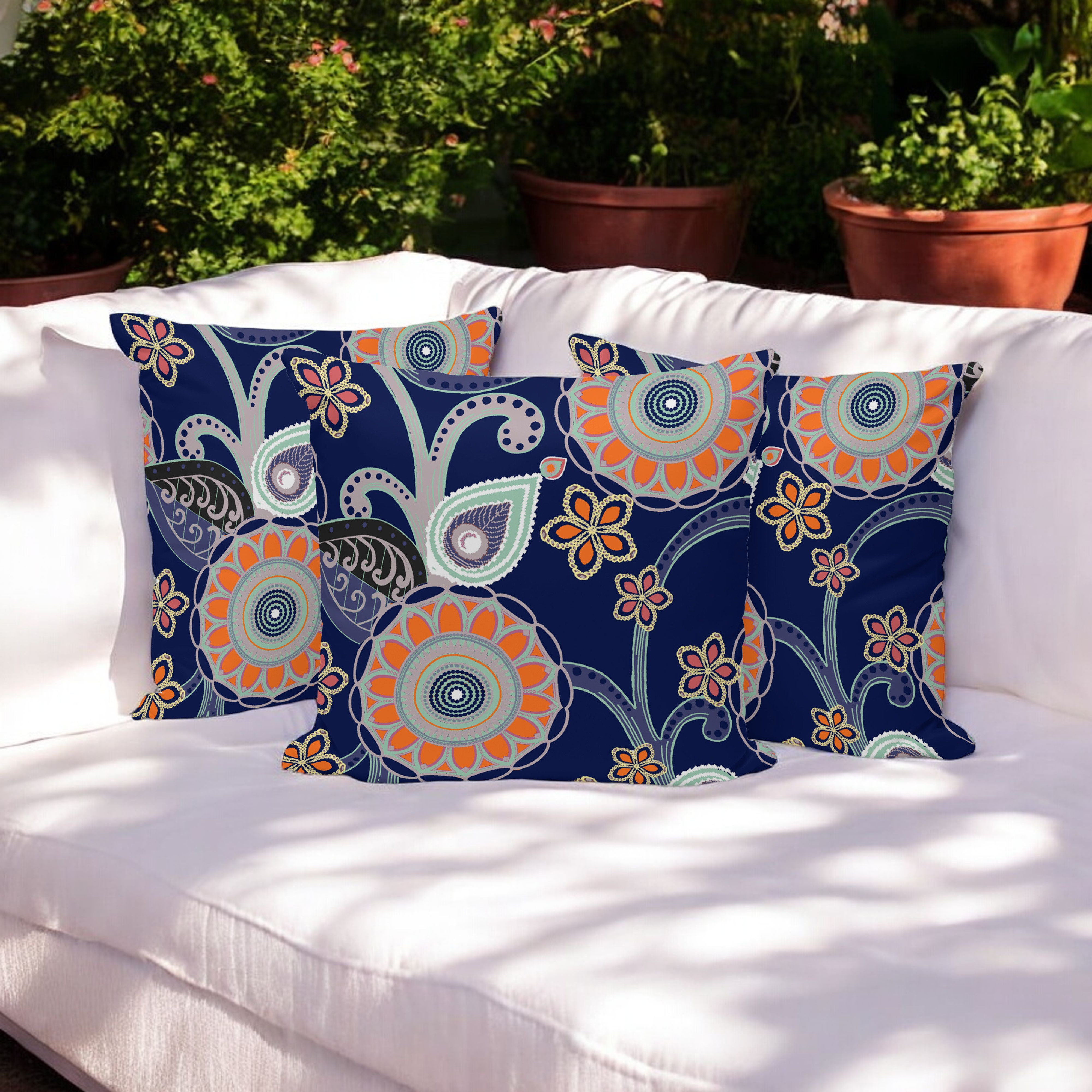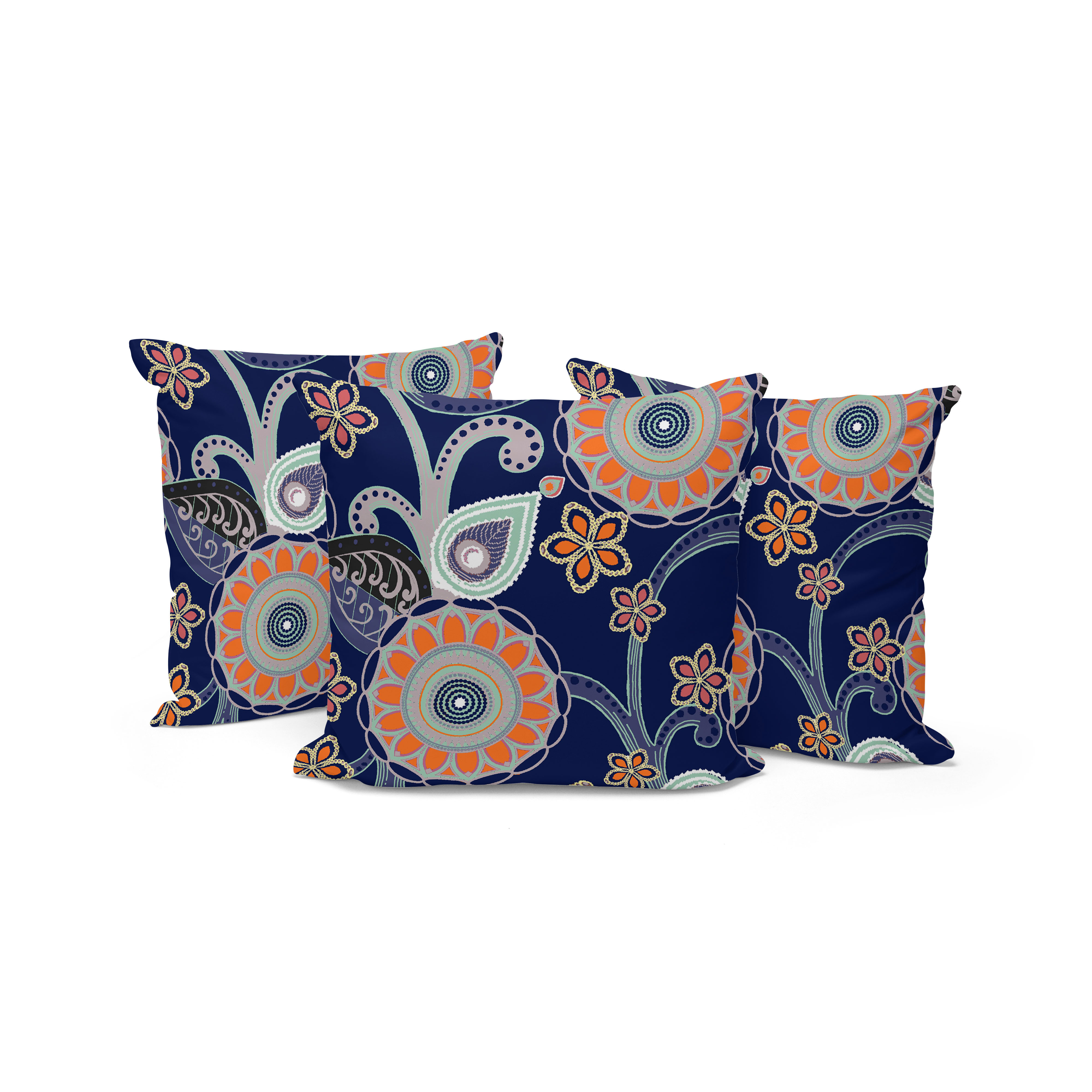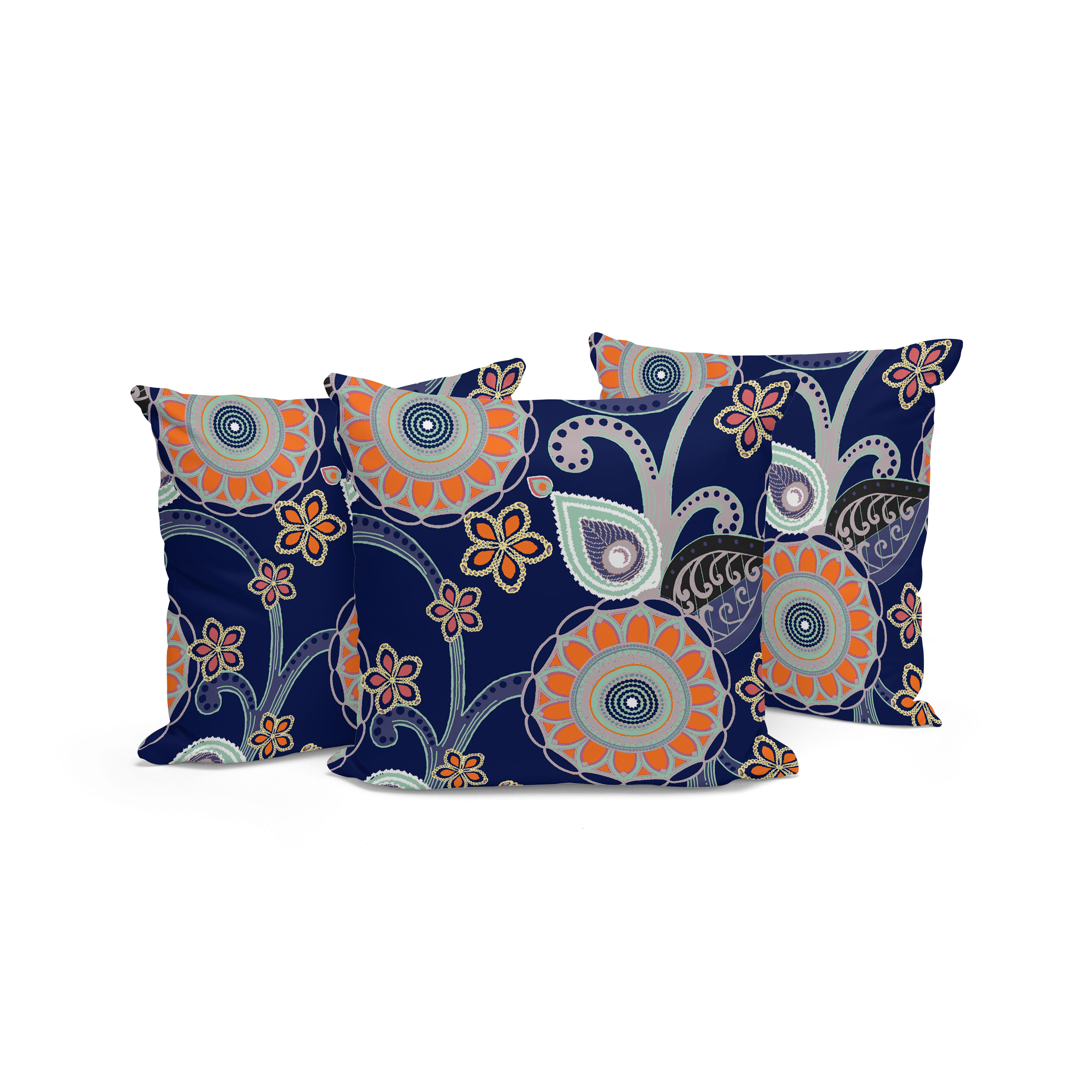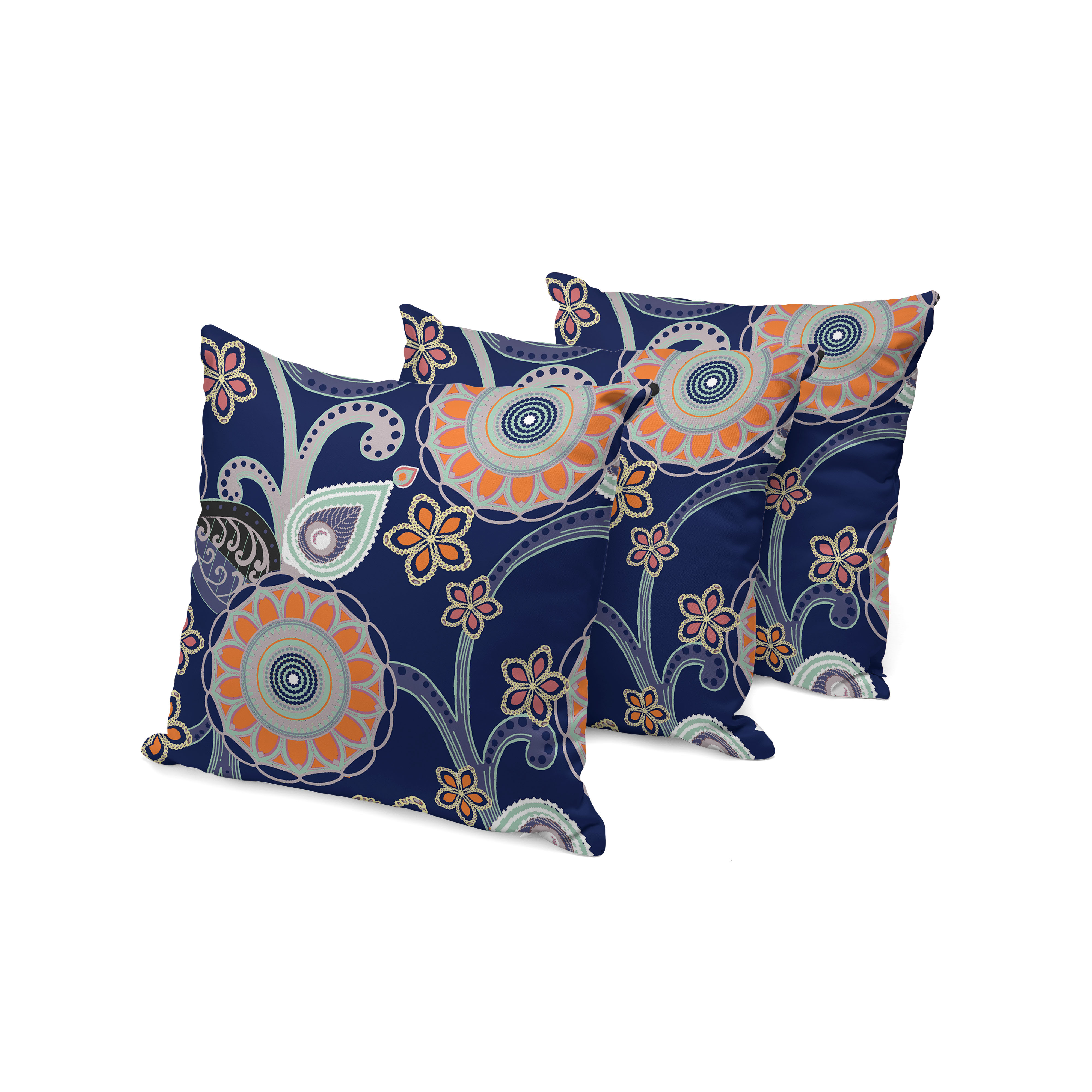 Flower Circles Indoor/Outdoor Set of 3 Pillows in Orange Light Green Gray on Indigo