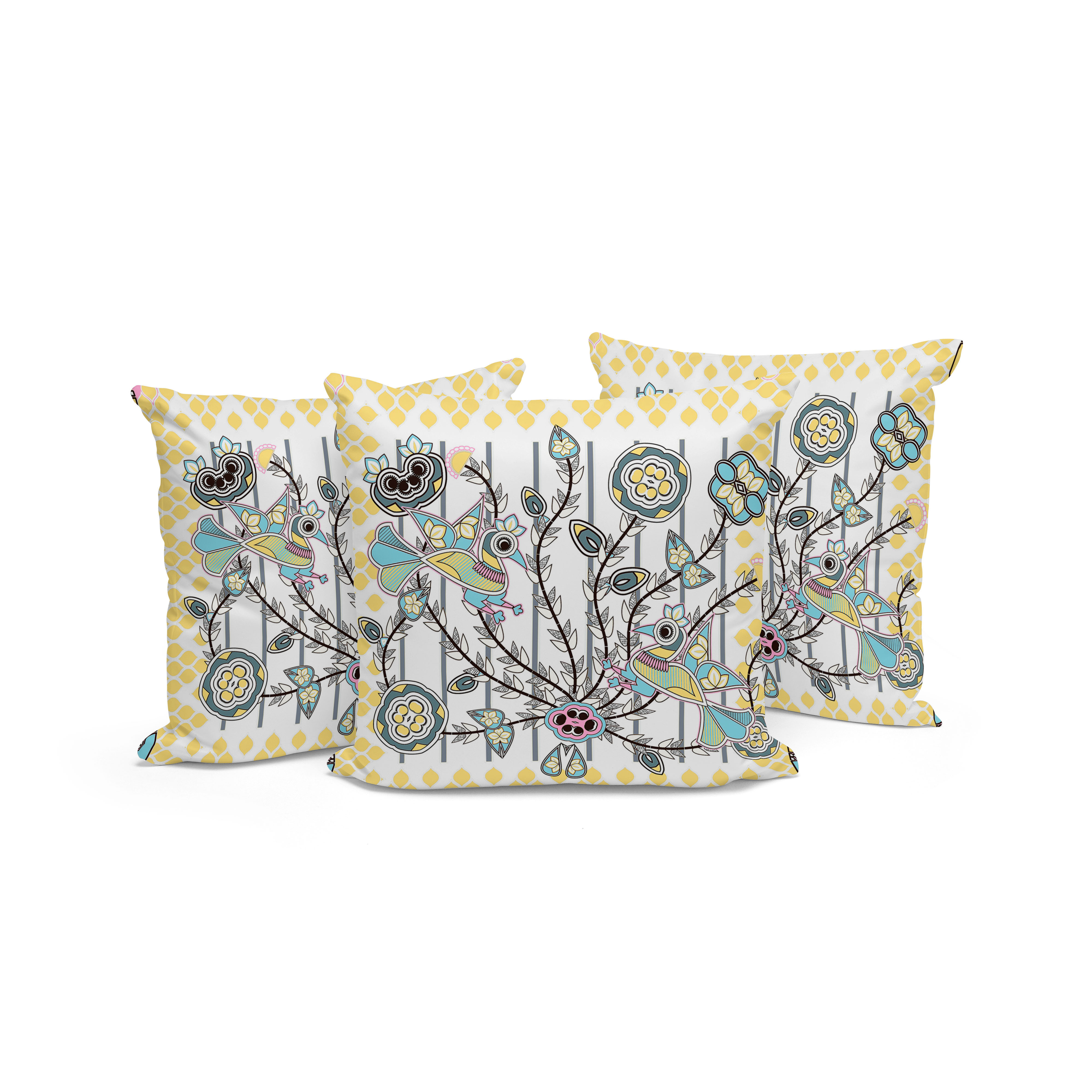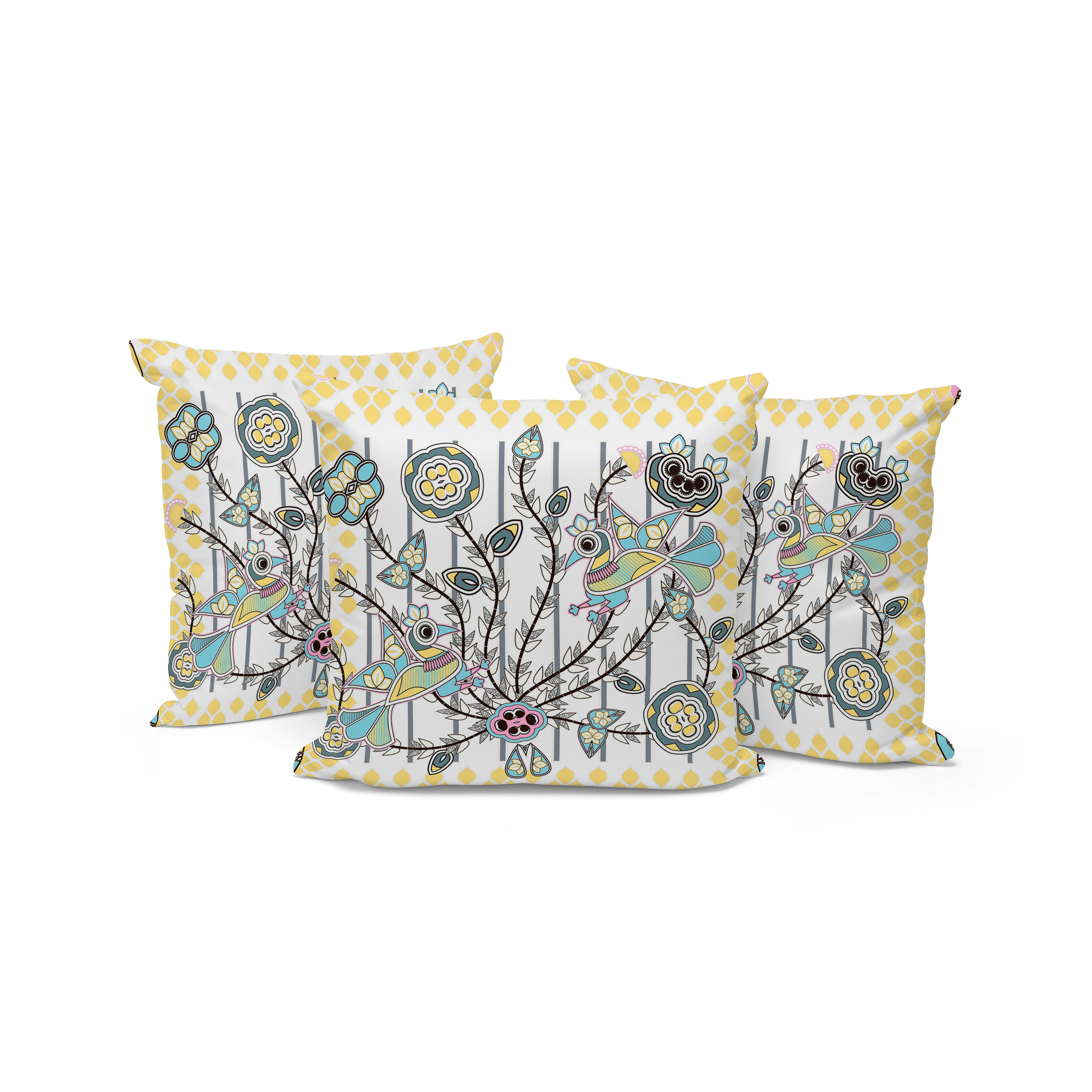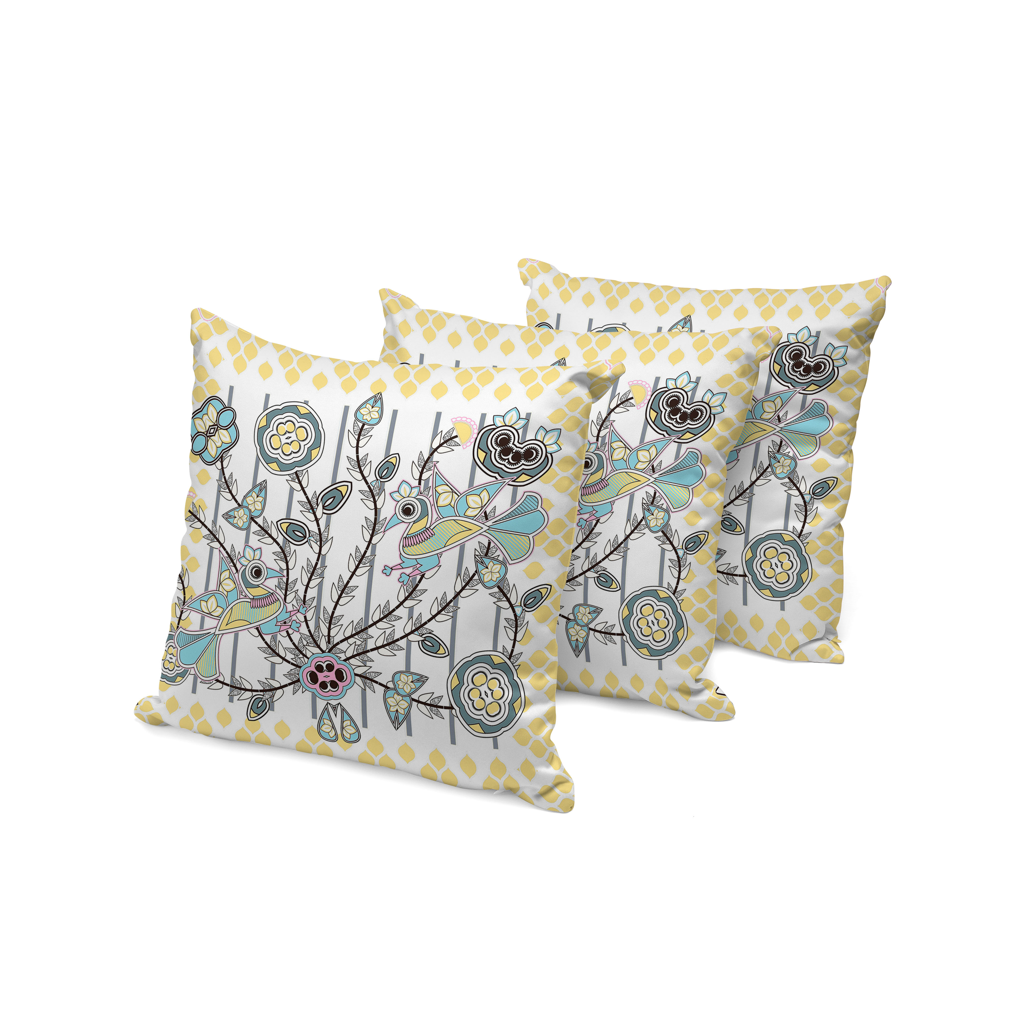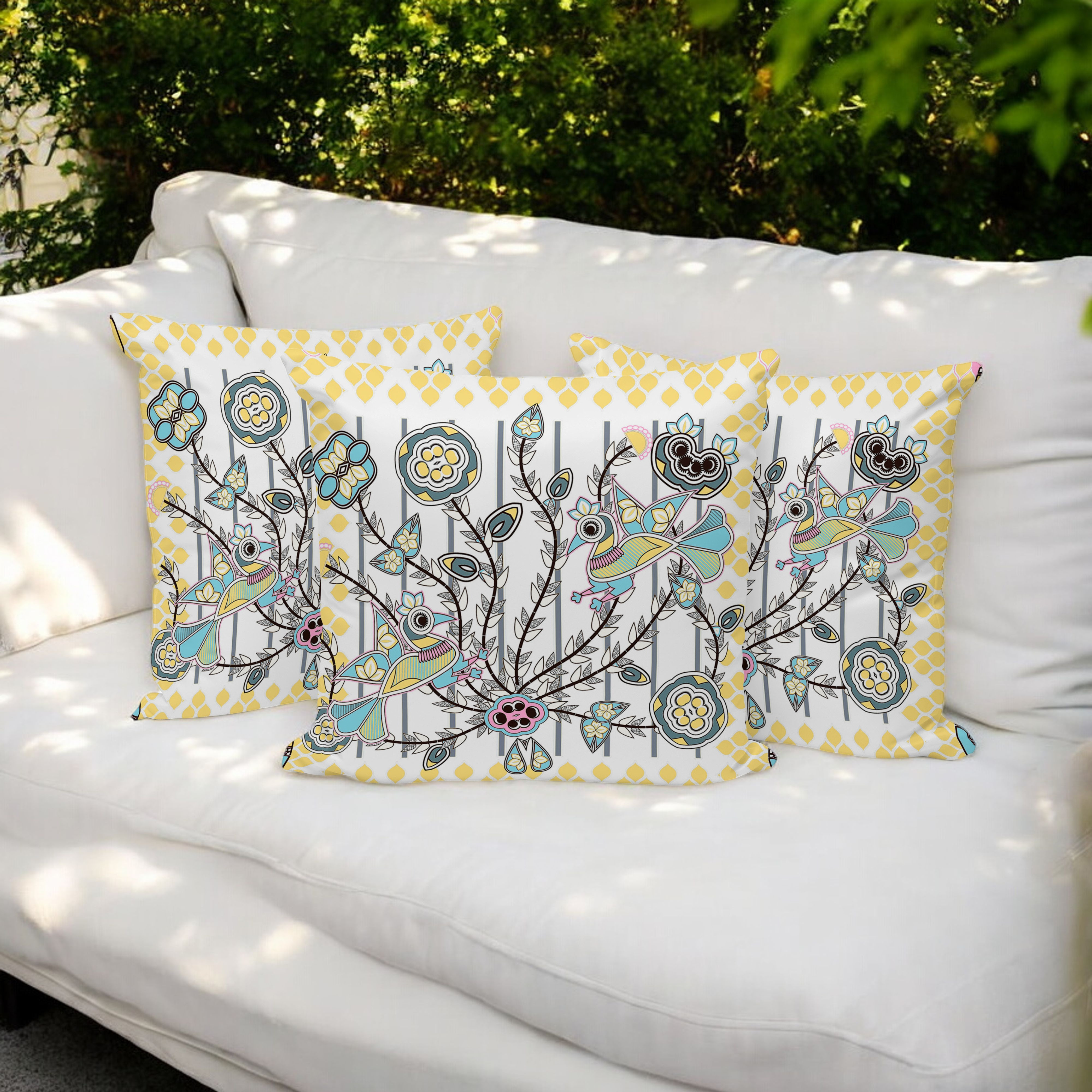 Pond Peacock Indoor/Outdoor Set of 3 Pillows in White Yellow Gray