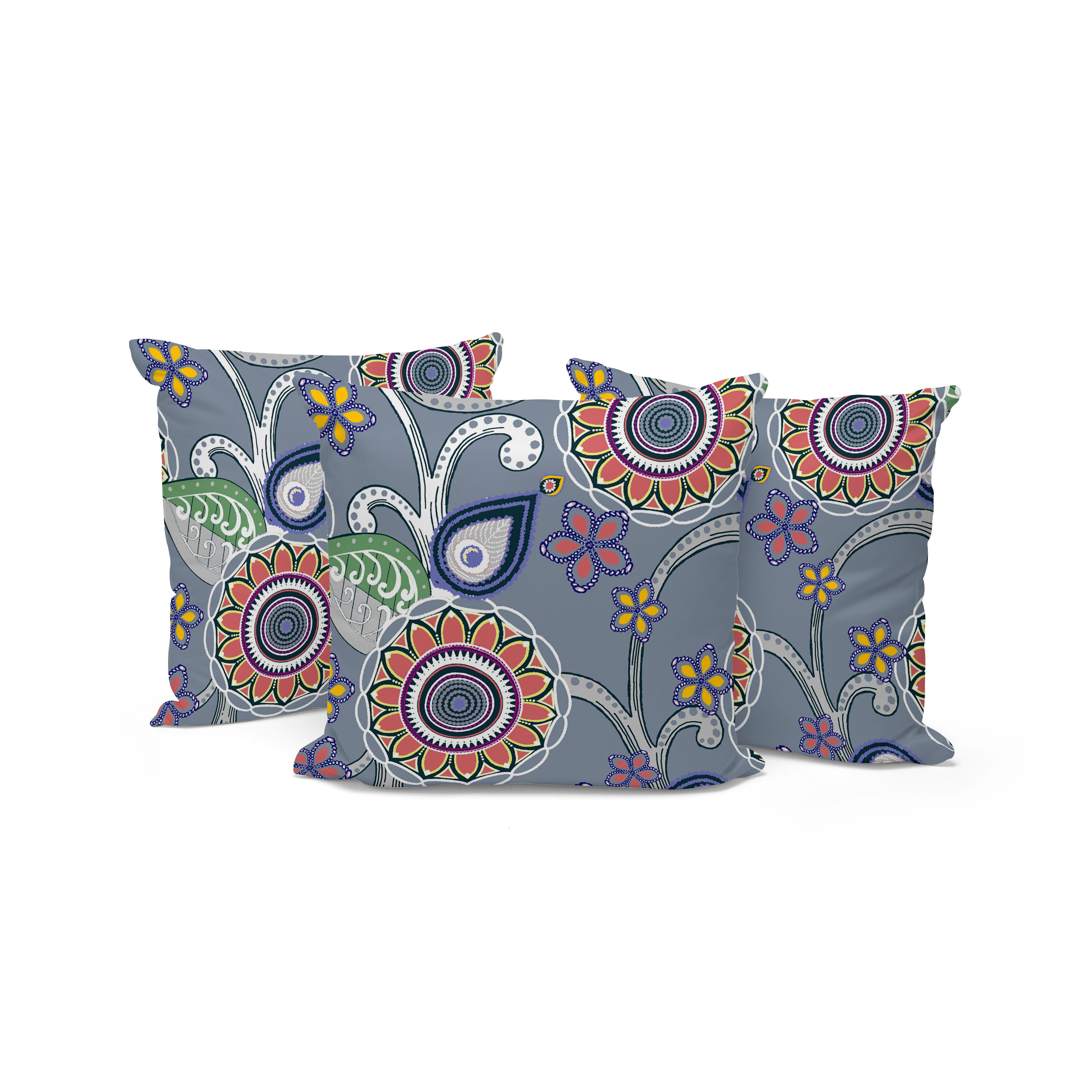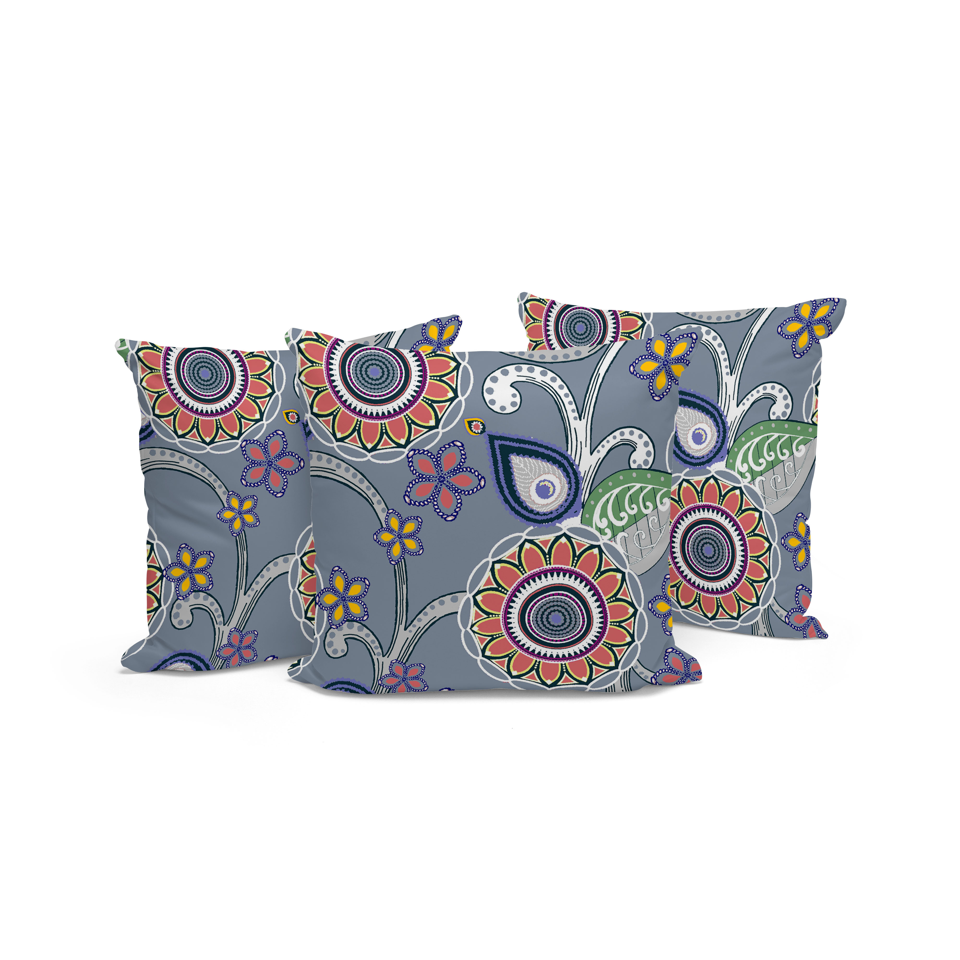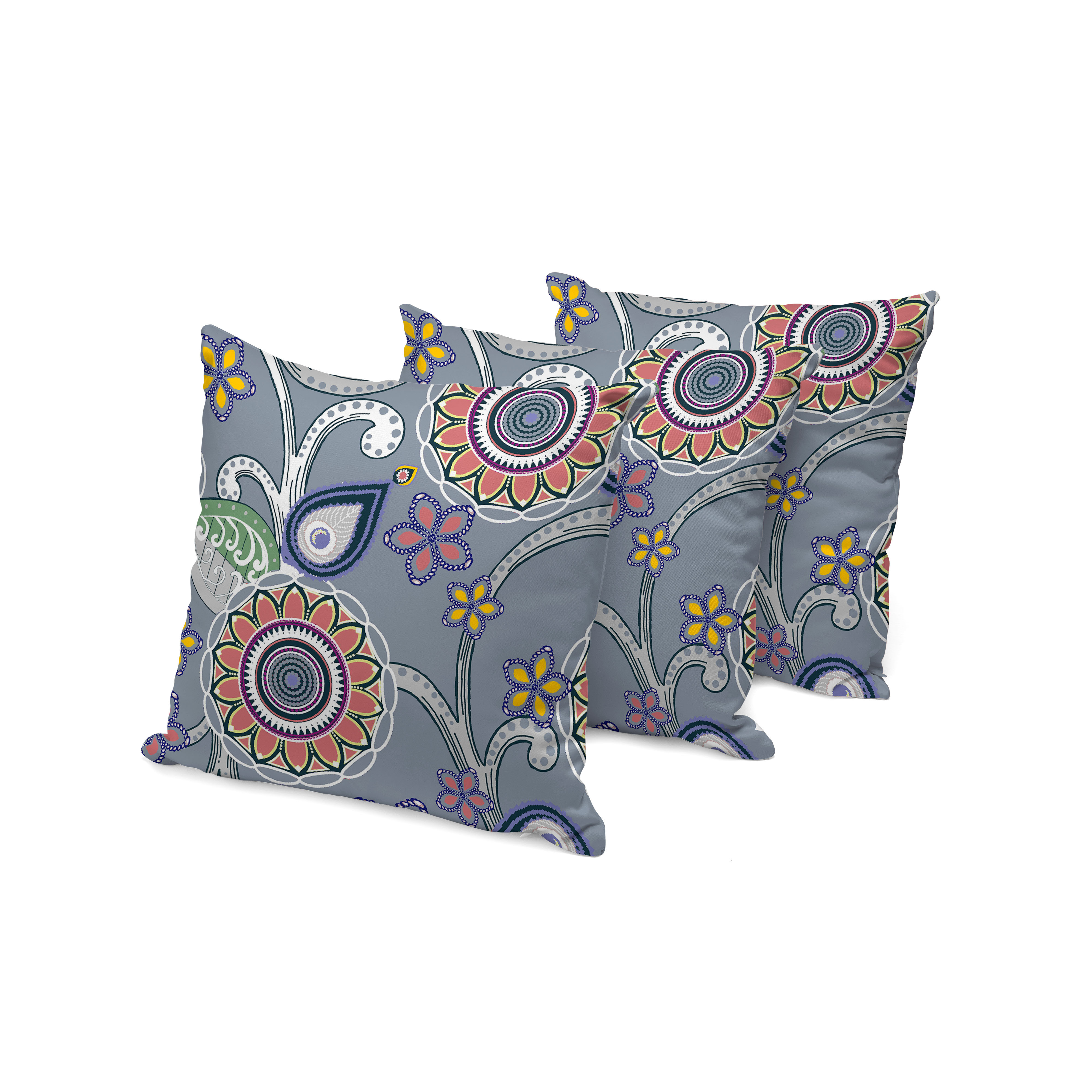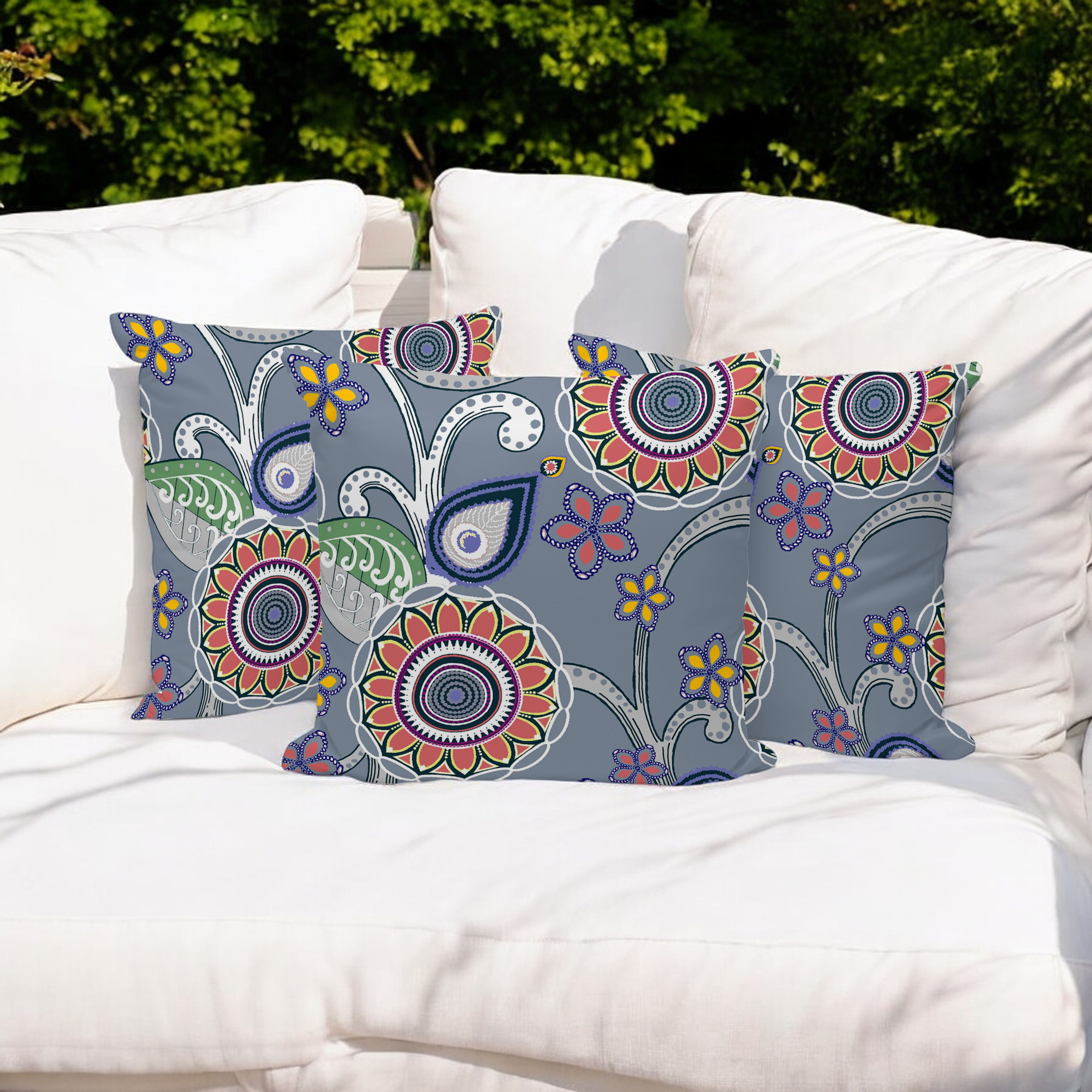 Flower Circles Indoor/Outdoor Set of 3 Pillows in Red Orange Blue Green on Gray
