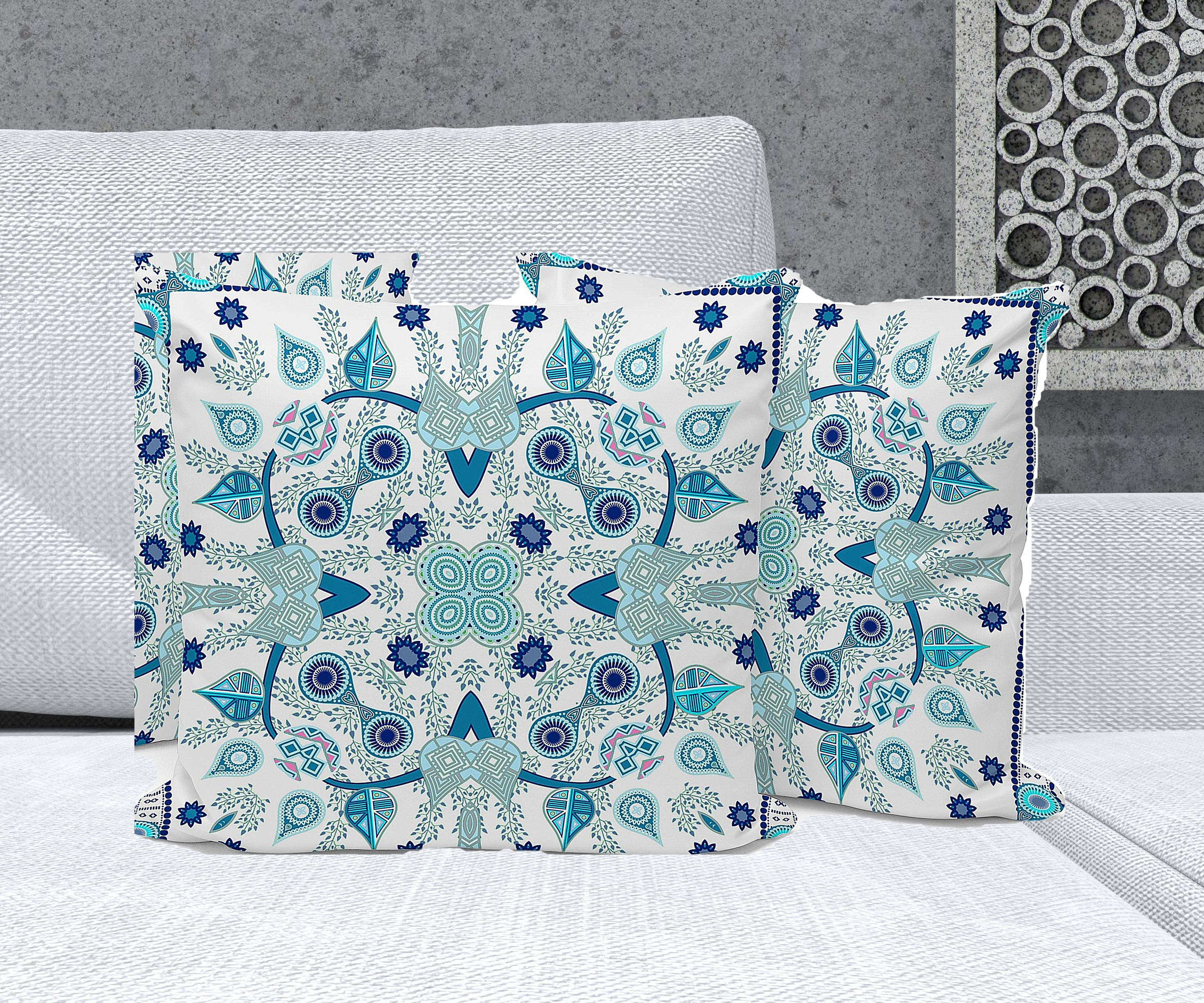 Paisley Leaf Geo Indoor/Outdoor Set of 3 Pillows in Light Blue White