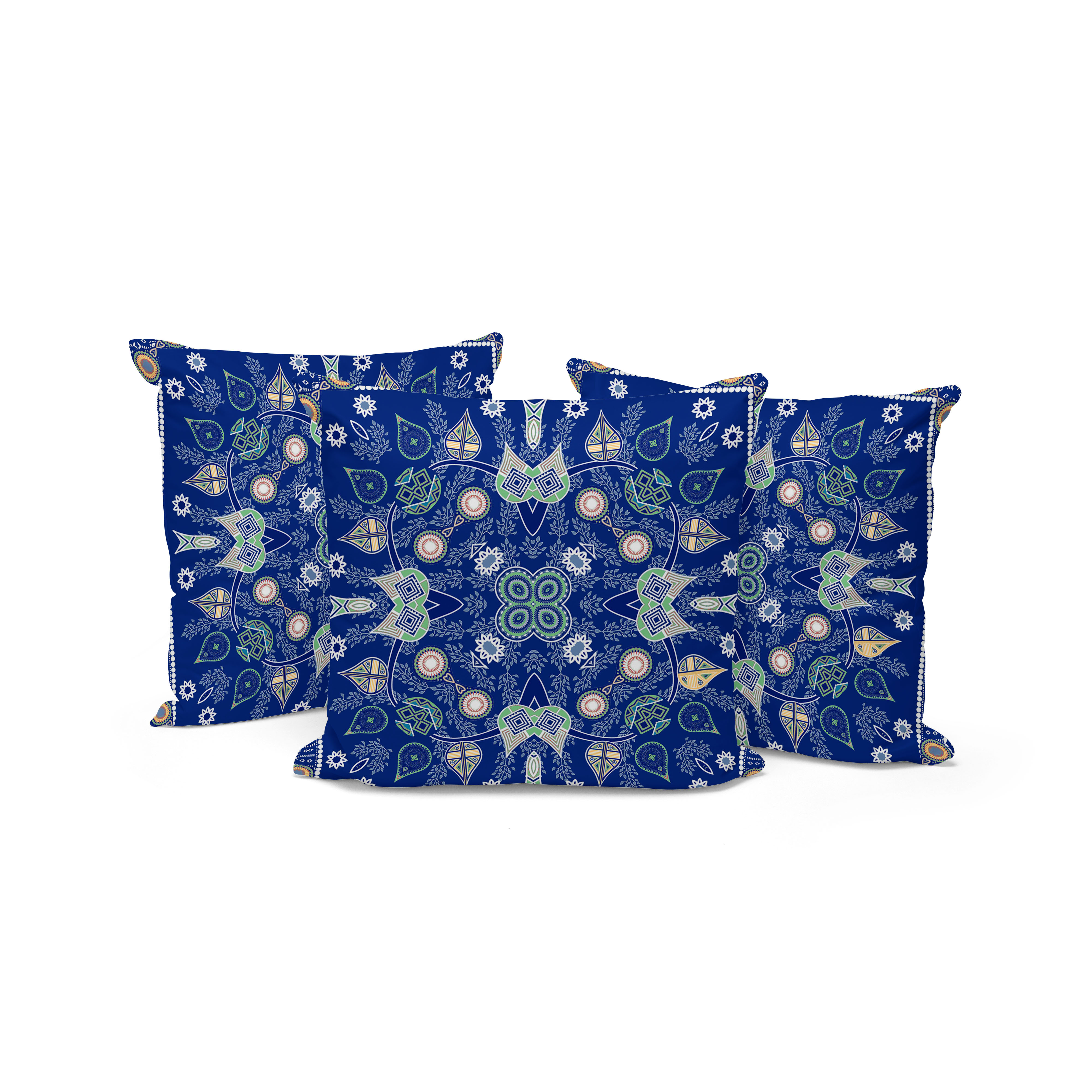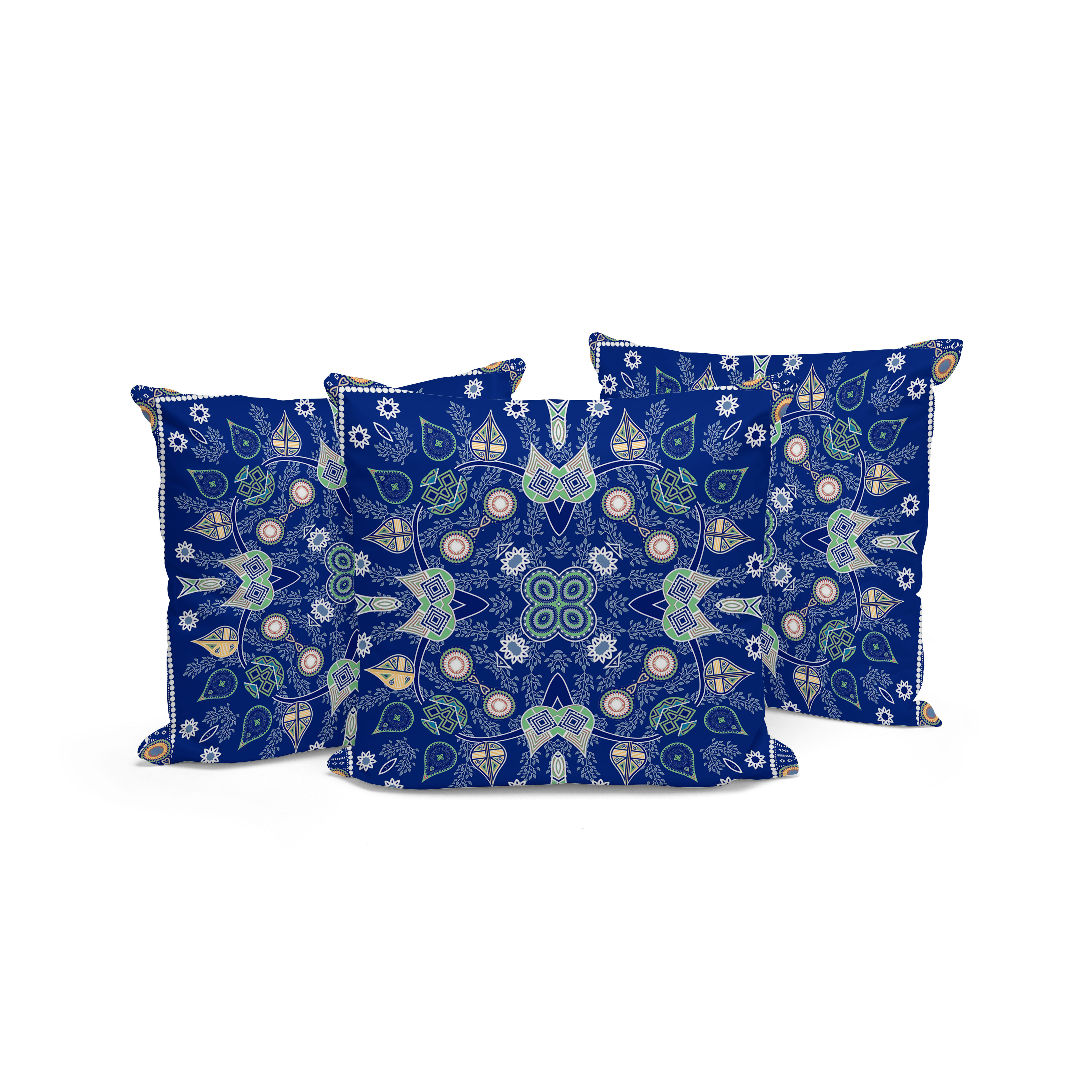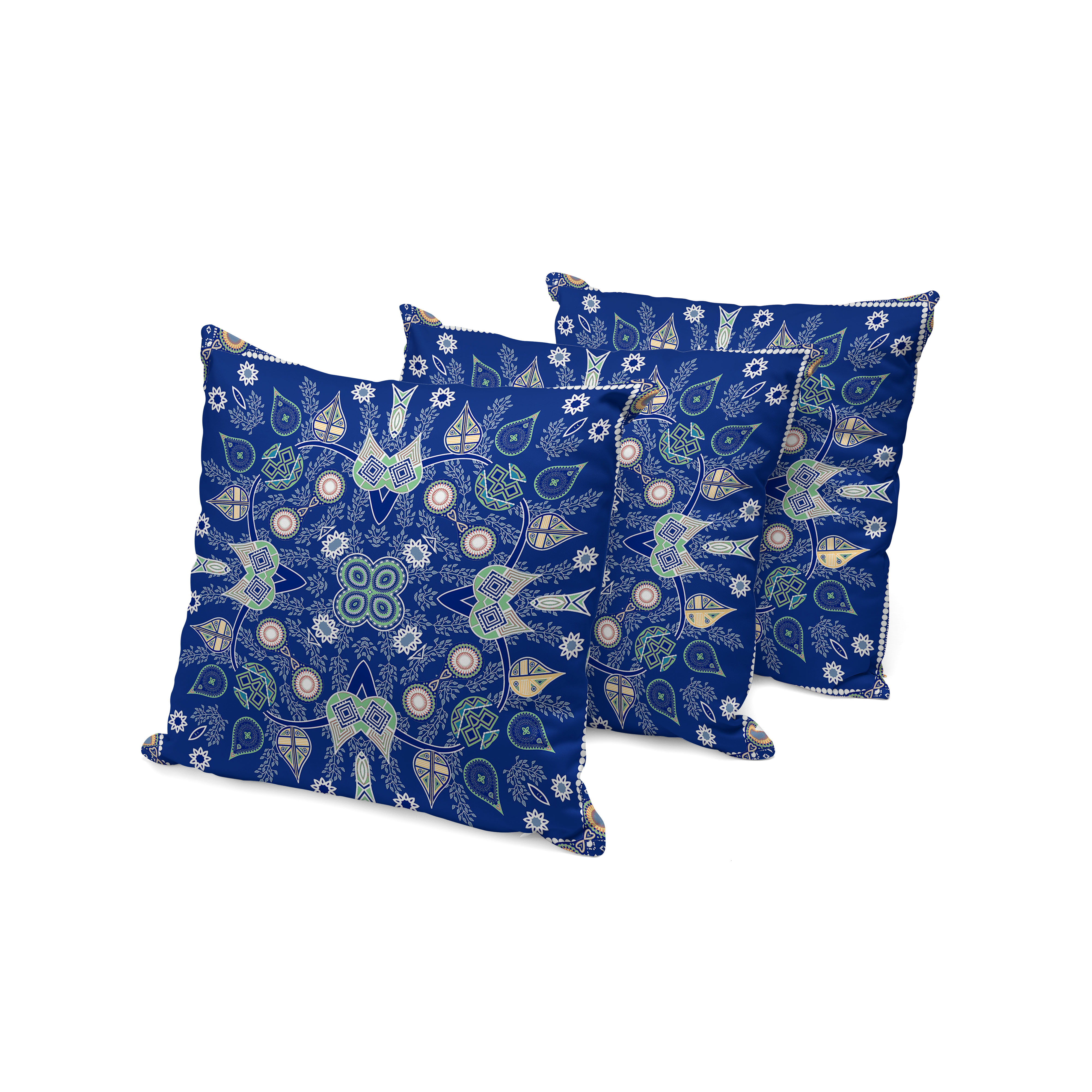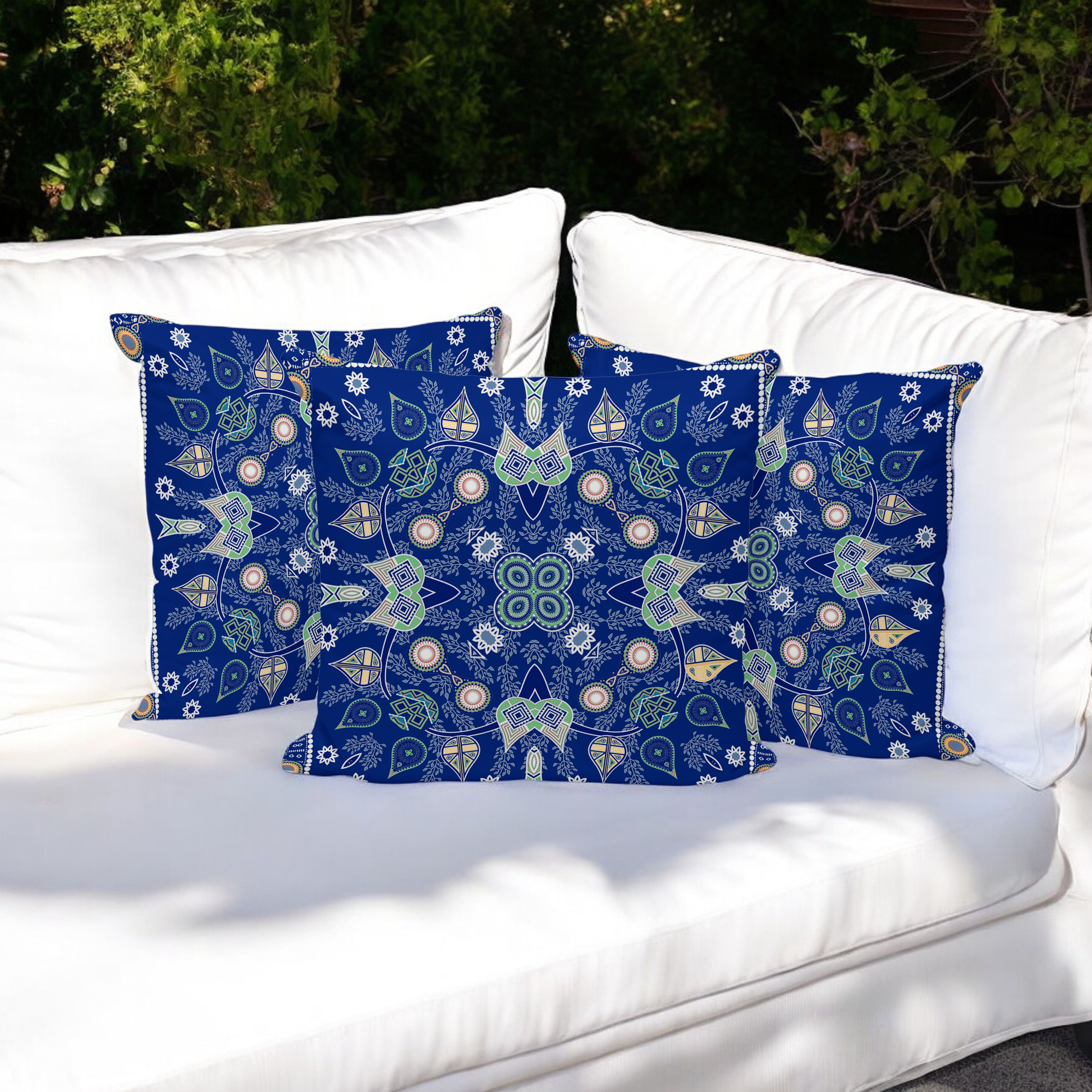Paisley Leaf Geo Indoor/Outdoor Set of 3 Pillows in Midnight Blue Beige White