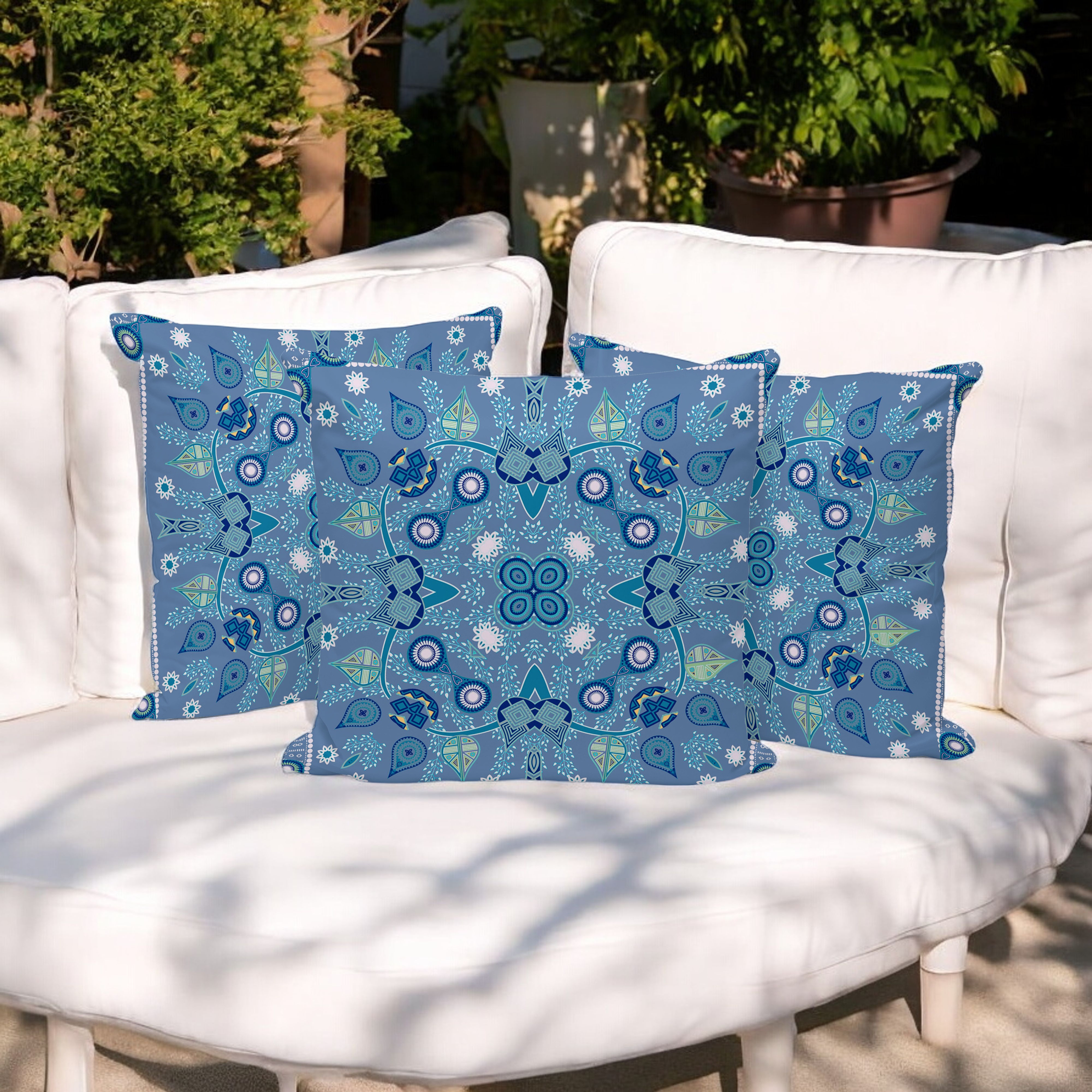 Paisley Leaf Geo Indoor/Outdoor Set of 3 Pillows in Muted Blue White