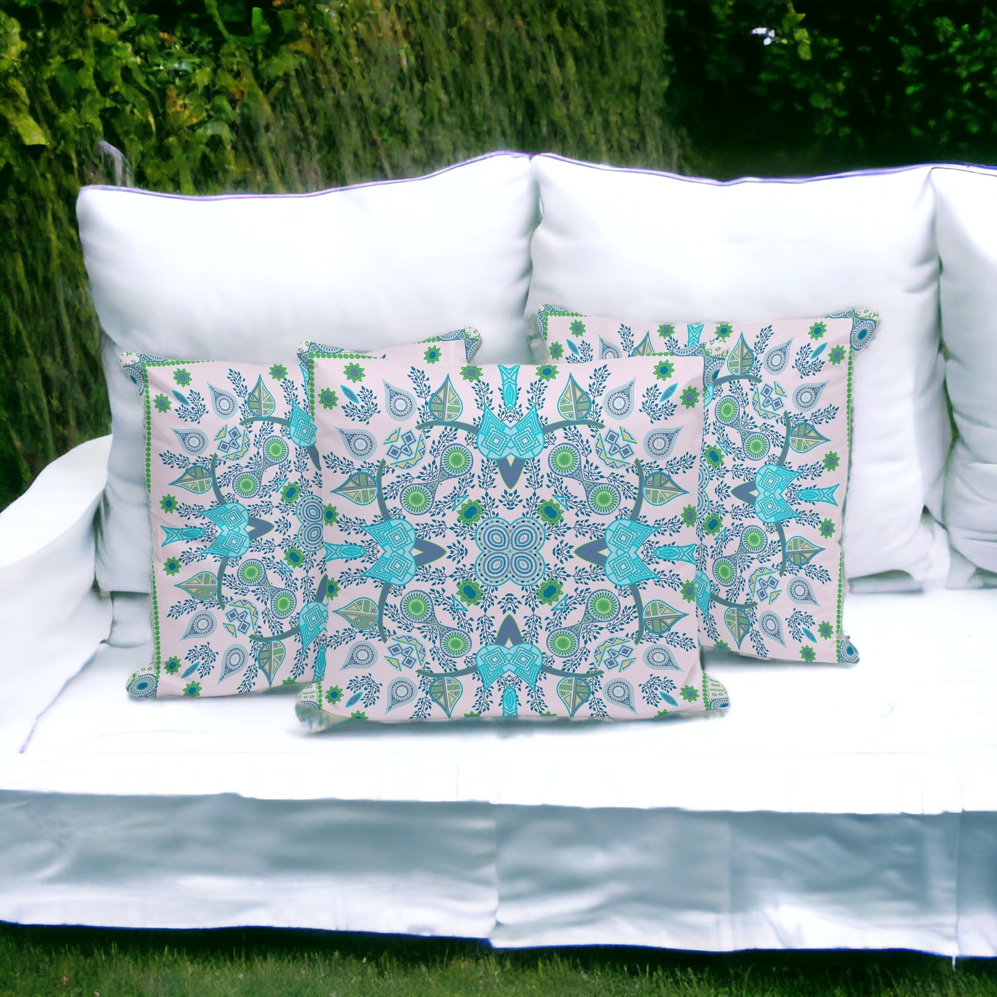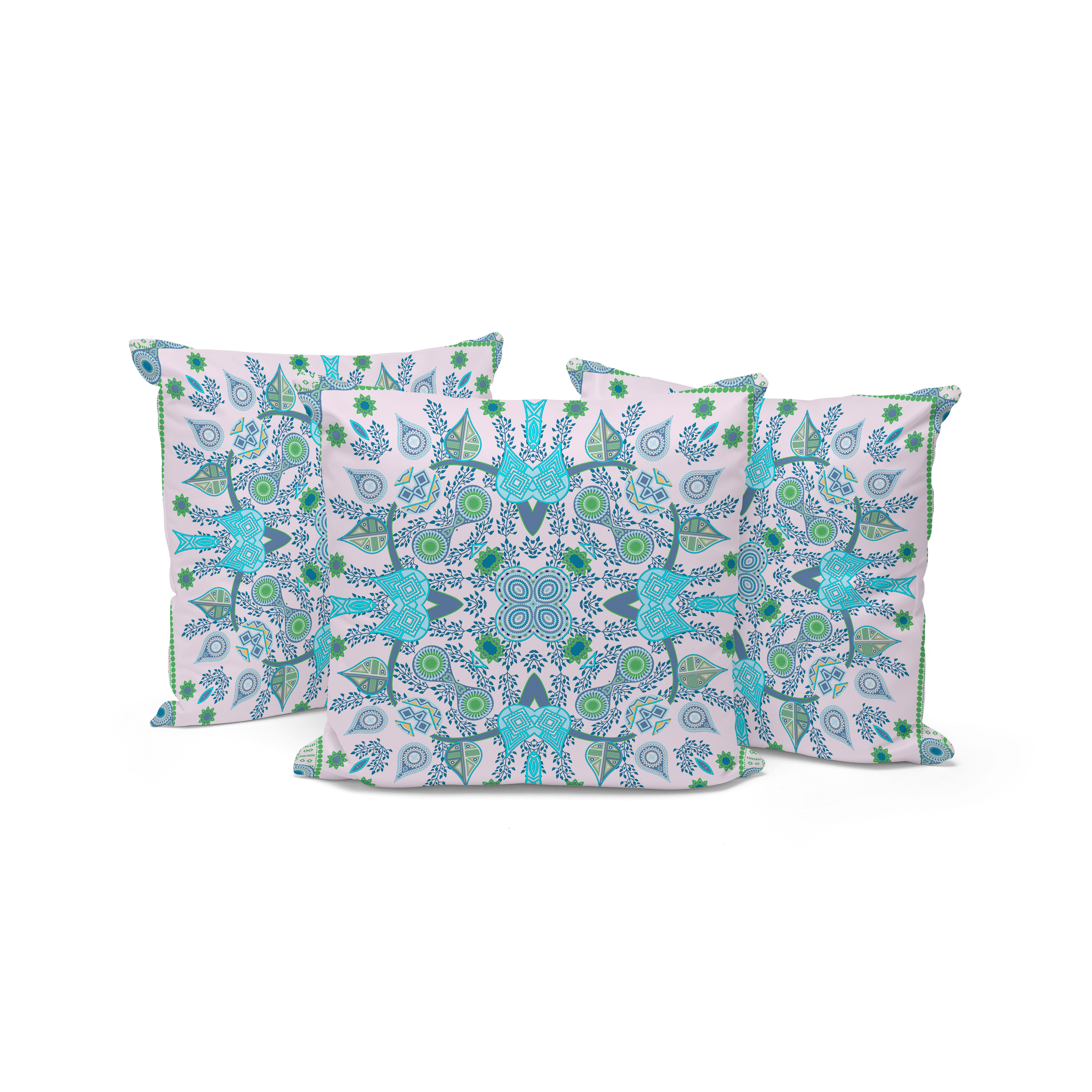 Paisley Leaf Geo Indoor/Outdoor Set of 3 Pillows in White Light Blue Green