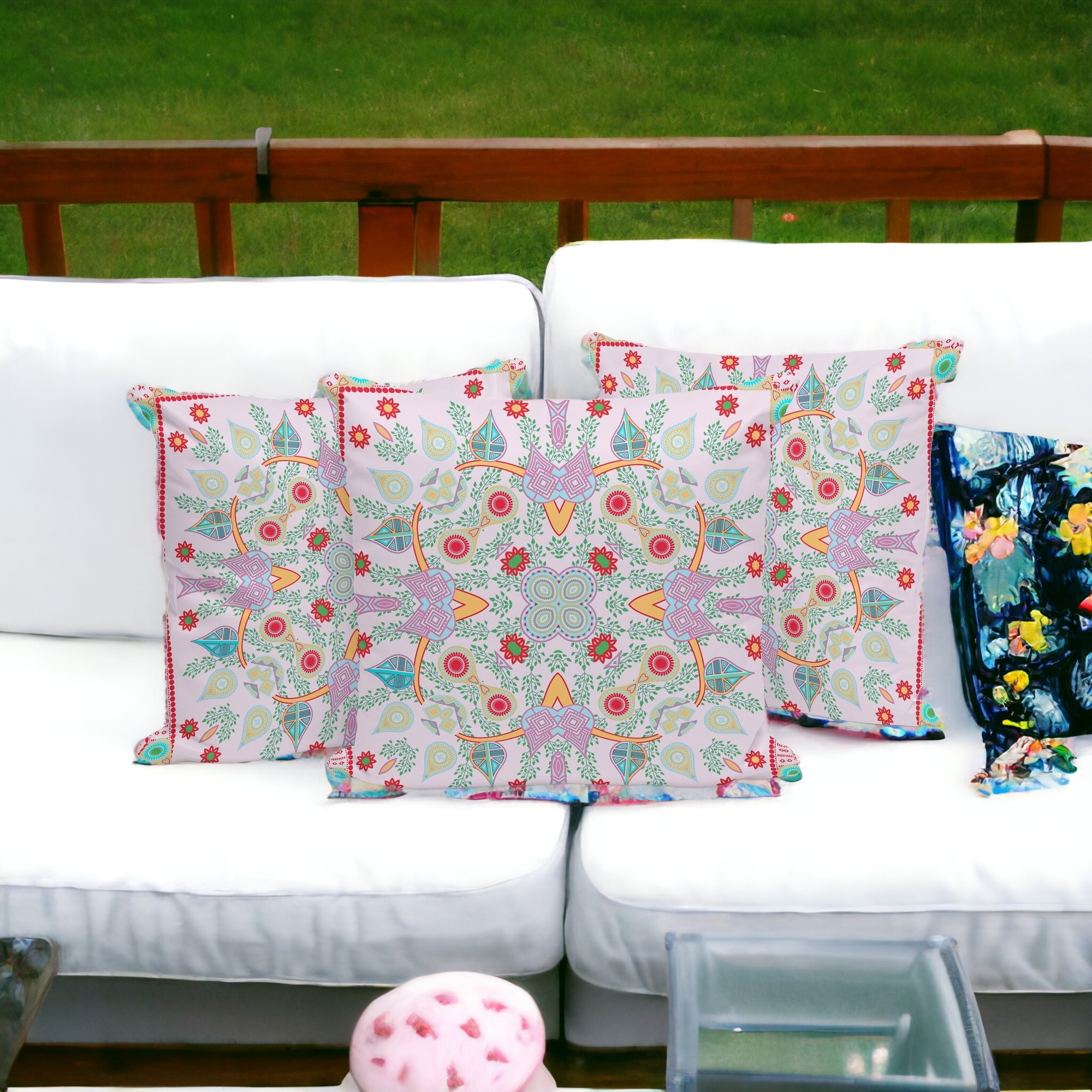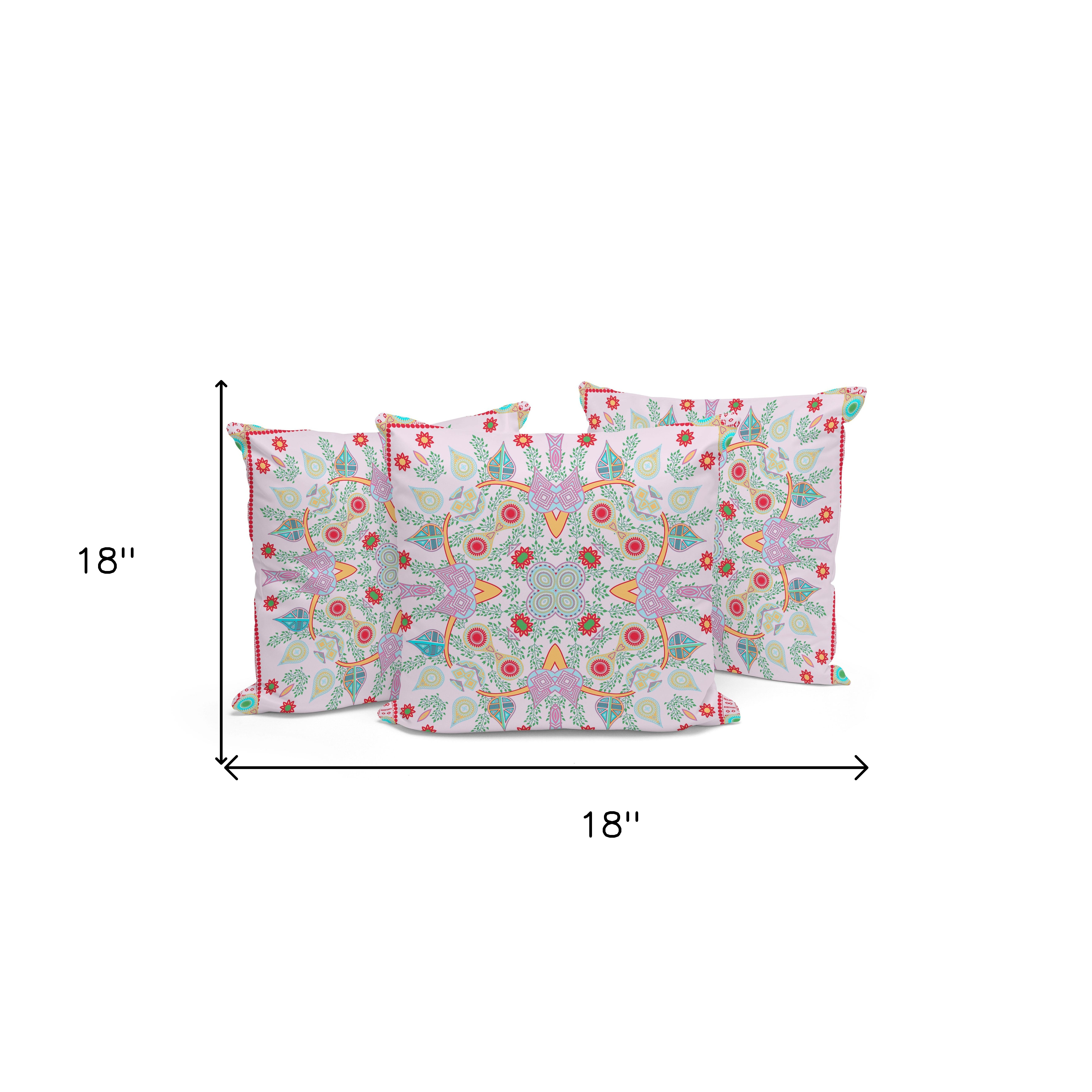 Paisley Leaf Geo Indoor/Outdoor Set of 3 Pillows in White Pink Red