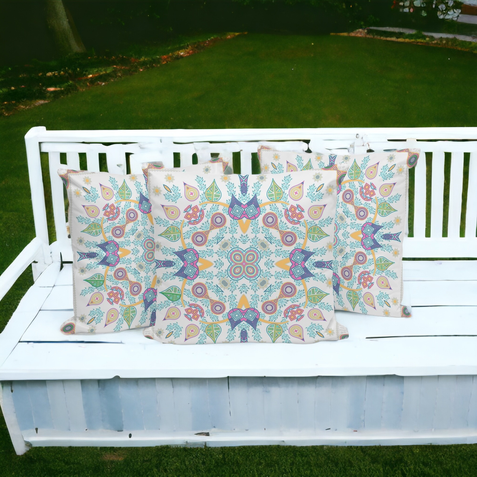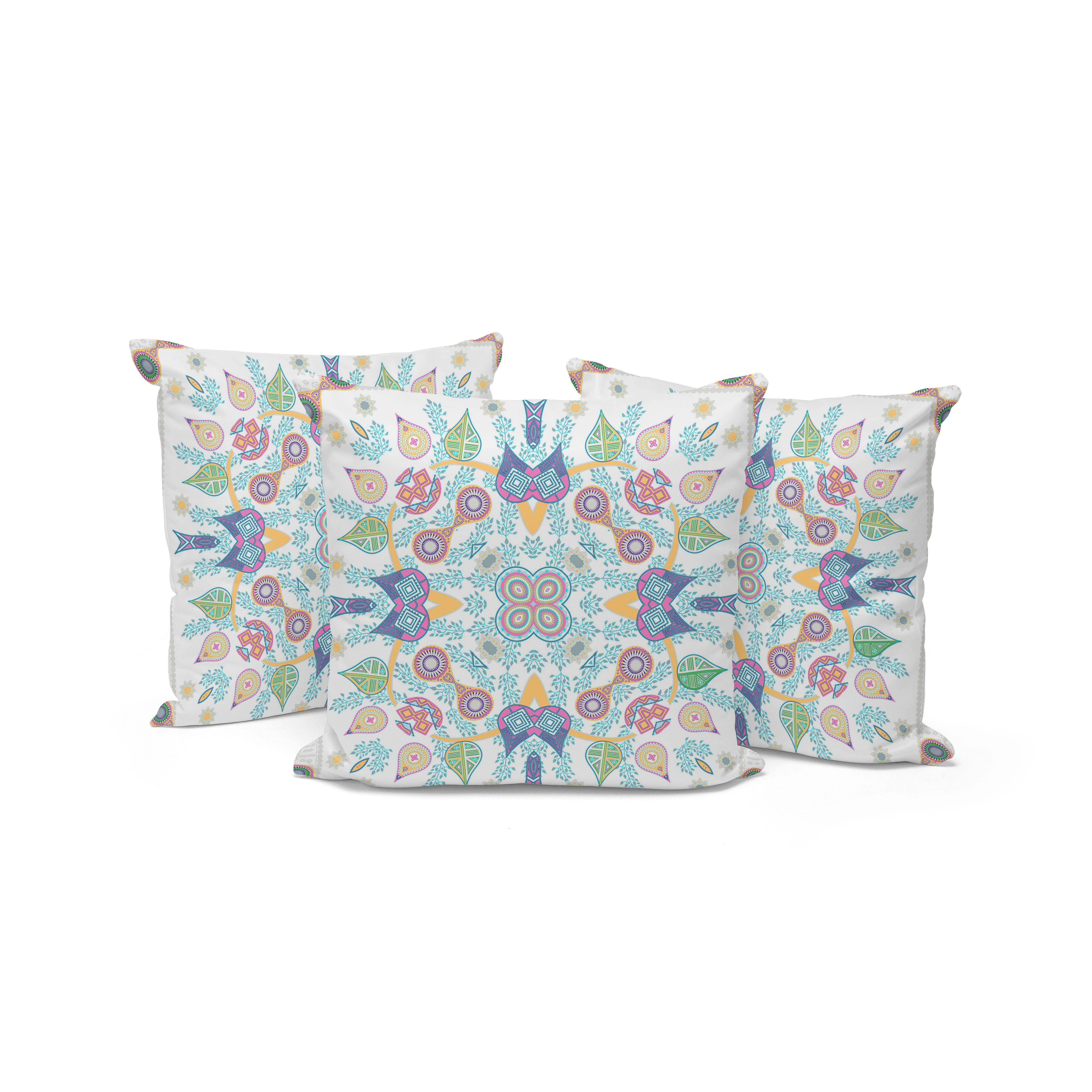 Paisley Leaf Geo Indoor/Outdoor Set of 3 Pillows in White Pink Yellow Light Green