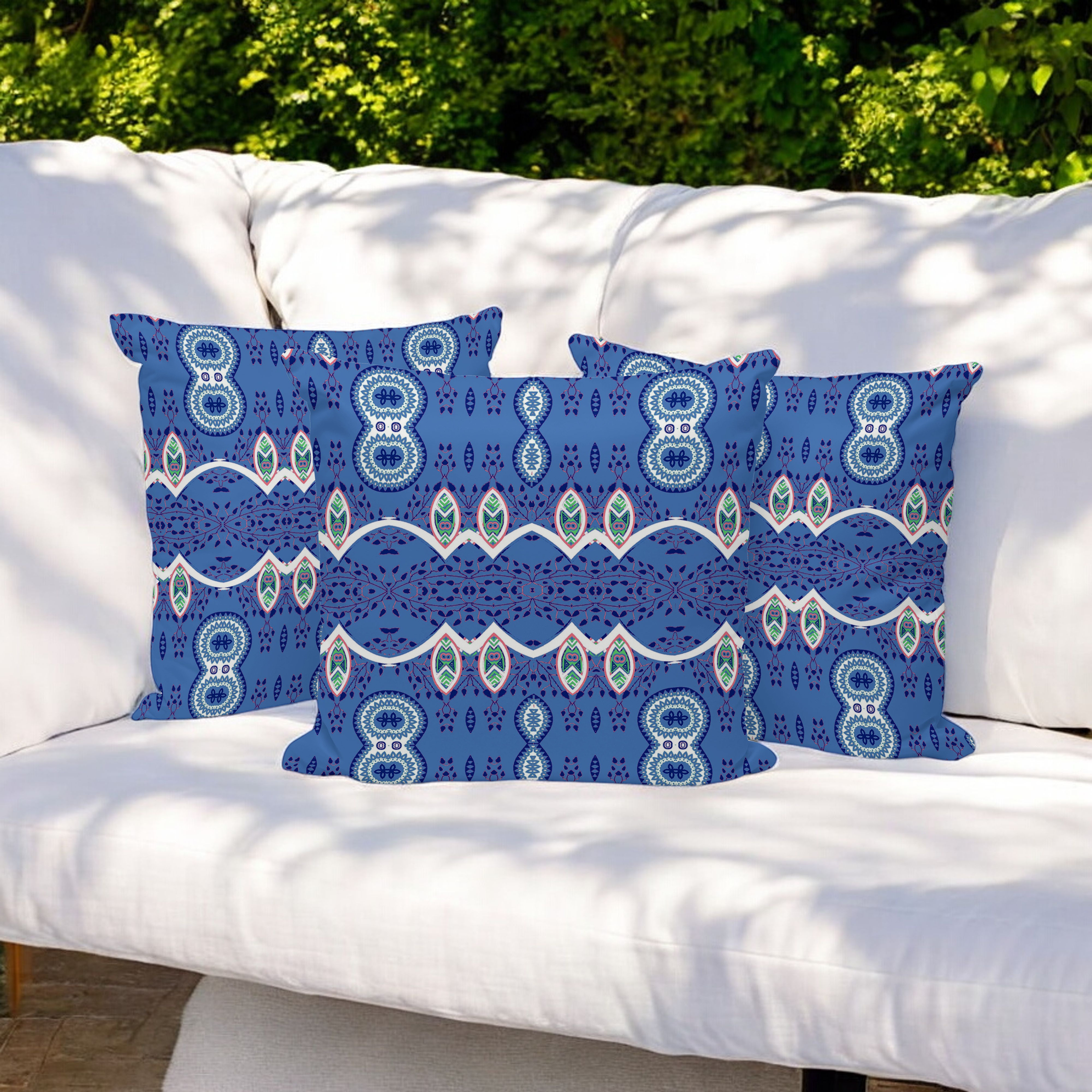 Set of Three Blue Abstract Indoor Outdoor Throw Pillow