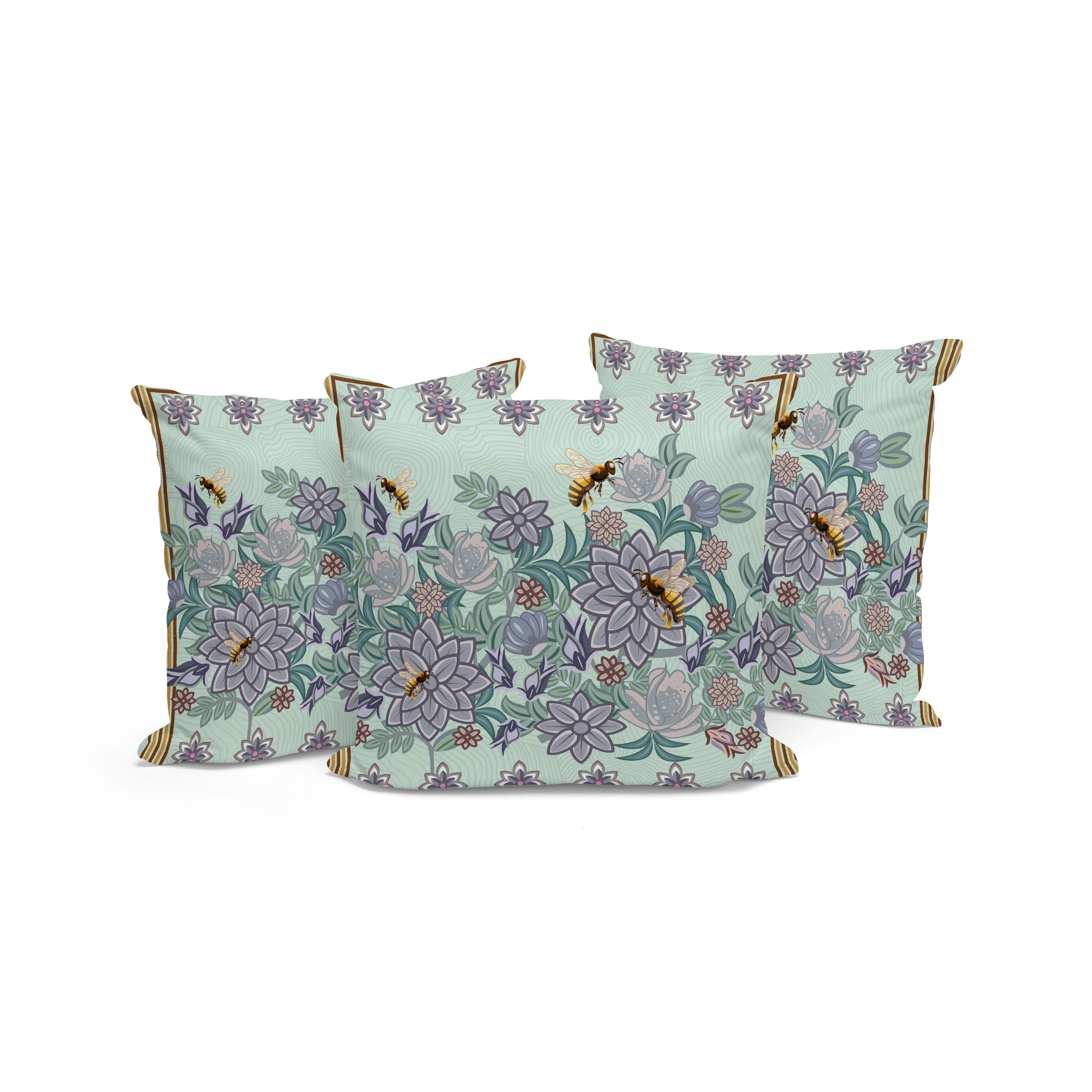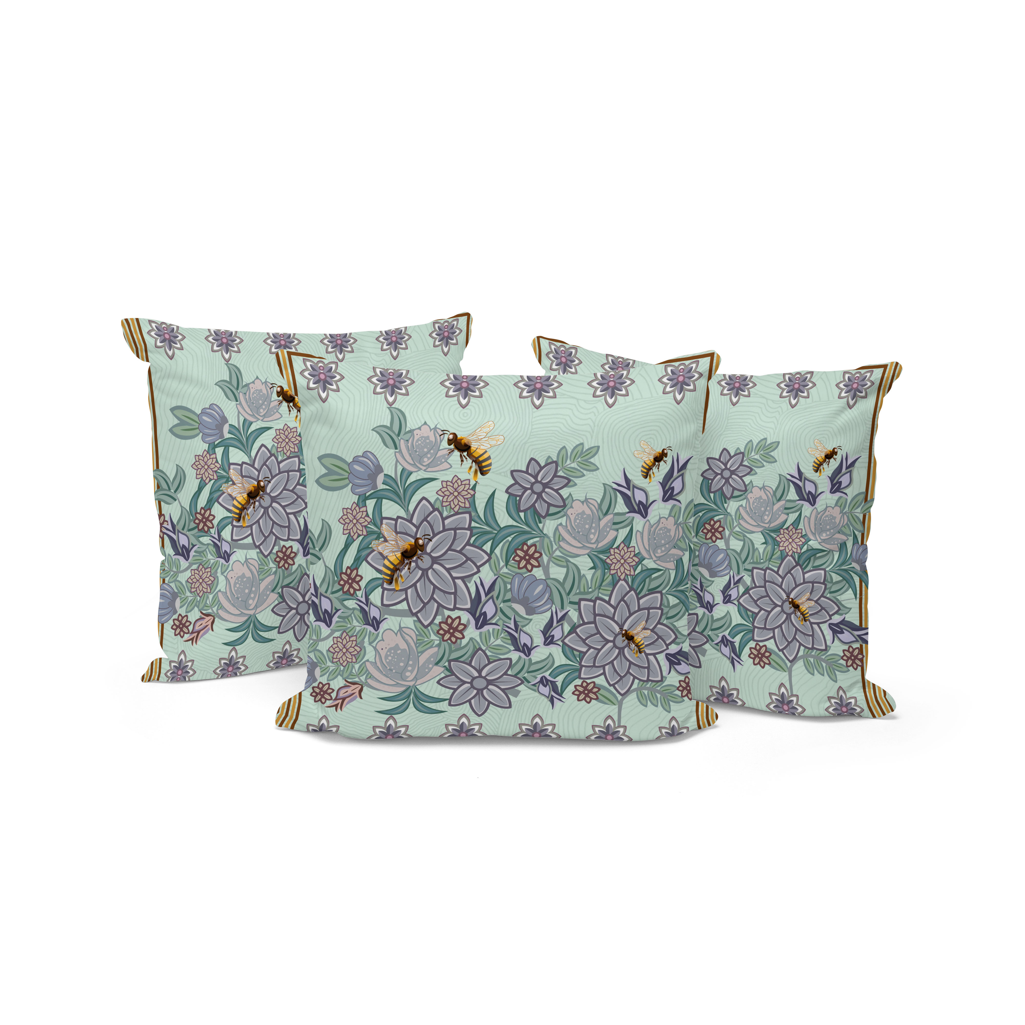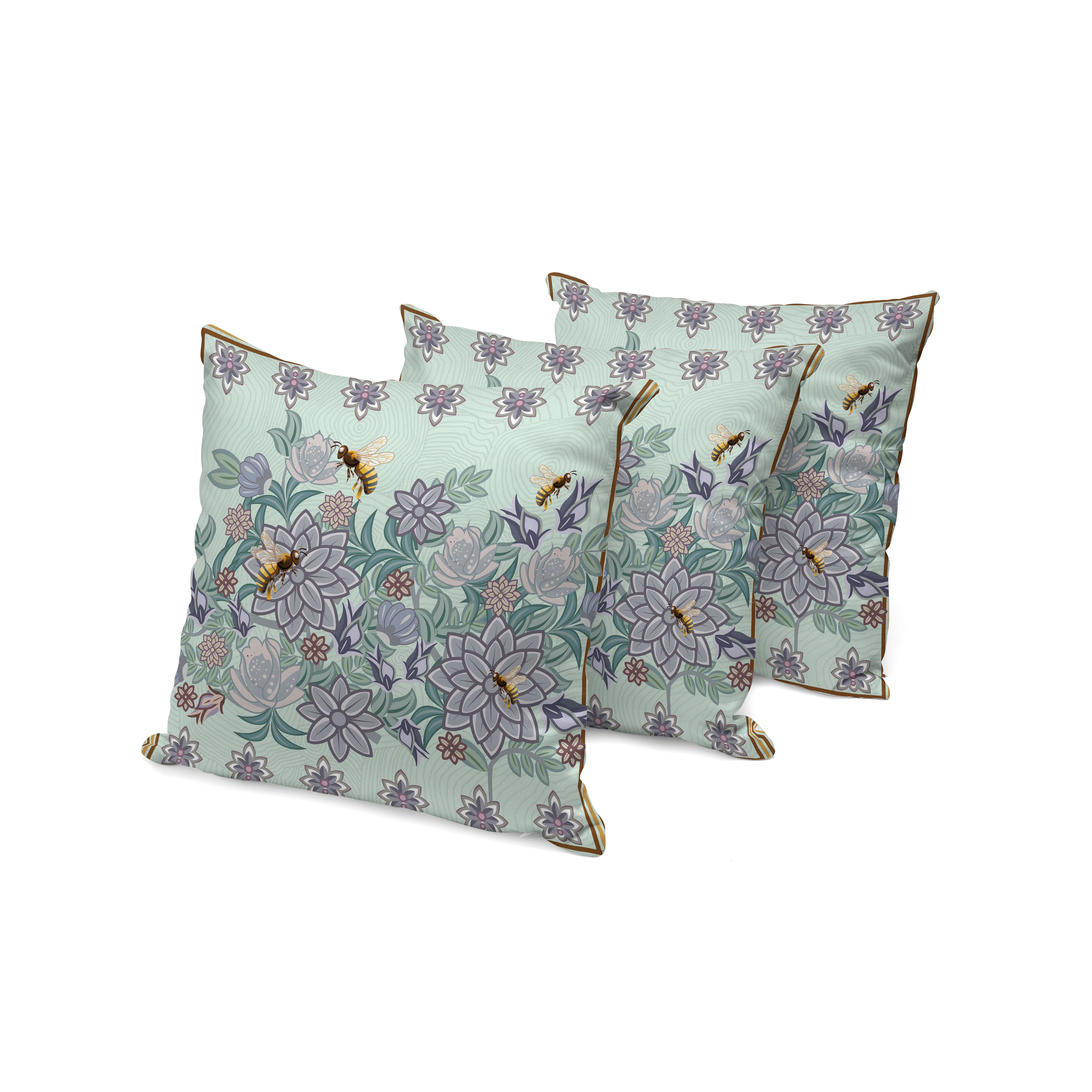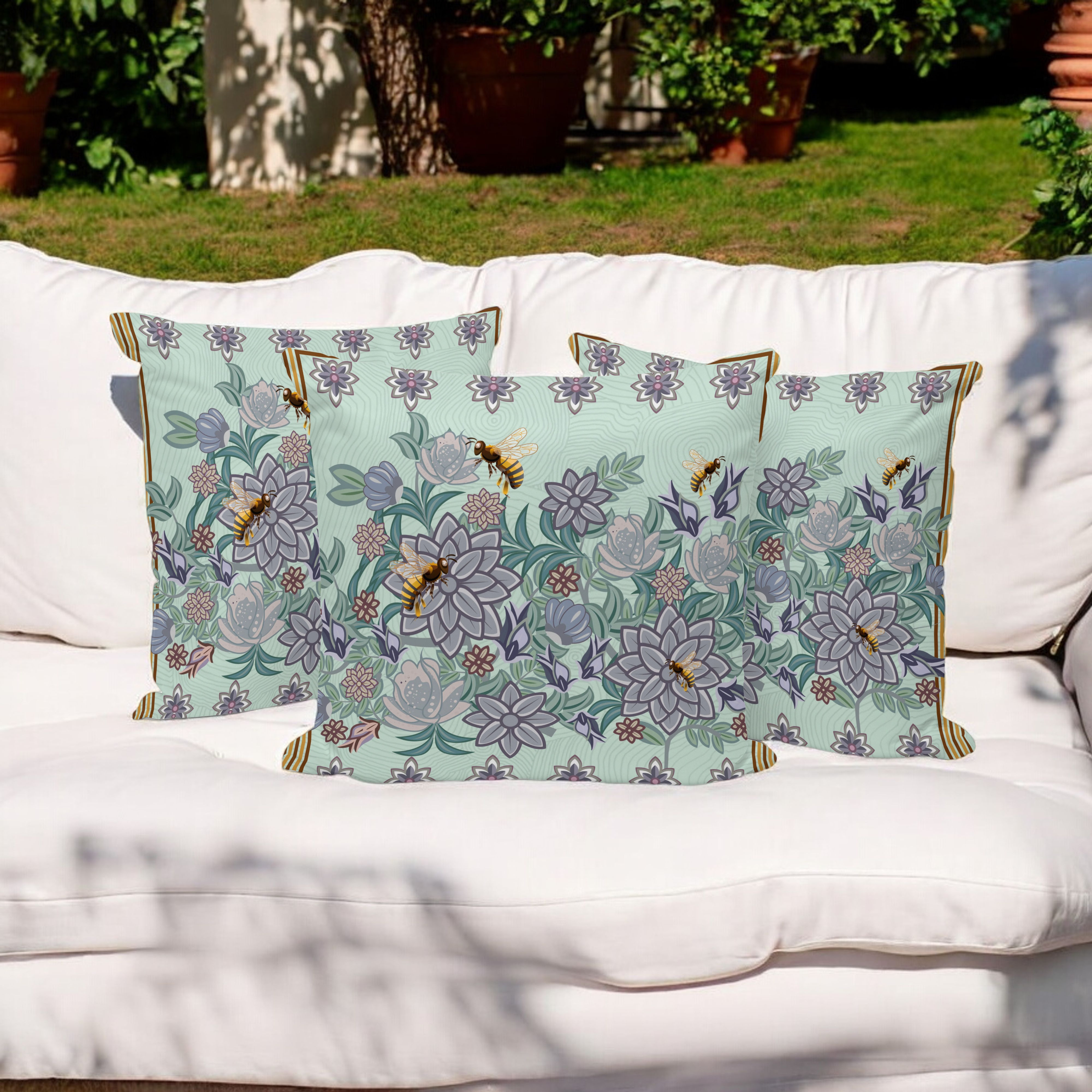 Honeybee on Flower Indoor/Outdoor Set of 3 Pillows in Light Green Purple Brown