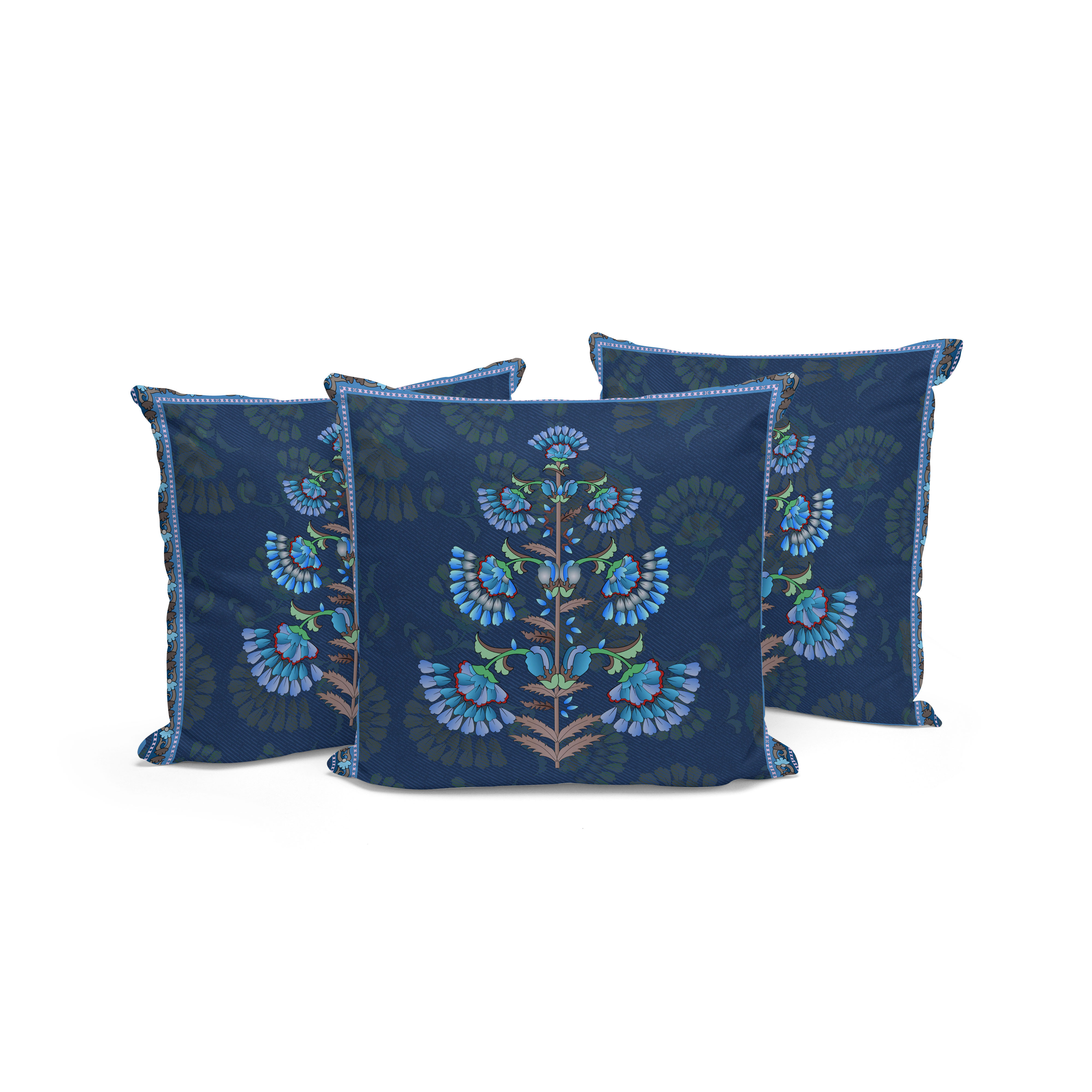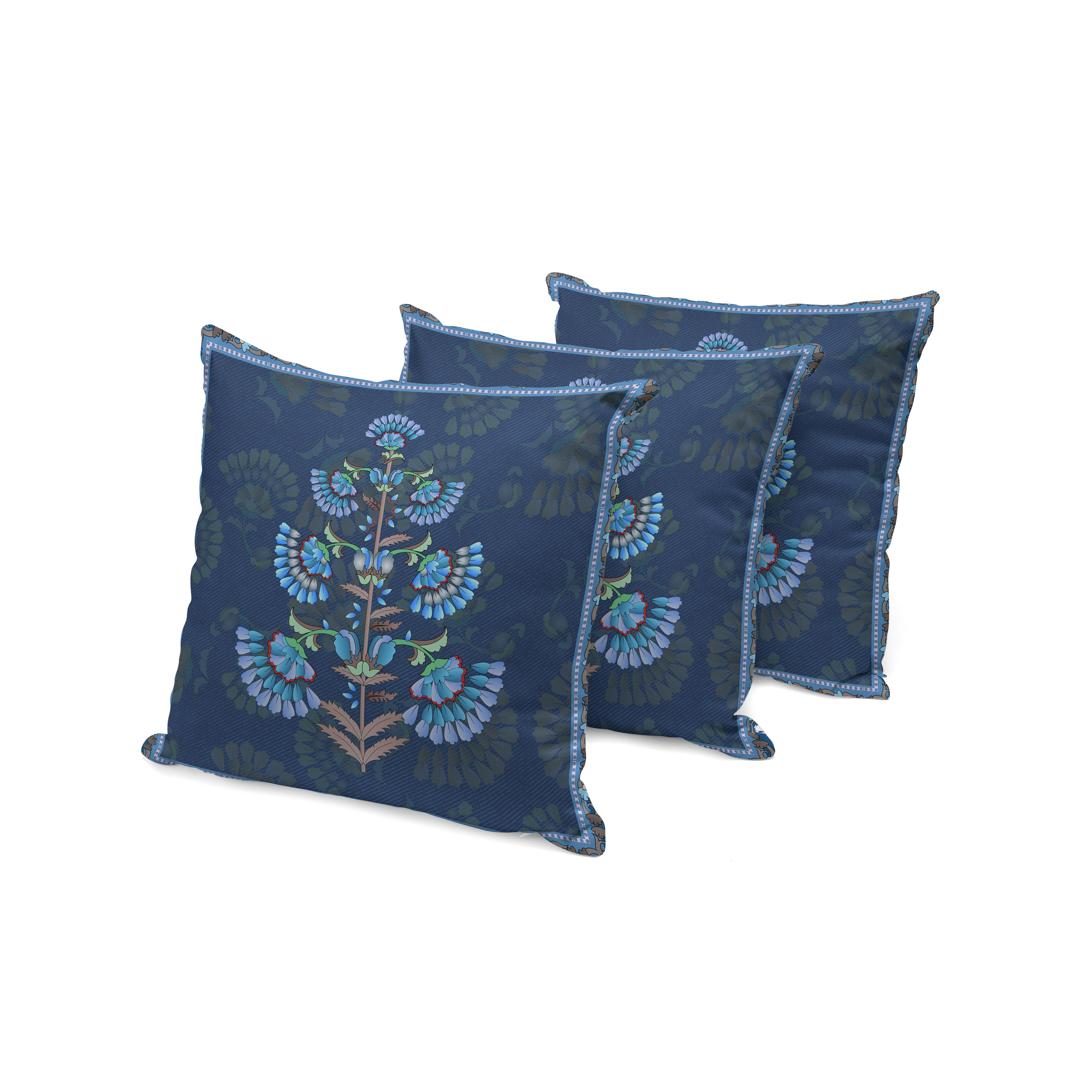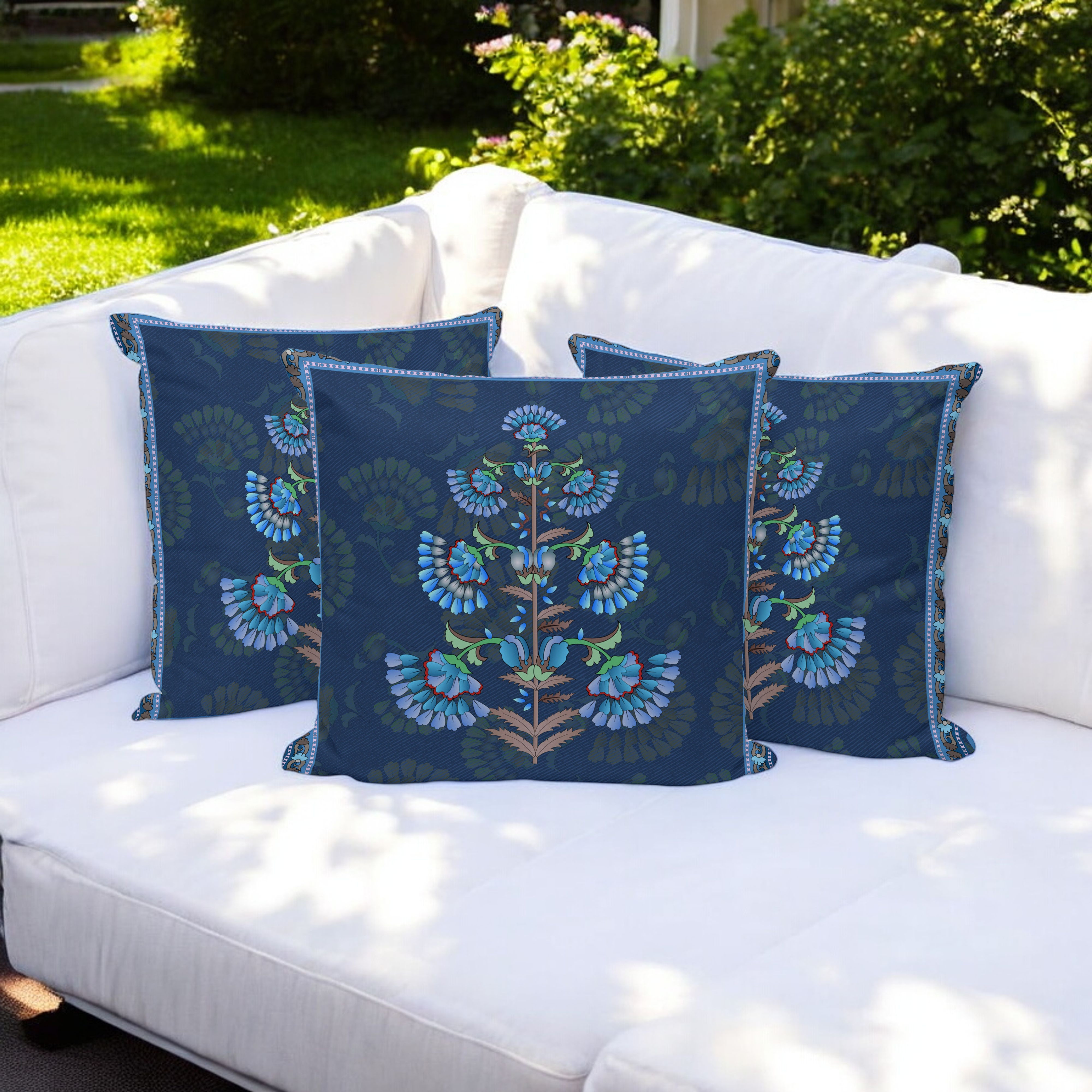 Set of Three Blue Botanical Indoor Outdoor Throw Pillow