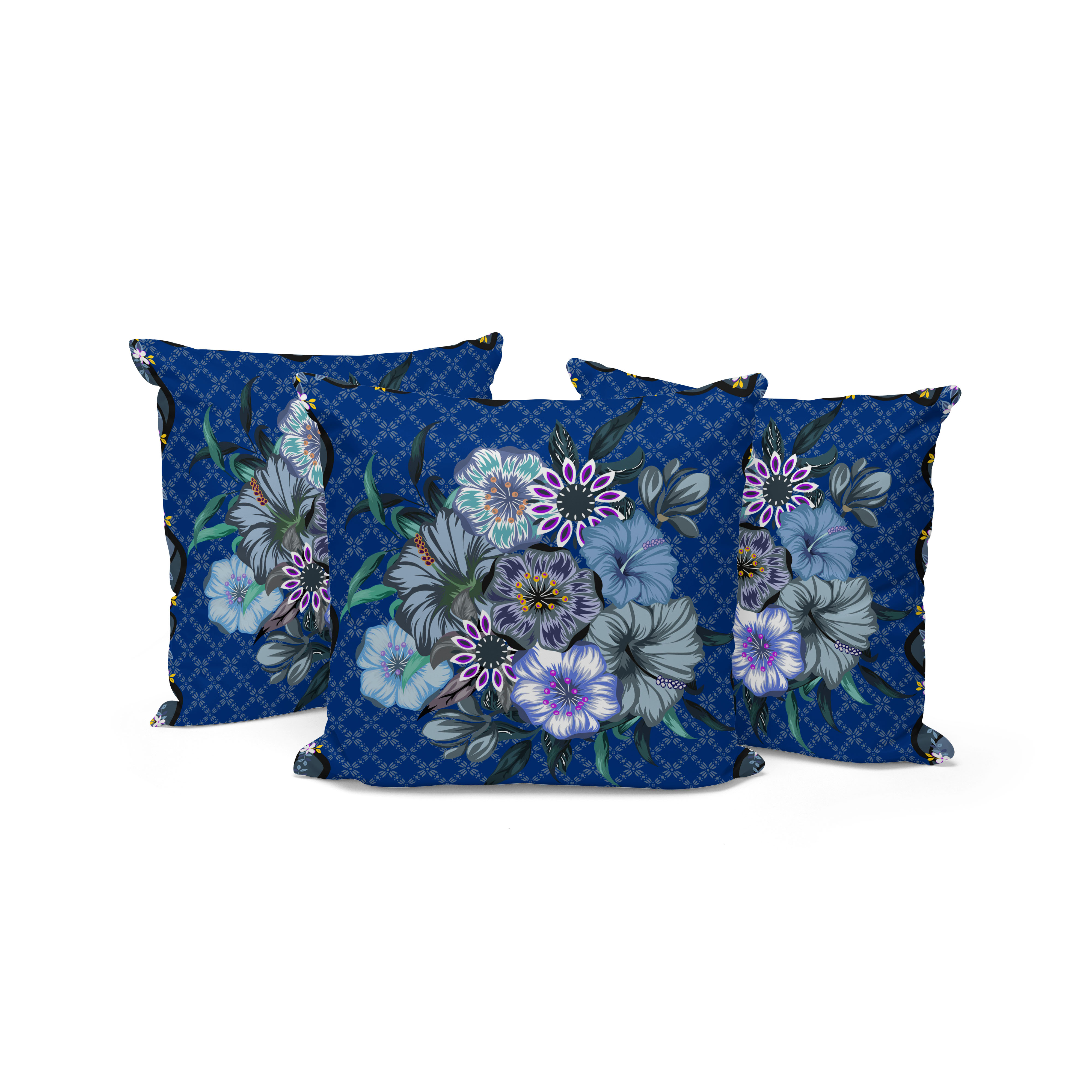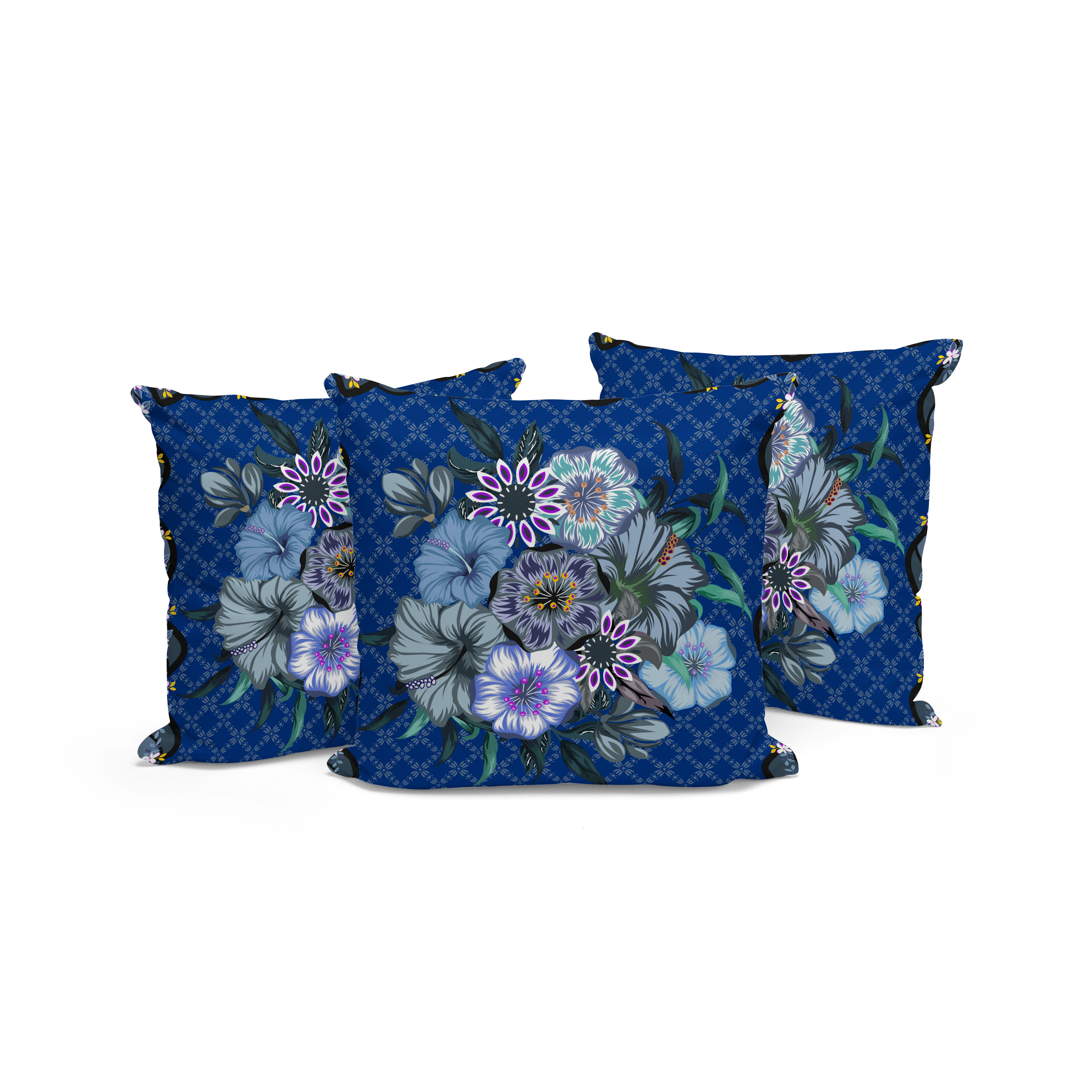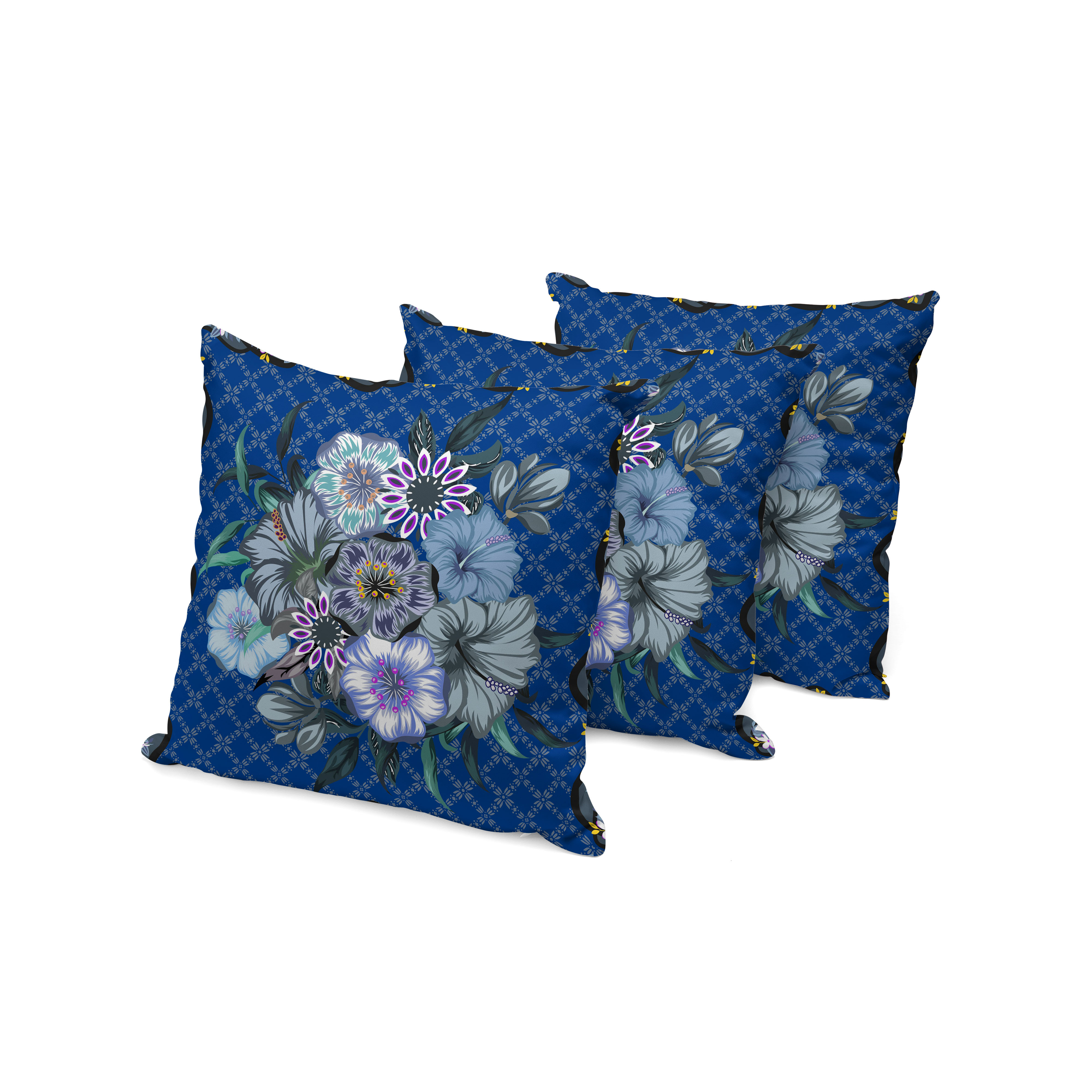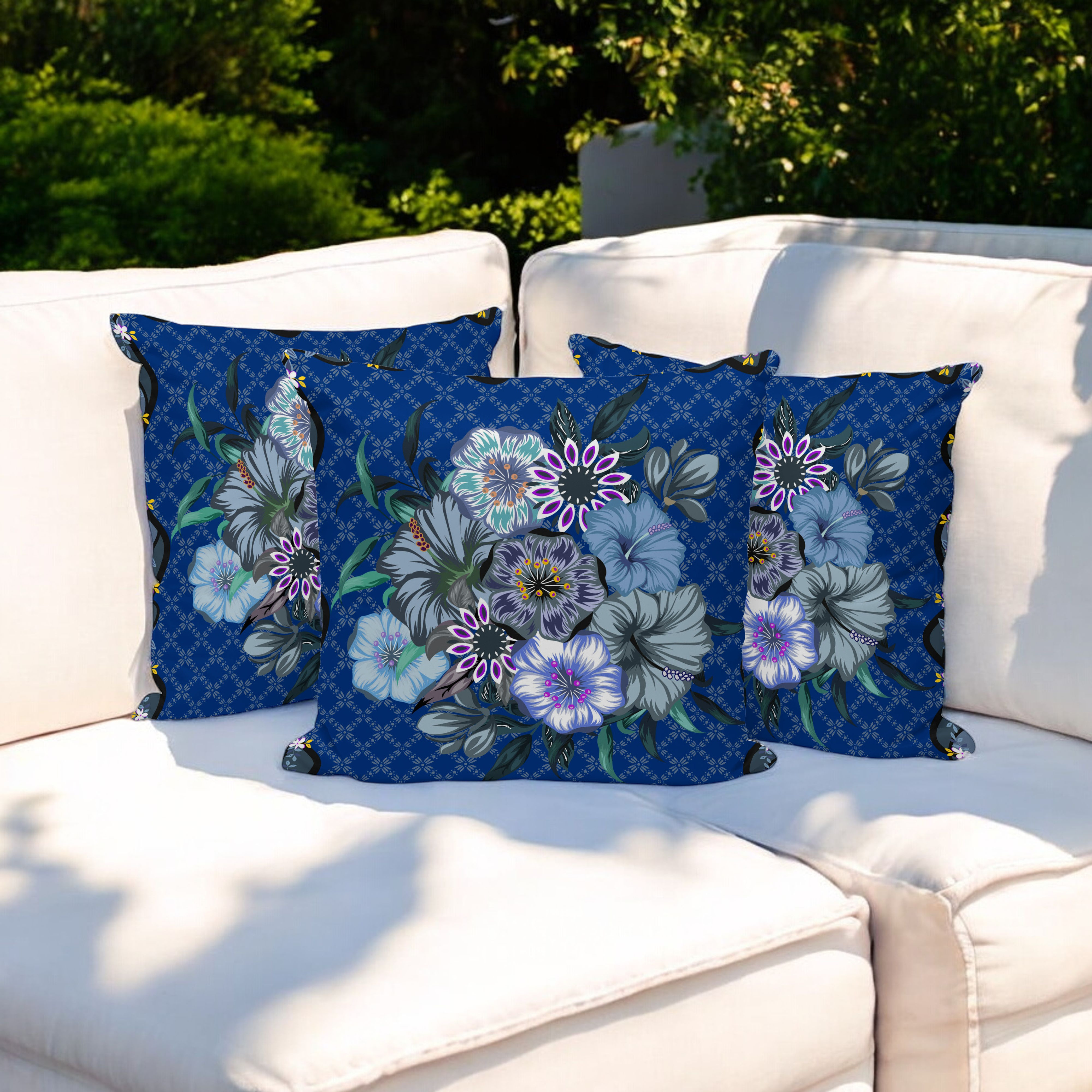 Set of Three Blue Botanical Indoor Outdoor Throw Pillow