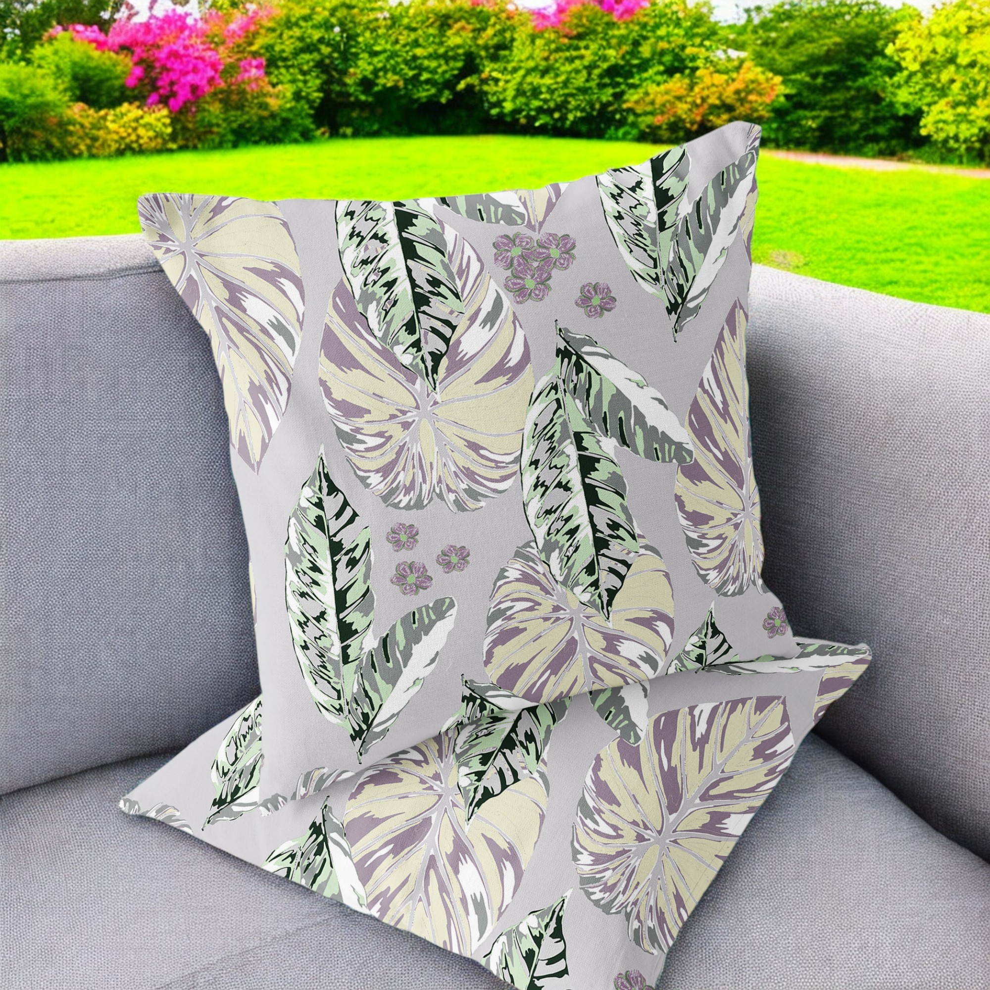Tropics Indoor/Outdoor Set of 2 Pillows in Purple on Muted Gray