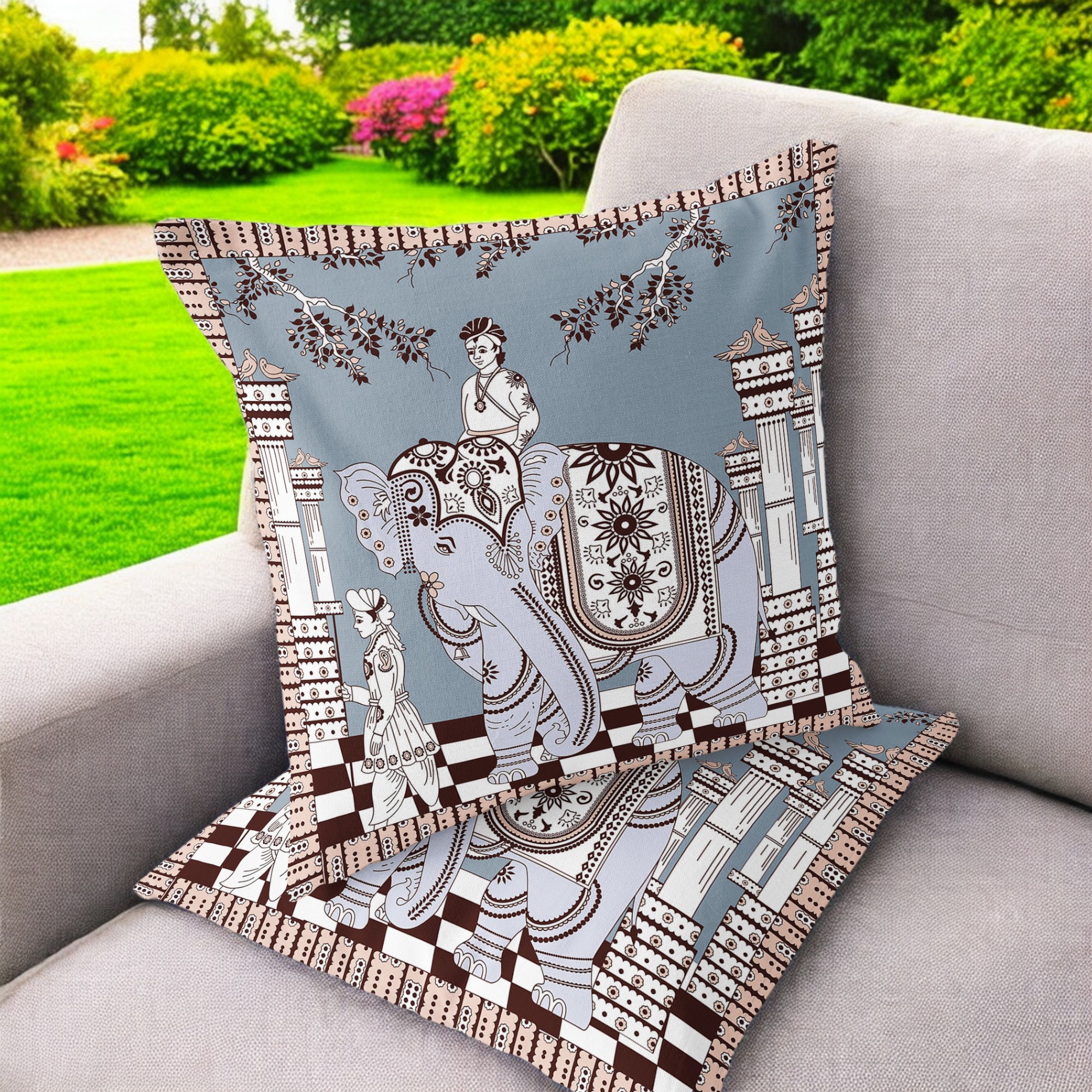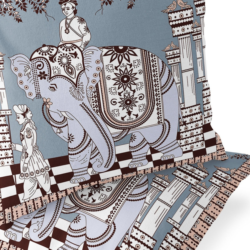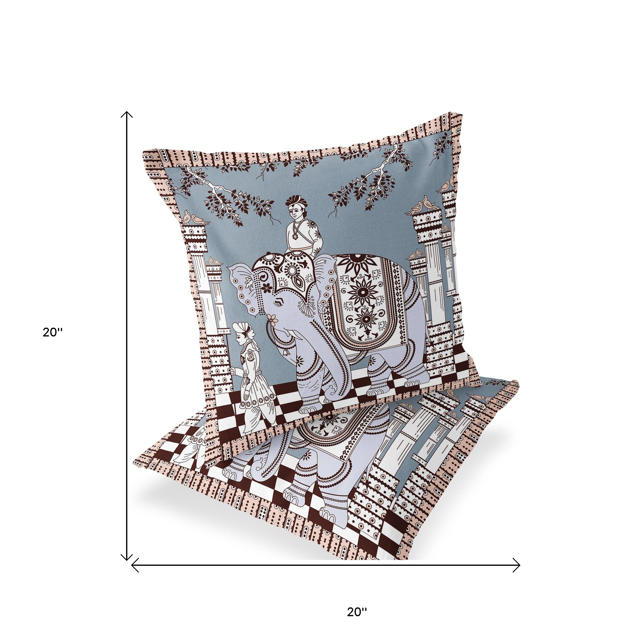 Palace Elephant Indoor/Outdoor Set of 2 Pillows in Light Blue on Muted Brown