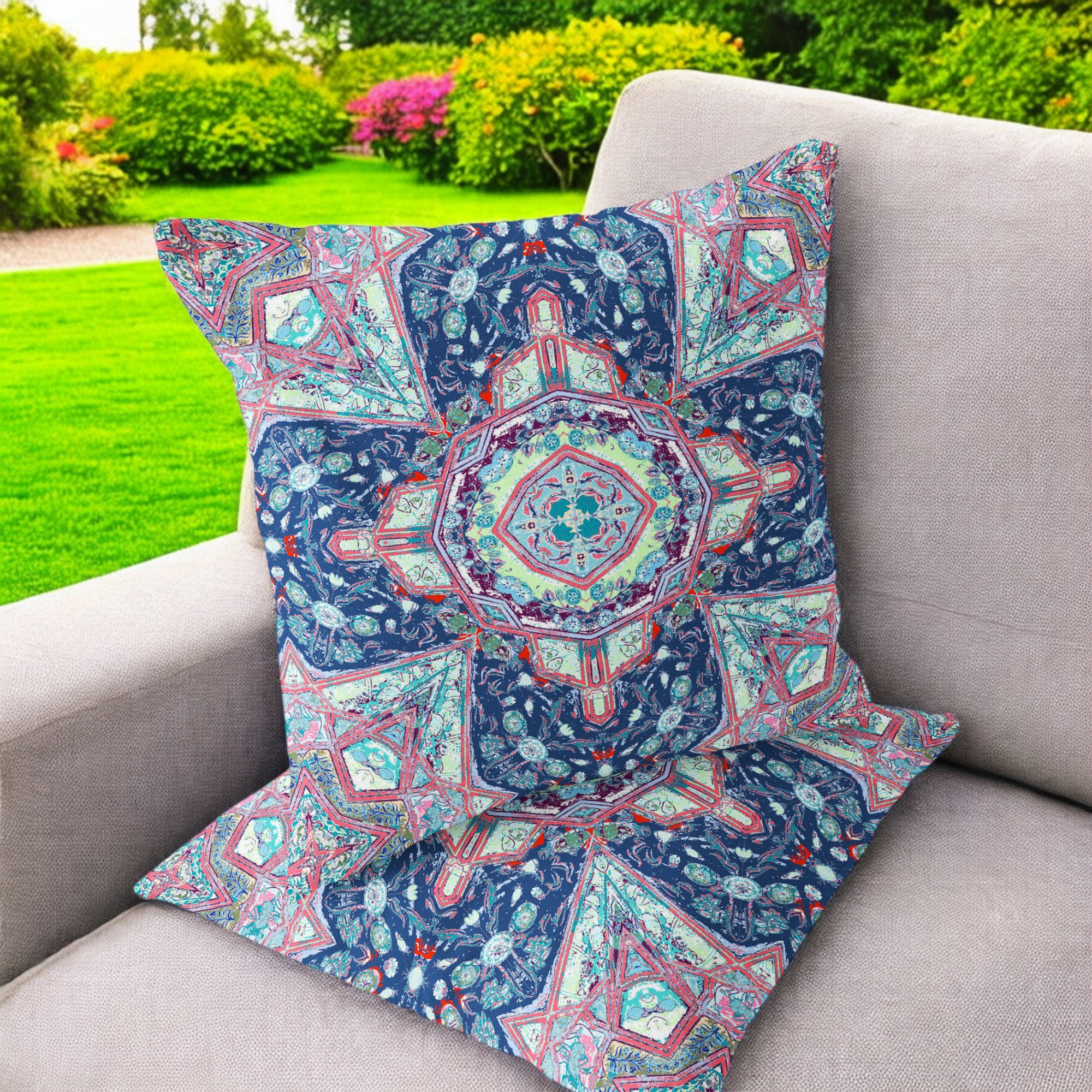Buddha Flower Ceremony Indoor/Outdoor Set of 2 Pillows in Blue Light Blue Pink