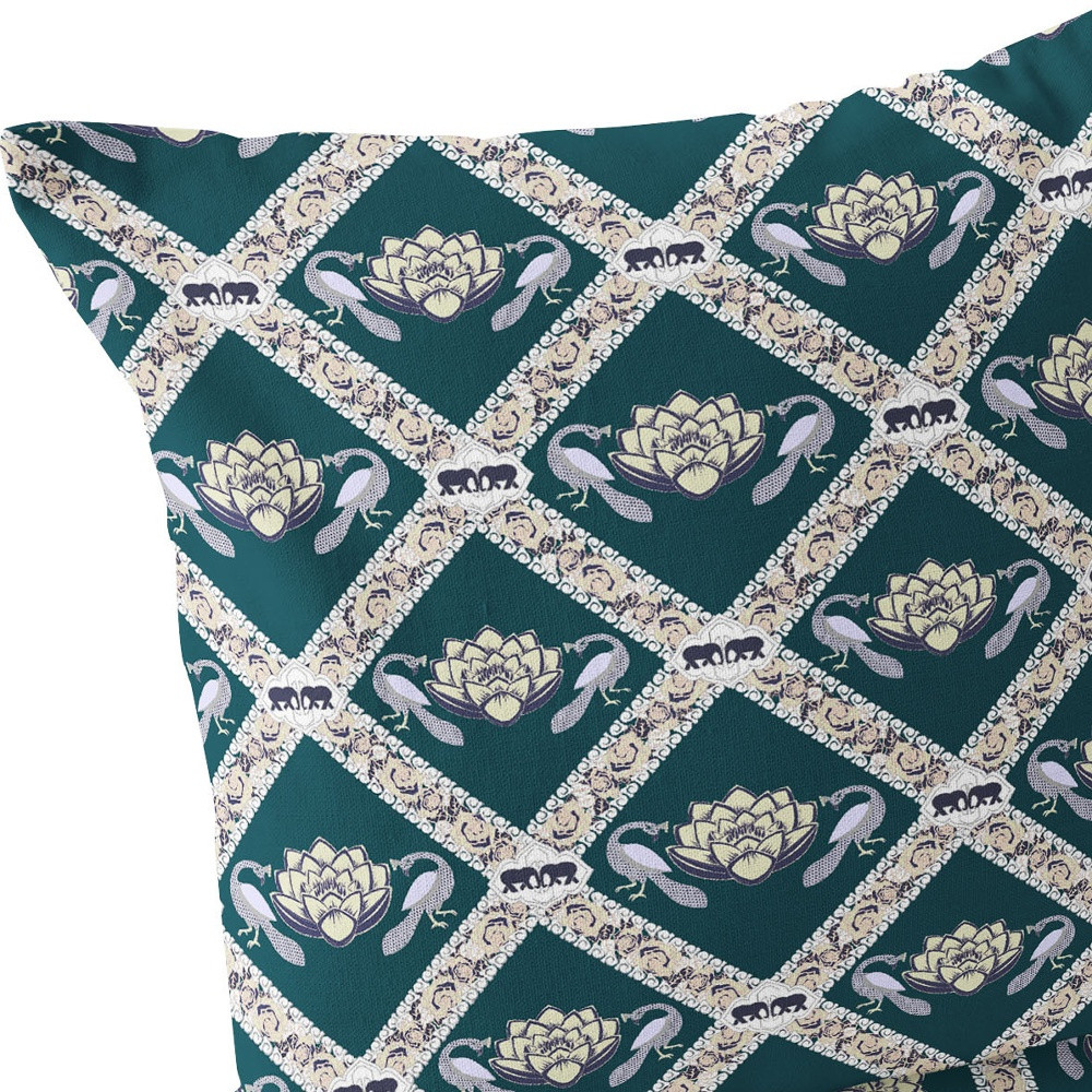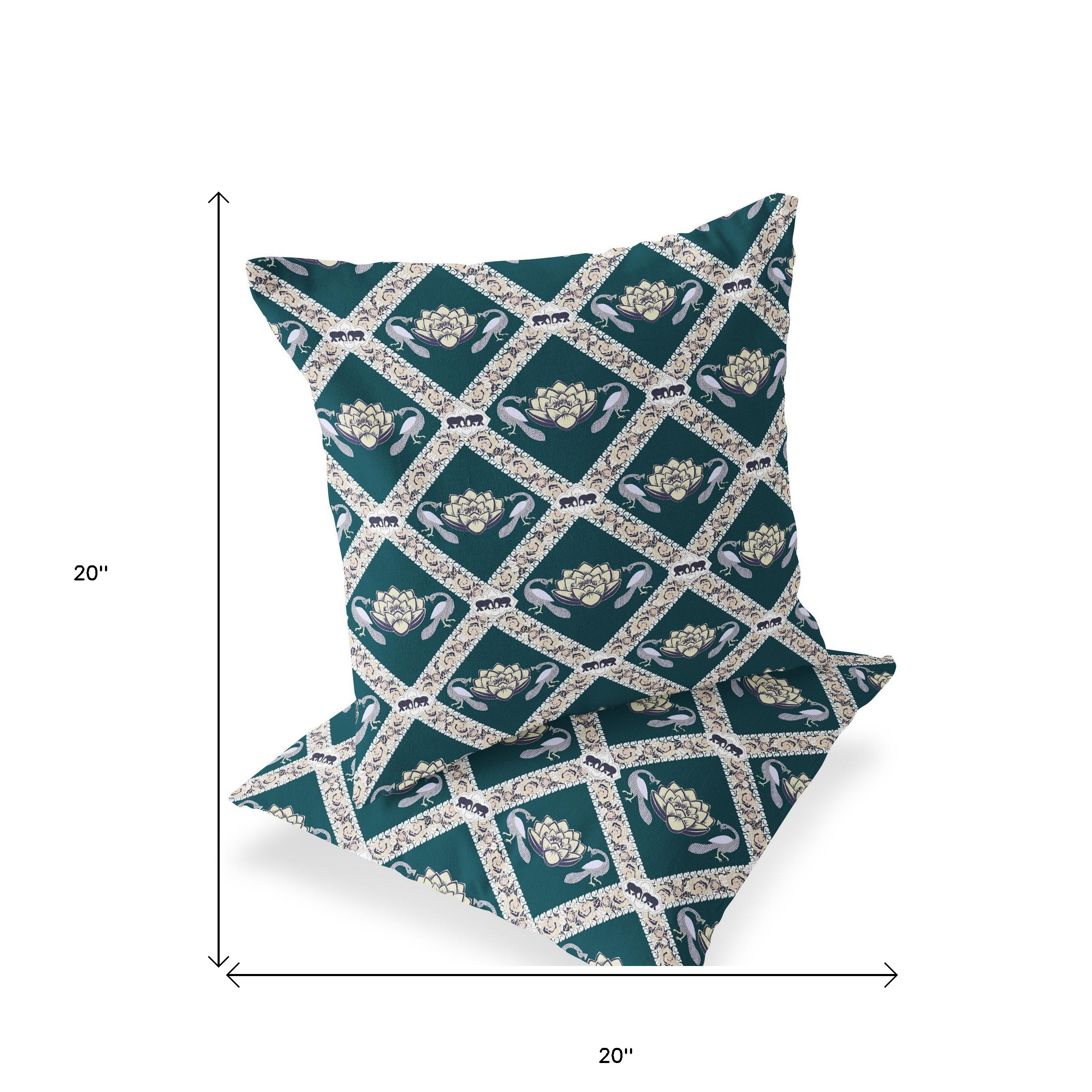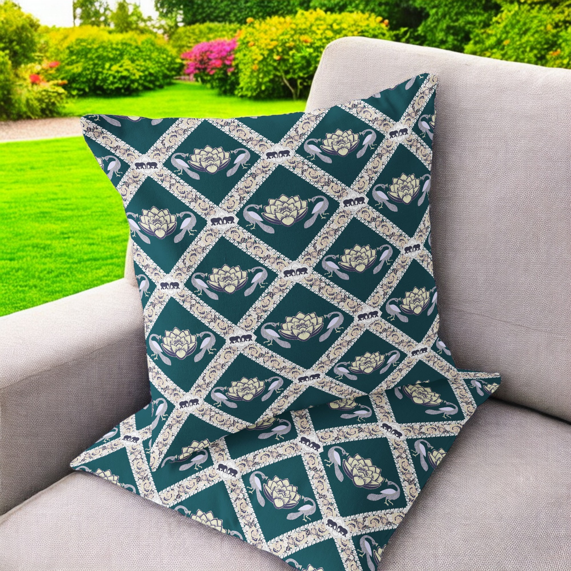Lotus Peacock Rose Indoor/Outdoor Set of 2 Pillows in Dark Green Yellow Gray