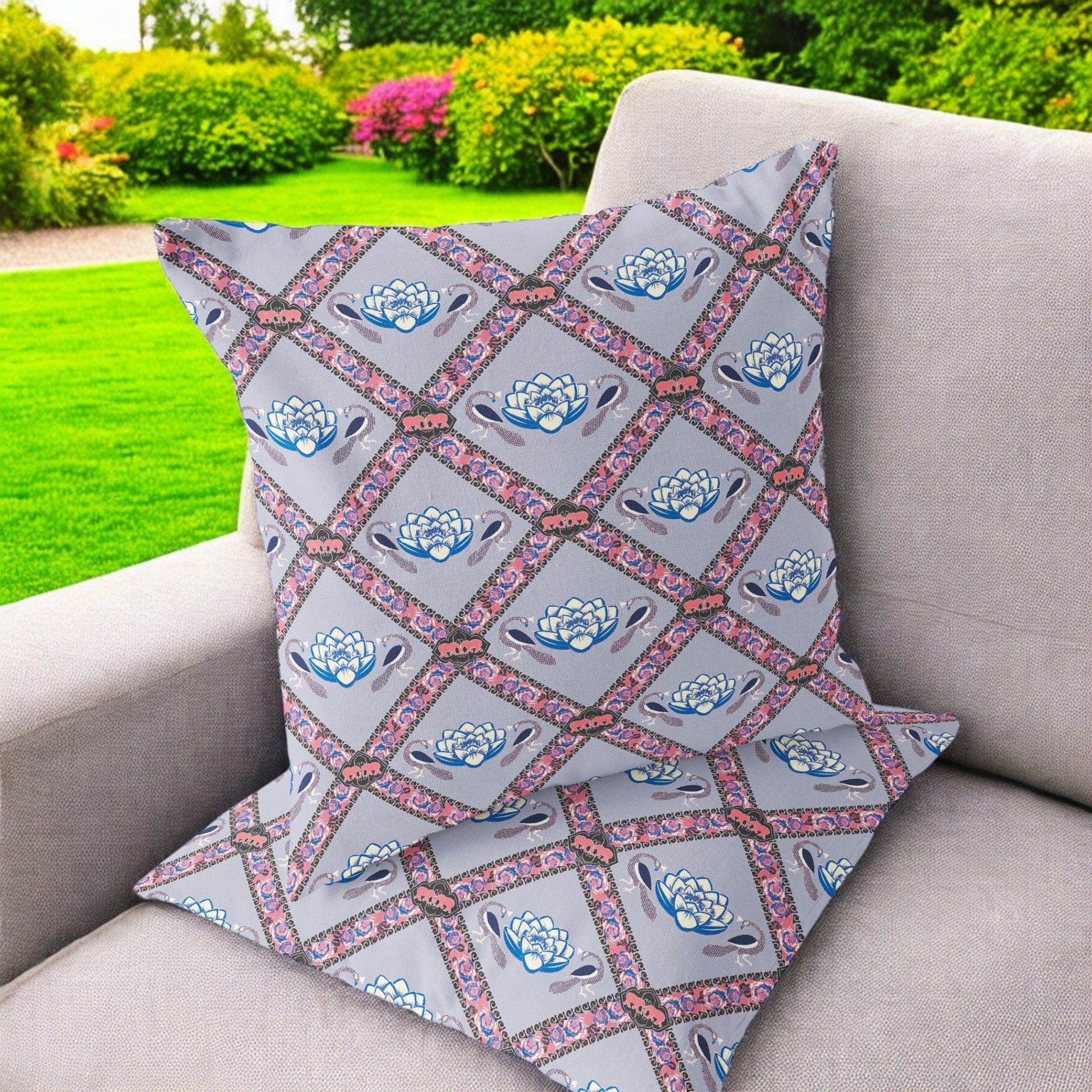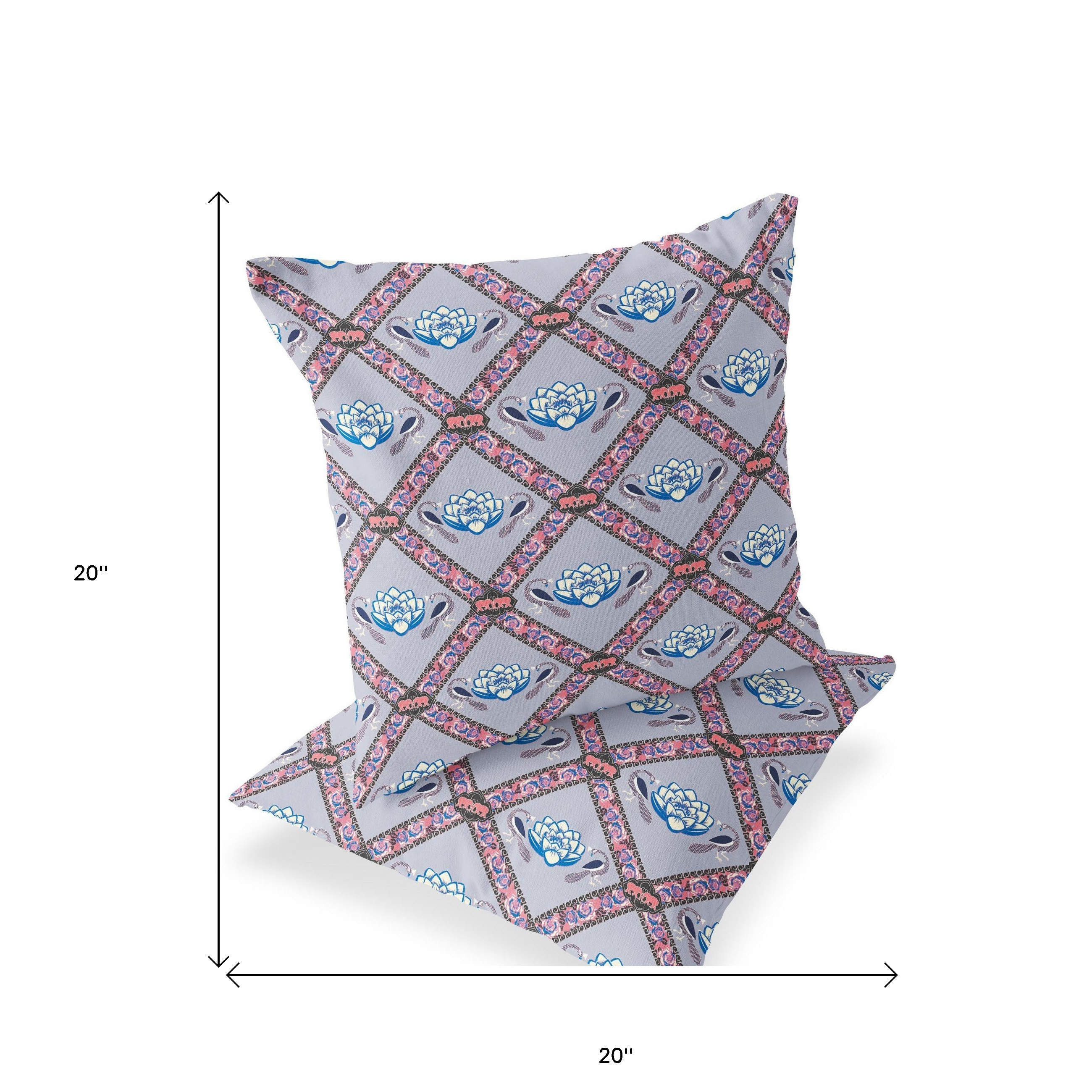Lotus Peacock Rose Indoor/Outdoor Set of 2 Pillows in Gray Blue Pink