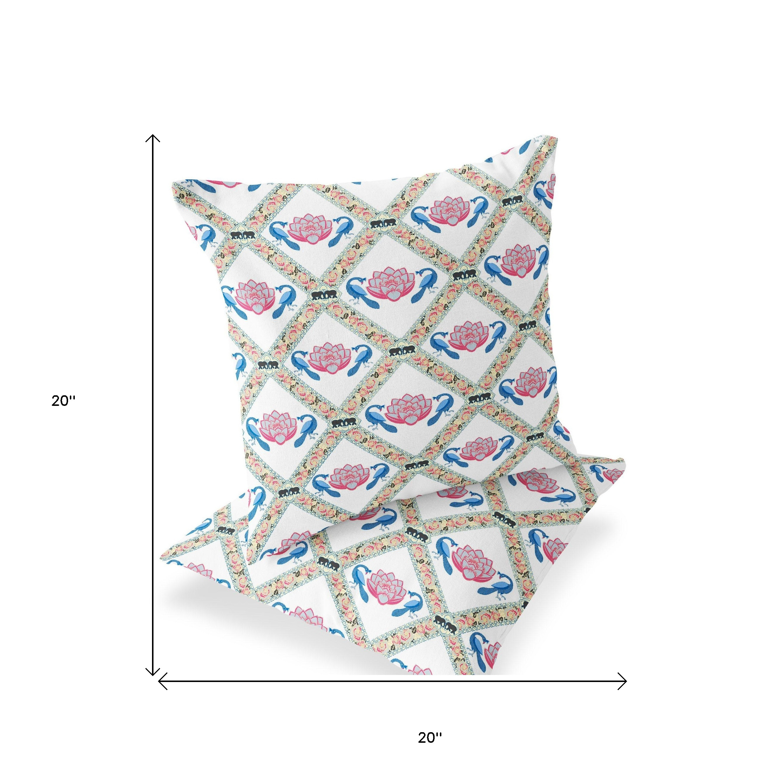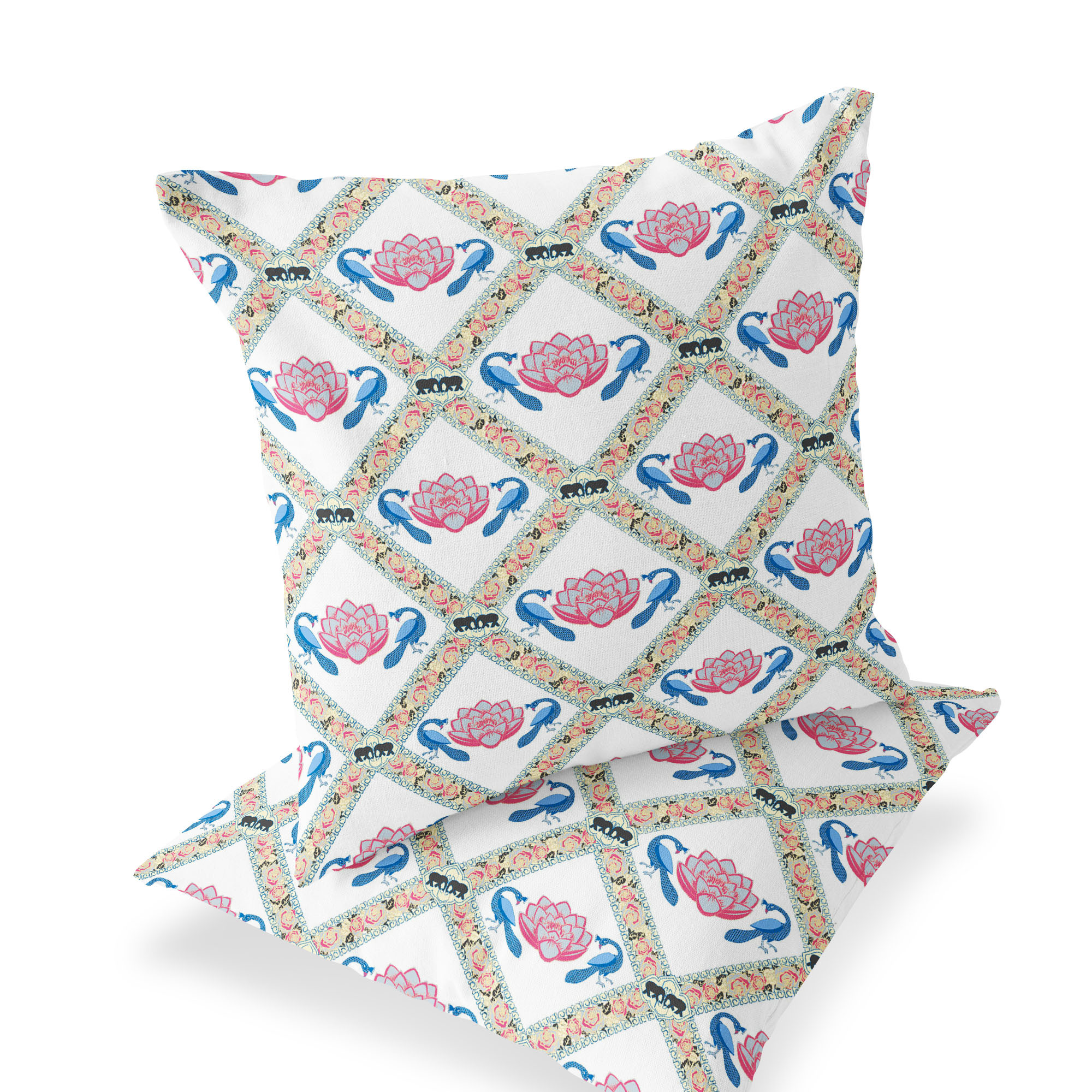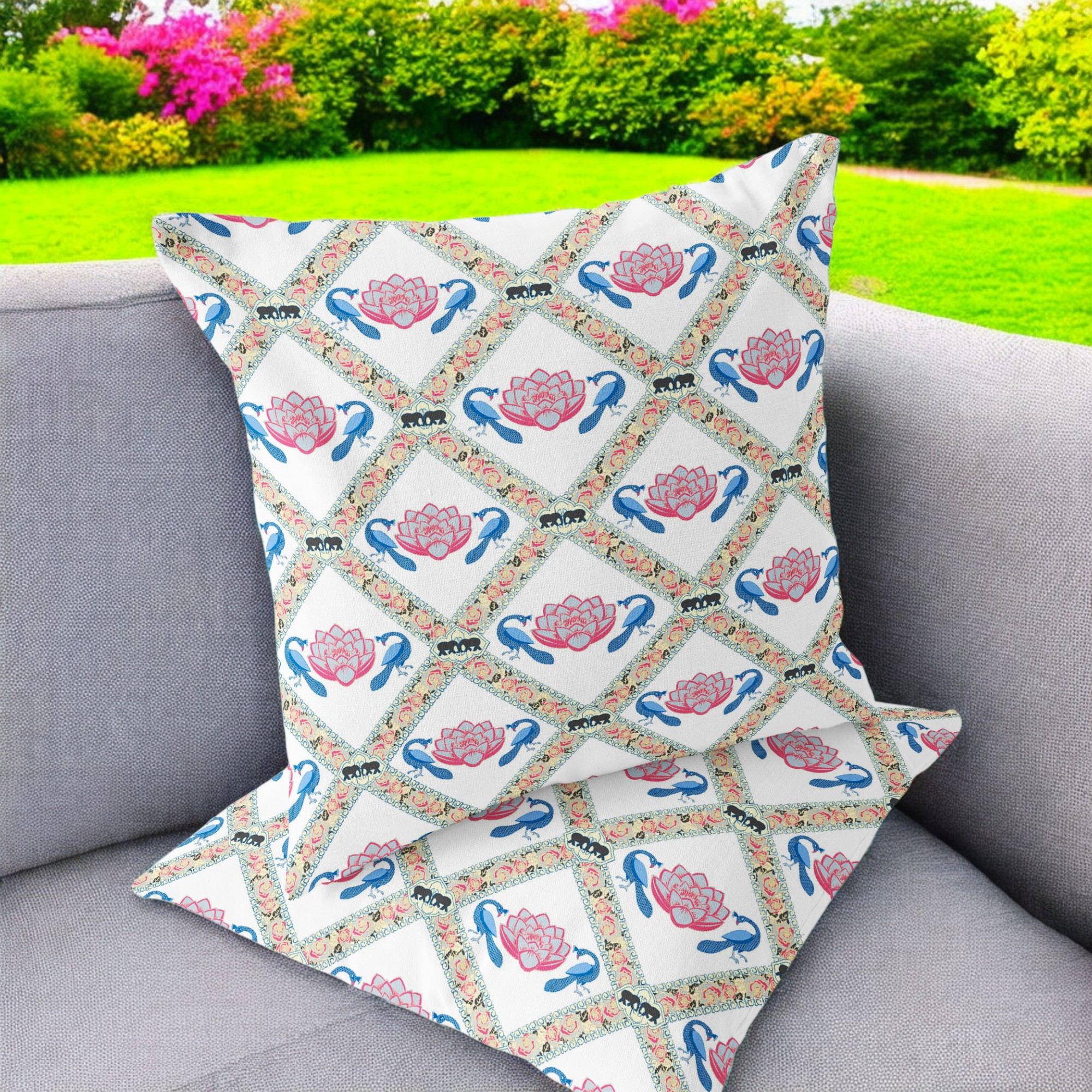 Lotus Peacock Rose Indoor/Outdoor Set of 2 Pillows in White Blue Gray