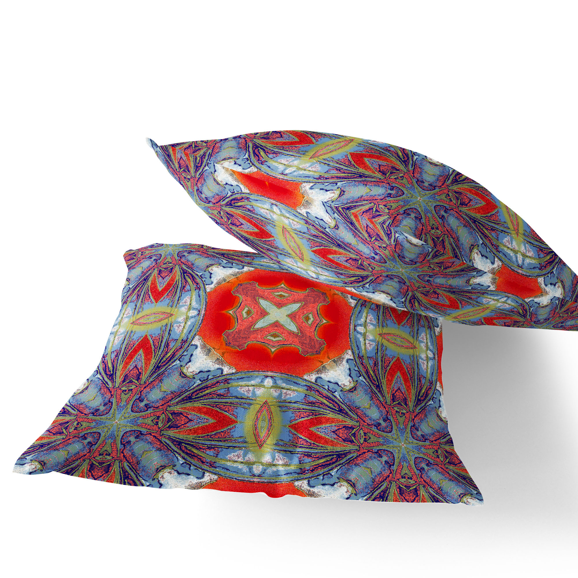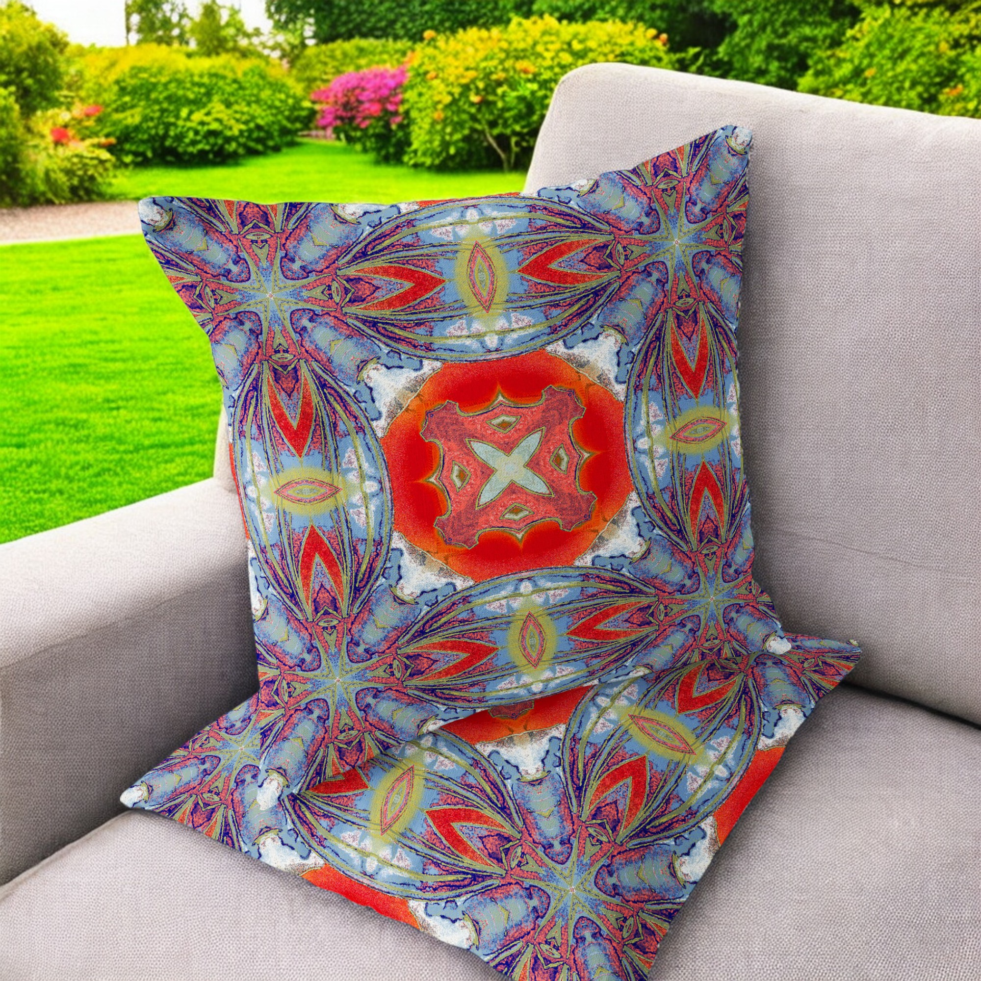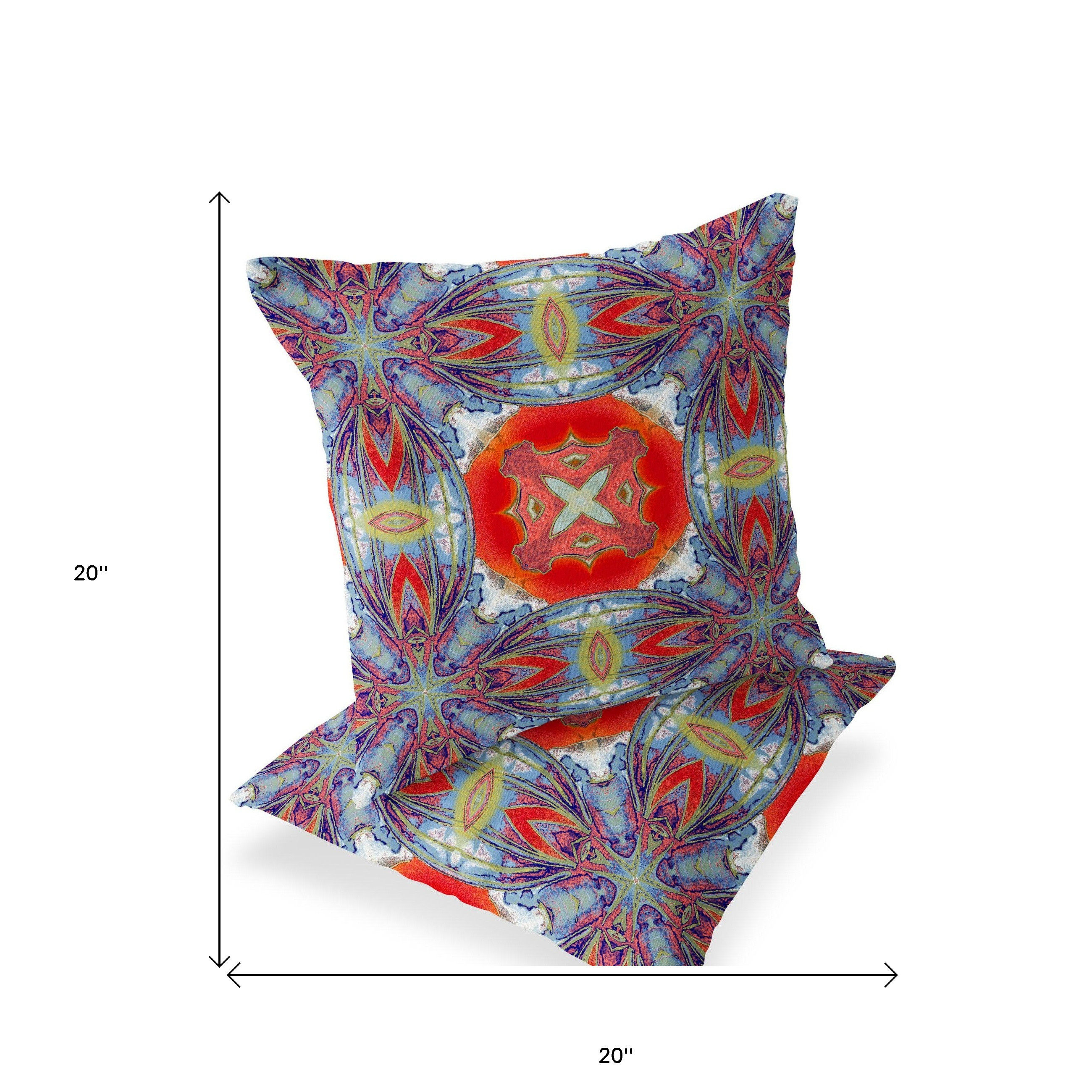 Pastel Floral Squares Indoor/Outdoor Set of 2 Pillows in Muted Blue Hot Orange