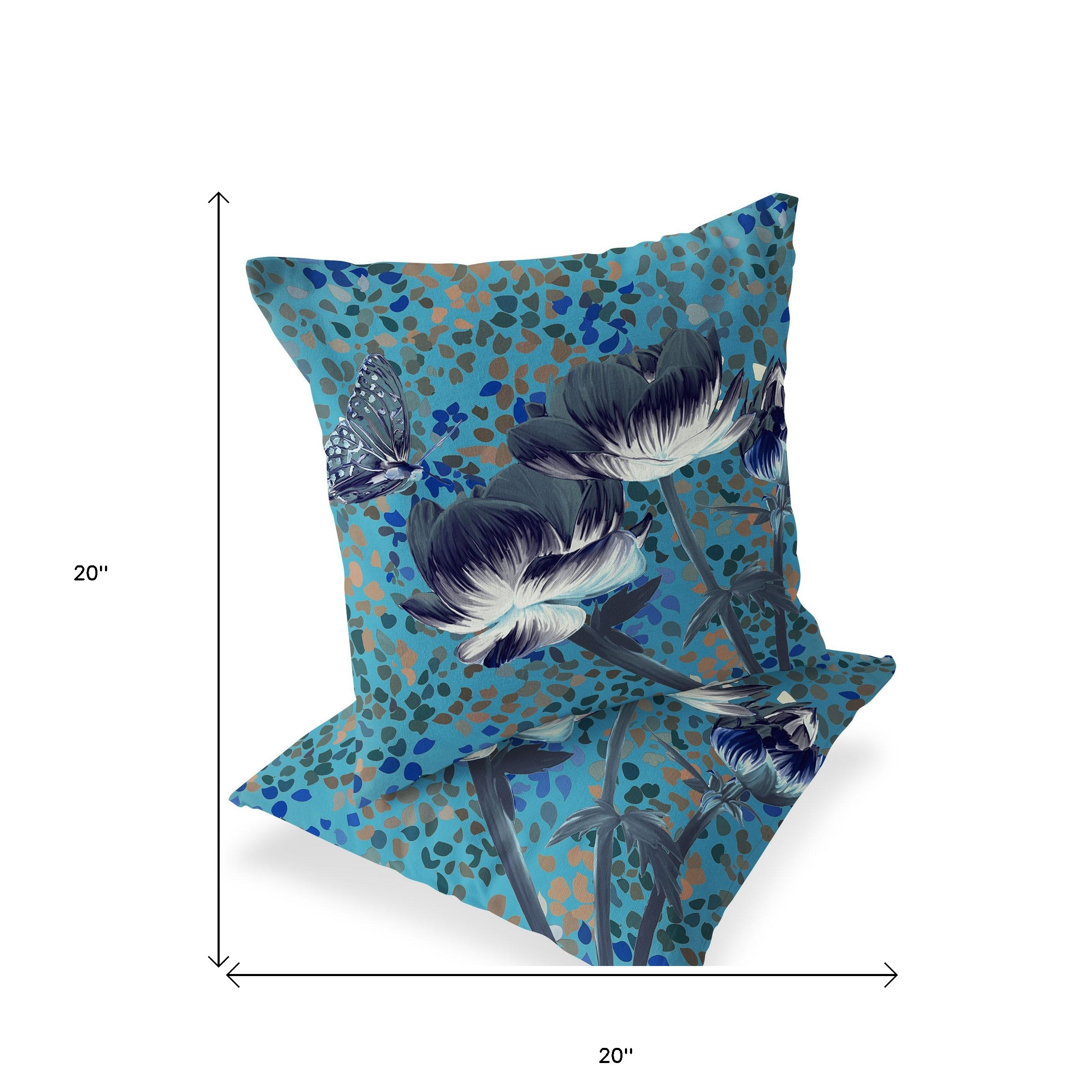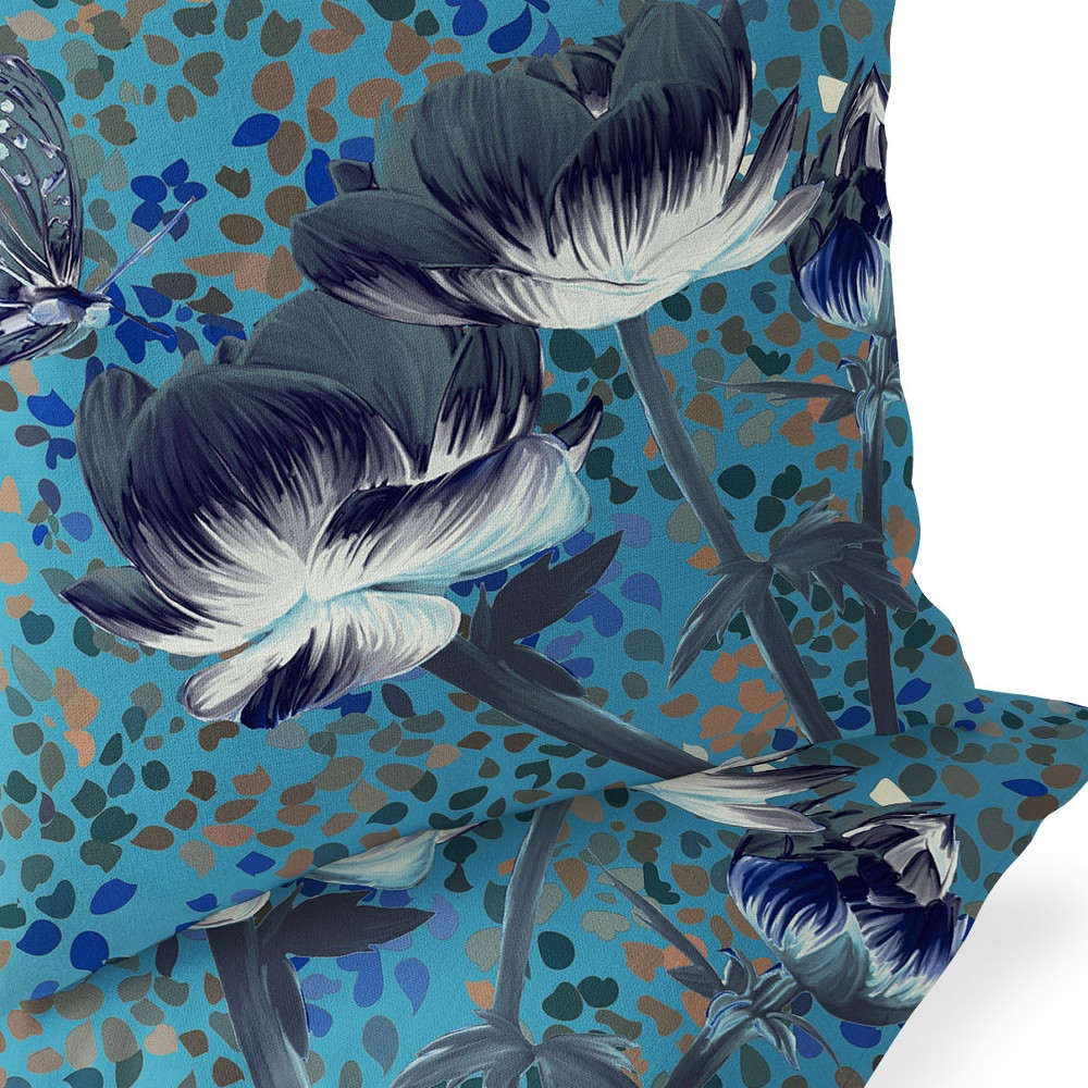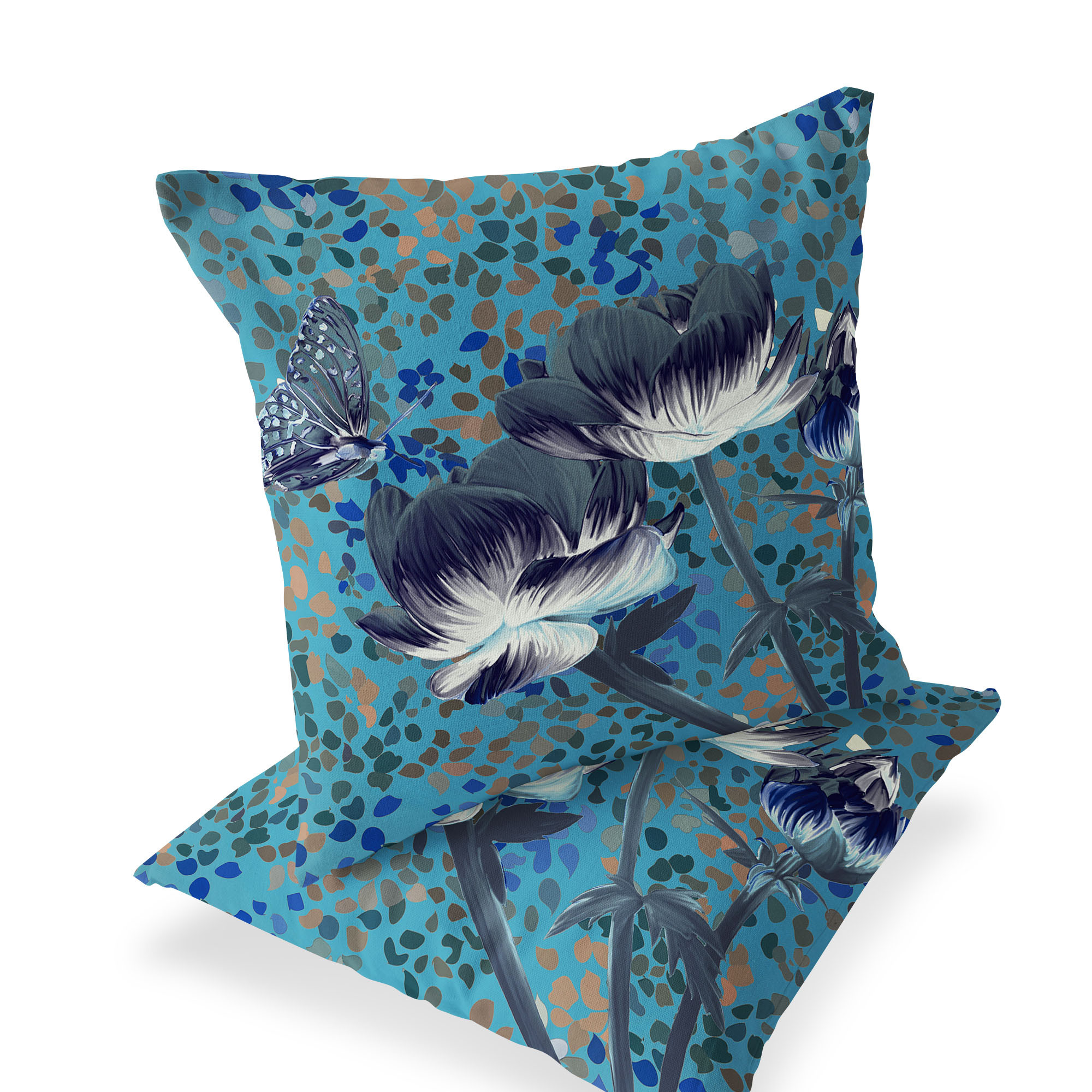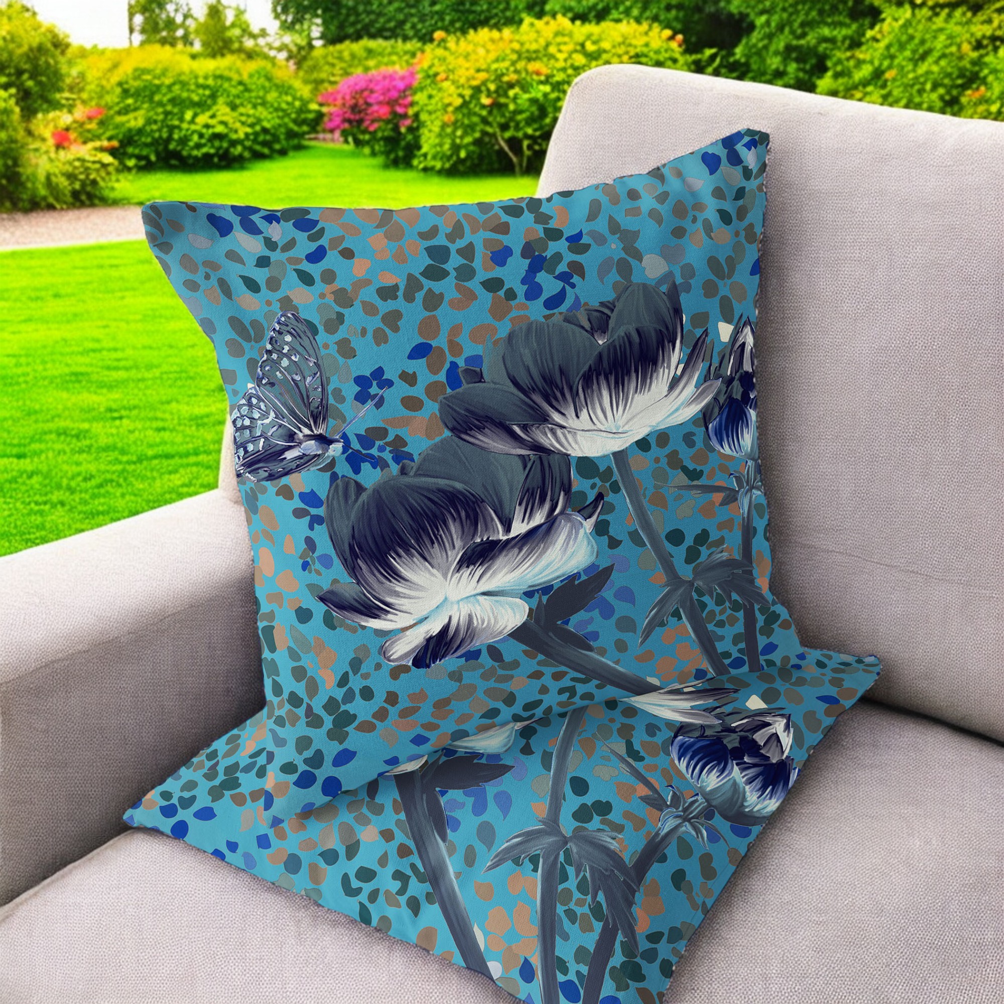 Three Roses with Butterfly Indoor/Outdoor Set of 2 Pillows in Green White Sea Blue